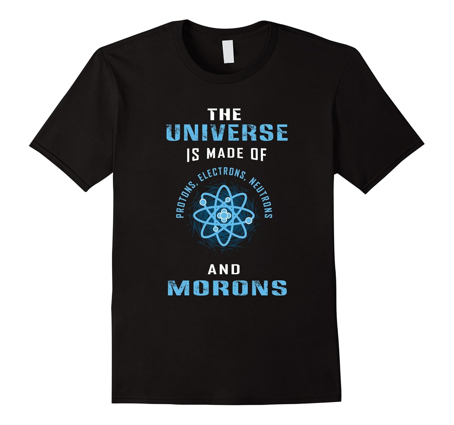 Solid colors: 100% Cotton; Heather Grey: 90% Cotton, 10% Polyester; All Other Heathers: 65% Cotton, 35% Polyester, Imported, Machine wash cold with like colors, dry low heat, Burst some laughter in this Funny Science Joke And Saying T-Shirt – The Universe Is Made Of Electrons Protons Neutrons And Morons. If you”re allergic to stupidity, this tshirt is for you. Perfect for anyone who loves hilarious gags, punch lines and humor. Scientists say that everything in the universe is made of tiny atoms but they forgot to mention the obvious morons living everywhere on earth. This cool science inspired tee is a great conversation starter that will surely attract some curious attention. Lightweight, Classic fit, Double-needle sleeve and bottom hem