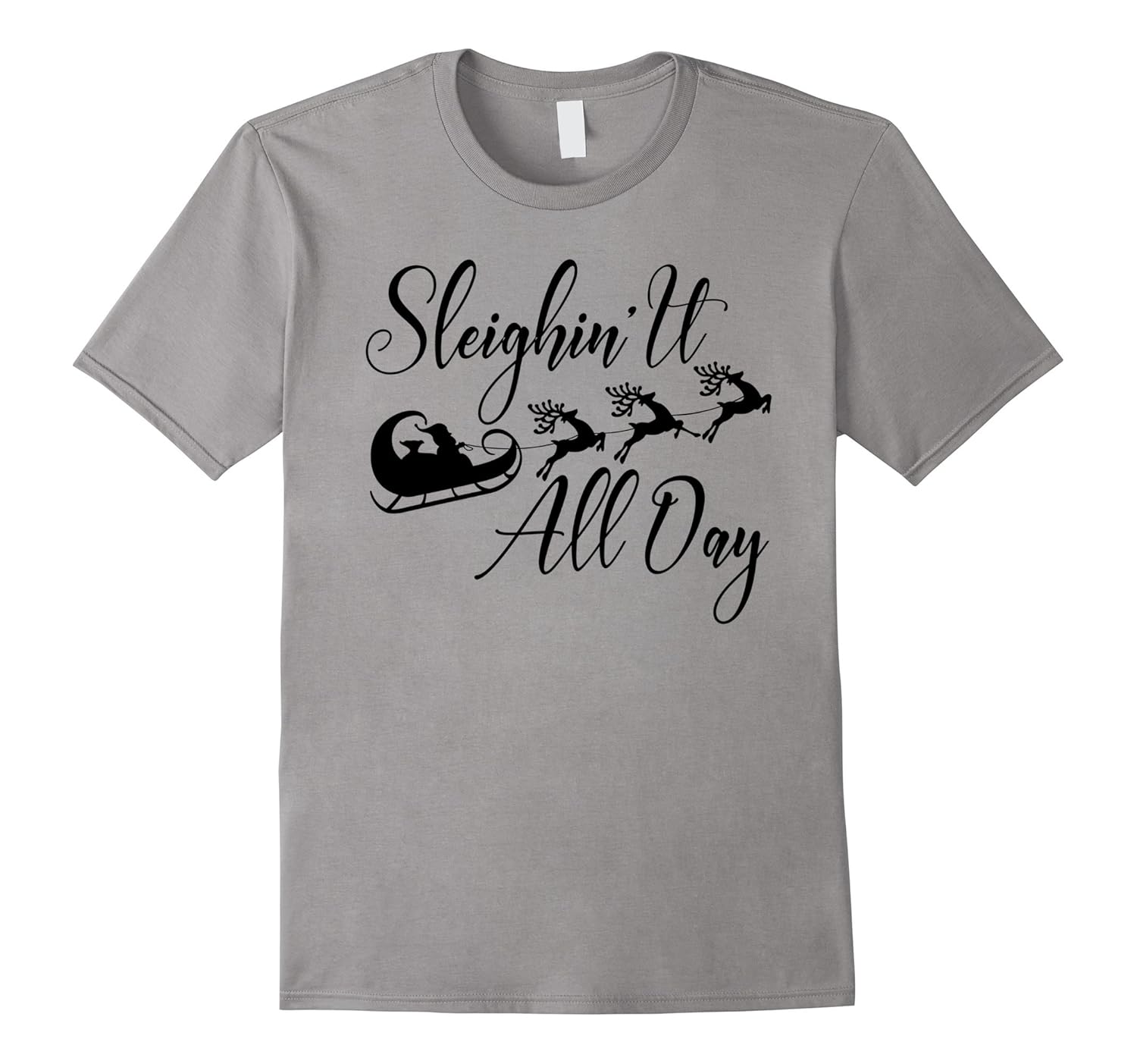 Solid colors: 100% Cotton; Heather Grey: 90% Cotton, 10% Polyester; All Other Heathers: 65% Cotton, 35% Polyester; Imported; Machine wash cold with like colors, dry low heat; Santa Sleigh Funny Sleighin It All Day Shirt; Great shirt to have some fun this Christmas season – Show your friends how your Sleighin It with this humor holiday tee. Also makes a great gift for Men, Women or Kids; Lightweight, Classic fit, Double-needle sleeve and bottom hem