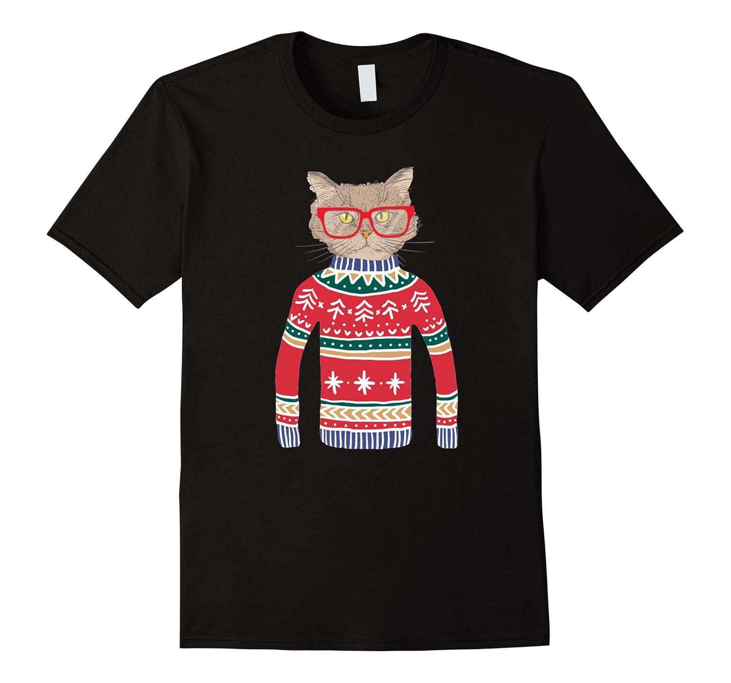 Solid colors: 100% Cotton; Heather Grey: 90% Cotton, 10% Polyester; All Other Heathers: 65% Cotton, 35% Polyester; Imported; Machine wash cold with like colors, dry low heat; The perfect funny Ugly Christmas Sweater tee shirt gift for cat lovers and owners. Wear to an ugly christmas sweater party or holiday Christmas eve or day event. Design features a cute gray kitty cat wearing eye glasses and a holiday sweater.; Also makes a great matching family cat themed clothing tee shirt. Get one for mom, dad, boy, girl, even the crazy cat lady. If you love cats, pets and animals, youll love this humorous kitten shirt perfect for a white elephant gift exchange.; Lightweight, Classic fit, Double-needle sleeve and bottom hem
