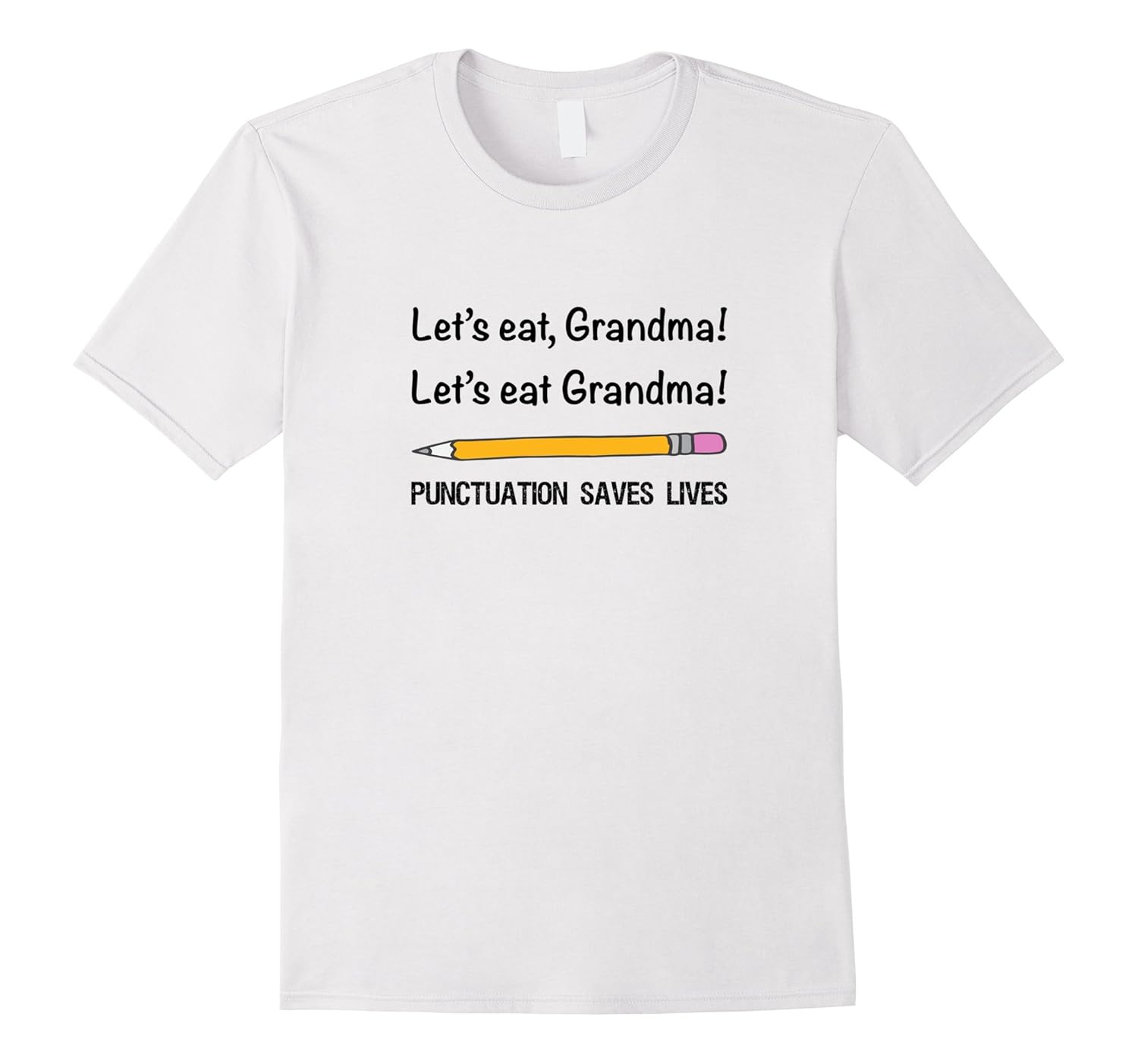 Solid colors: 100% Cotton; Heather Grey: 90% Cotton, 10% Polyester; All Other Heathers: 65% Cotton, 35% Polyester; Imported; Machine wash cold with like colors, dry low heat; Lets Eat, Grandma Lets Eat Grandma! Punctuation Saves Lives – Funny punctuation and comma teacher life graphic tee; Great way to show appreciation, also makes a fun gift; Lightweight, Classic fit, Double-needle sleeve and bottom hem