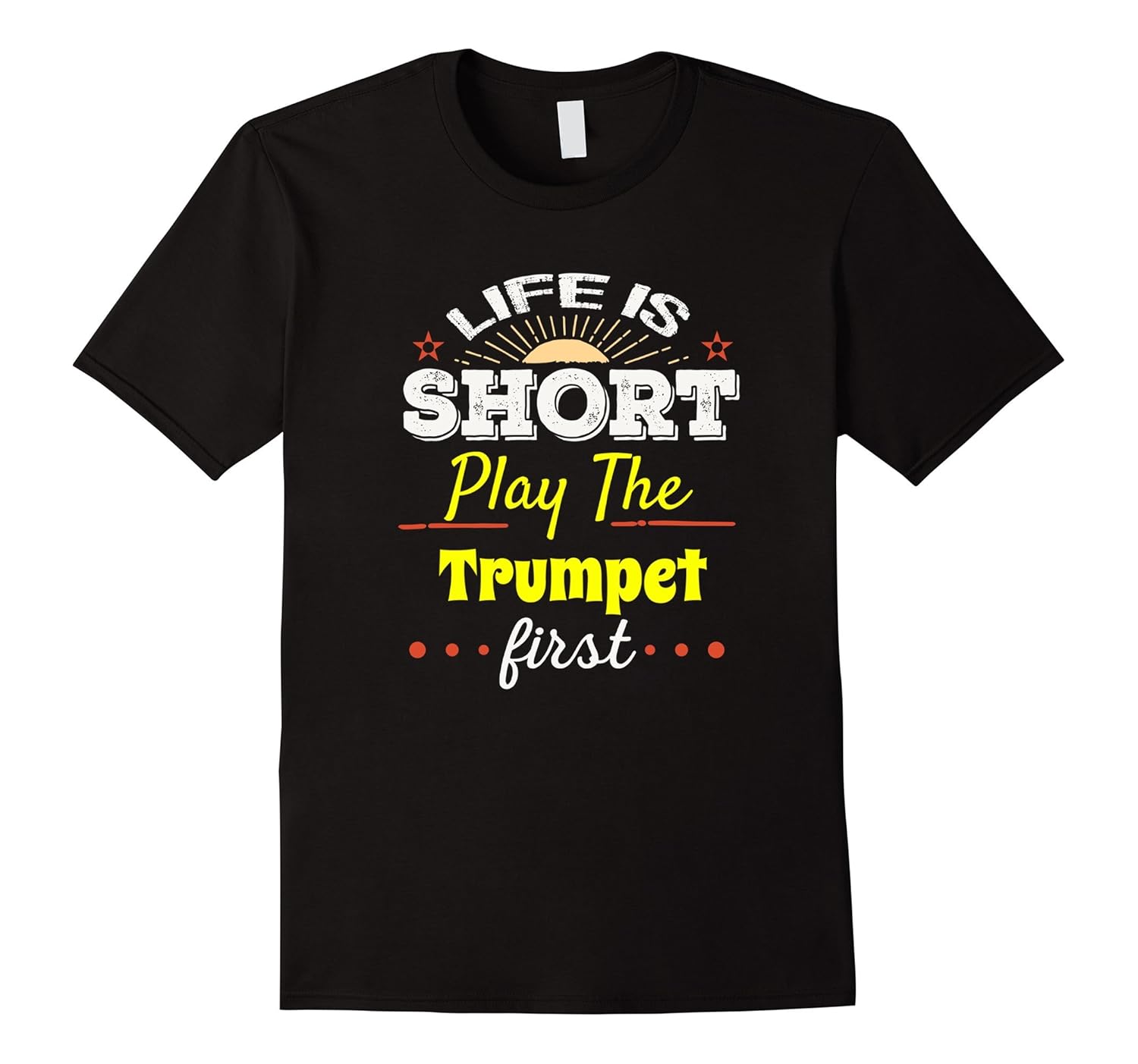 Solid colors: 100% Cotton; Heather Grey: 90% Cotton, 10% Polyester; All Other Heathers: 65% Cotton, 35% Polyester, Imported, Machine wash cold with like colors, dry low heat, This Funny Trumpet t-shirt design says Life is Short Play The Trumpet First. Perfect gift for trumpet players, trumpeters or students learning to play the instrument. If you are a fan of brass marching band instruments this is your tshirt. Put your lips embouchure to the mouthpiece and blow the horn fingering the valves to make some harmonious notes and hopefully play beautiful music while wearing your Funny Trumpet tshirt to band practice. Lightweight, Classic fit, Double-needle sleeve and bottom hem