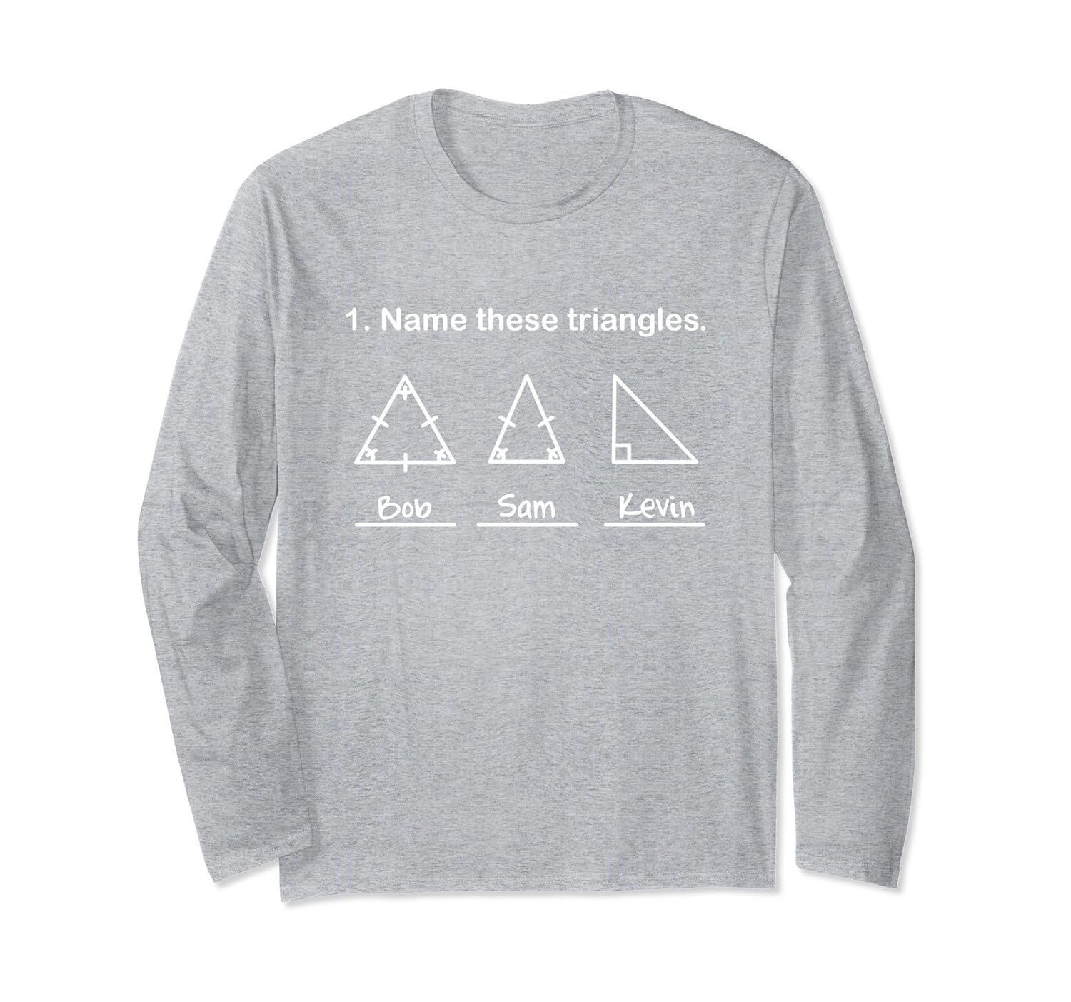 Solid colors: 100% Cotton; Heather Grey: 90% Cotton, 10% Polyester; All Other Heathers: 50% Cotton, 50% Polyester; Imported; Machine wash cold with like colors, dry low heat; This is the perfect funny shirt for any nerd or geek who love math humor, silly problems Andamp; triangles. The real answer for this question is equilateral, isosceles and right. Naming them Bob, Sam and Kevin is what clever kid would call them.; Wear it proudly to the math club, school or to the library. It also makes a cute gift for those that love humorous sayings or geometry humor. Inspired by those internet memes of clever test answers from smart kids.; Lightweight, Classic fit, Double-needle sleeve and bottom hem