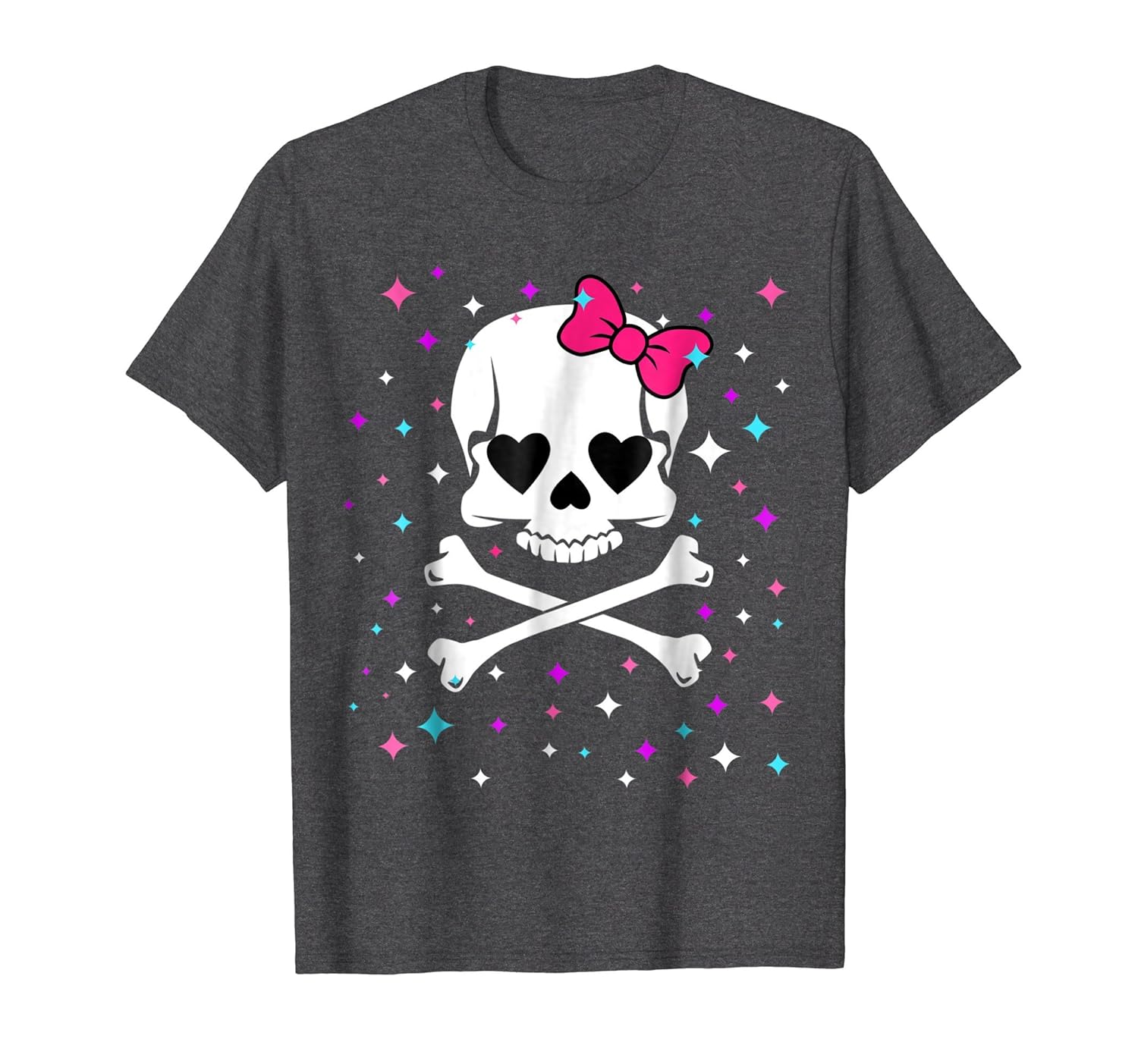 Solid colors: 100% Cotton; Heather Grey: 90% Cotton, 10% Polyester; All Other Heathers: 50% Cotton, 50% Polyester; Imported; Machine wash cold with like colors, dry low heat; This cute skull and crossbones t-shirt for girls features a cute woman skull with a bow, and heart shaped eyes and nose. This cute Halloween t-shirt for girls makes a great gift for daughters, nieces, granddaughters, girlfriends, aunts, Andamp; grandmas.; This skull and crossbones girls Halloween shirt is a funny Halloween shirt for girls who like ghosts, witches, zombies, mummies, ghouls, bats, and spiders! This funny skull and crossbones shirt is a funny Halloween shirt for girls and looks cute, too!; Lightweight, Classic fit, Double-needle sleeve and bottom hem