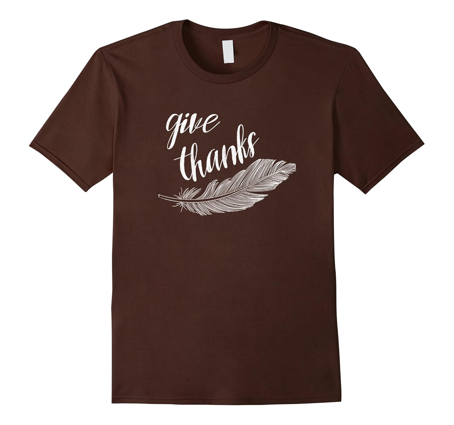Solid colors: 100% Cotton; Heather Grey: 90% Cotton, 10% Polyester; All Other Heathers: 65% Cotton, 35% Polyester; Imported; Machine wash cold with like colors, dry low heat; Turkey feather give thanks distressed Thanksgiving day tee shirt. The perfect holiday tshirt to add to your Thanksgiving outfit.; A great Fall Thanksgiving or Christmas day gift idea for women and girls.; Lightweight, Classic fit, Double-needle sleeve and bottom hem