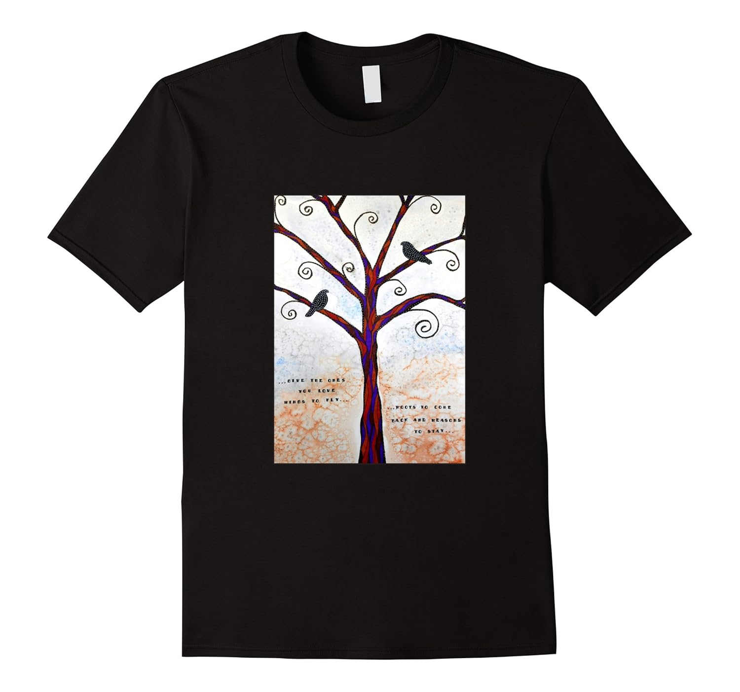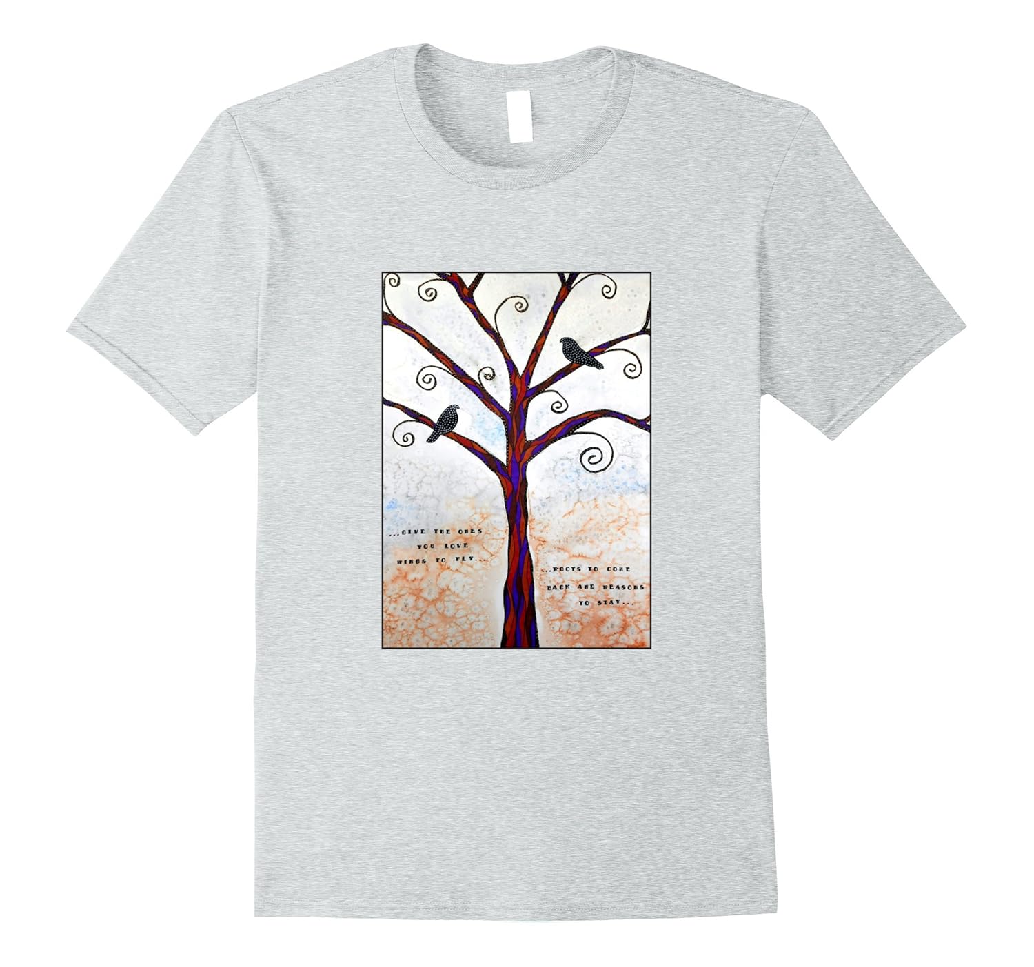 Solid colors: 100% Cotton; Heather Grey: 90% Cotton, 10% Polyester; All Other Heathers: 65% Cotton, 35% Polyester, Imported, Machine wash cold with like colors, dry low heat, Geniene Functional Art by Tia Riva inspirational artwork t-shirt, Give the ones you love the wings to fly…roots to come back…and reasons to stay inspirational t-shirt, Lightweight, Classic fit, Double-needle sleeve and bottom hem