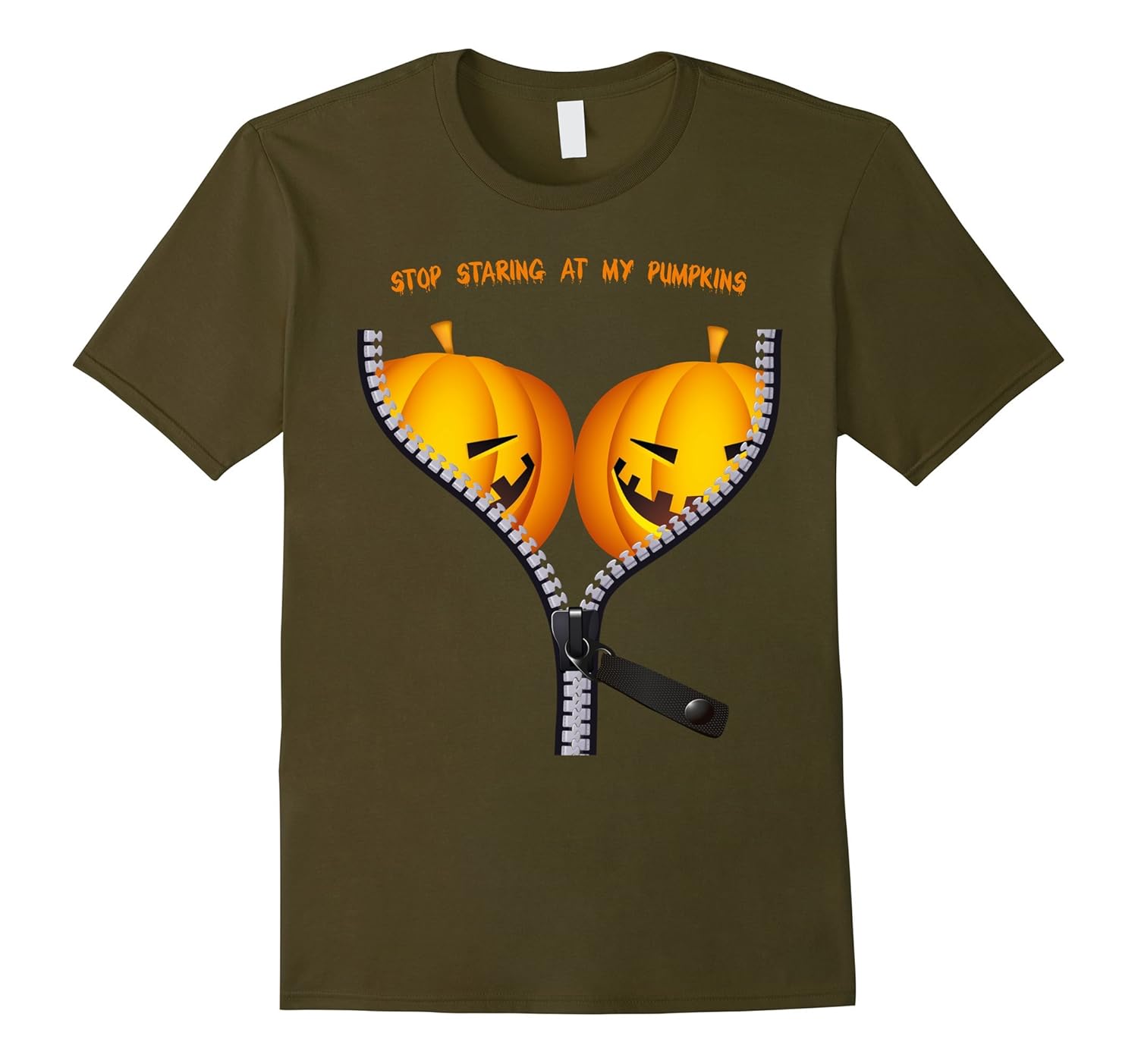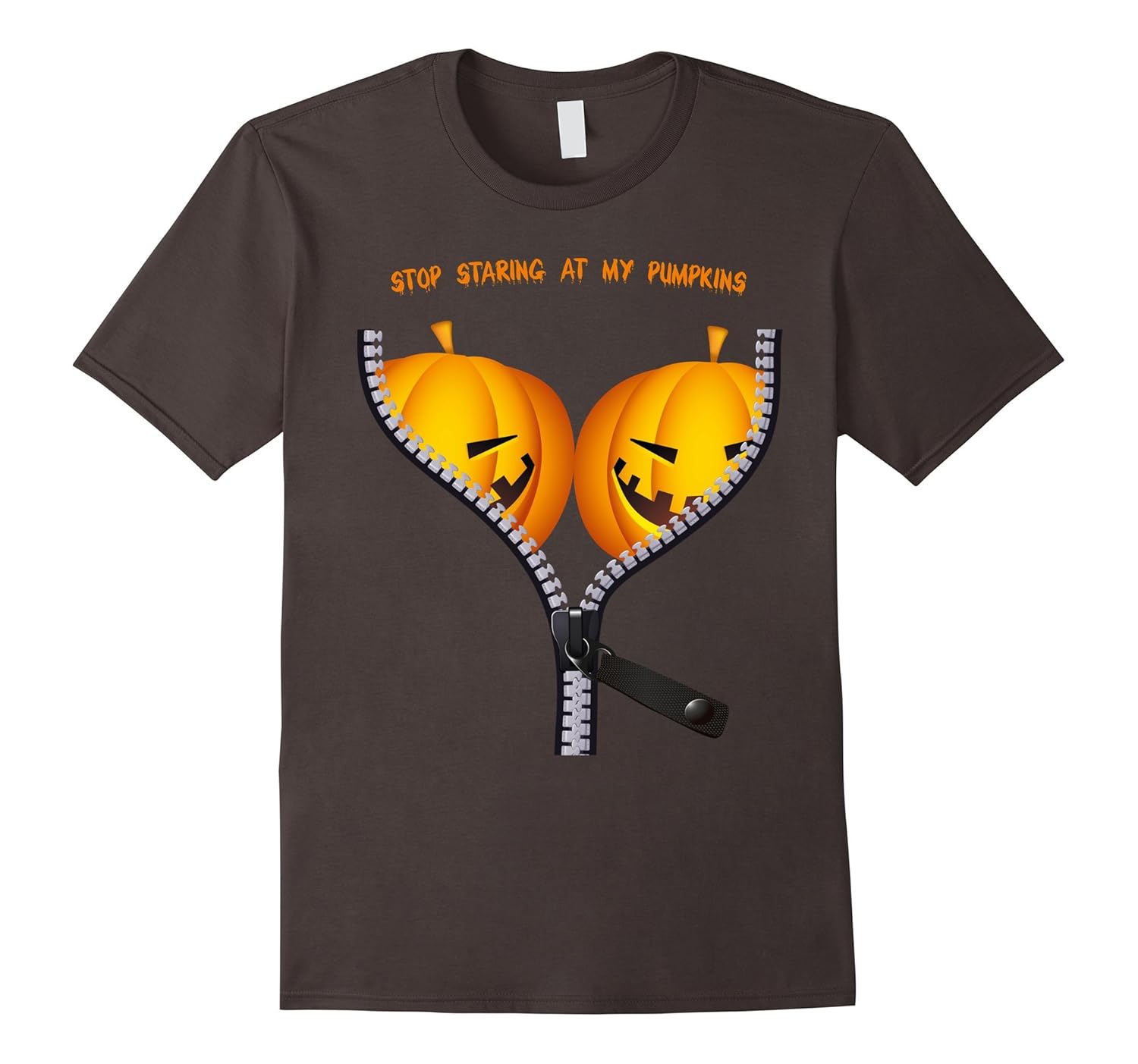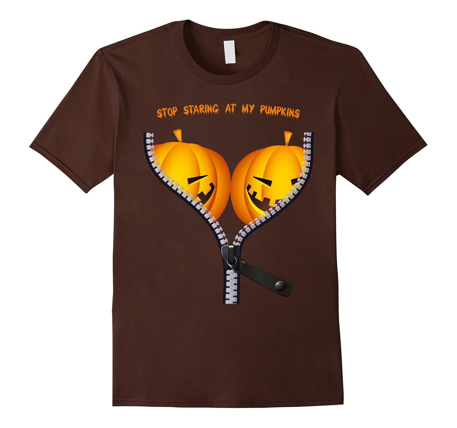 Solid colors: 100% Cotton; Heather Grey: 90% Cotton, 10% Polyester; All Other Heathers: 65% Cotton, 35% Polyester, Imported, Machine wash cold with like colors, dry low heat, This funny BOObs halloween costume will make your friends laugh at the Halloween 2017 party. This Pumpkin BOO-bs Shirt features two good lookin” pumpkins behind a zipper. Wear this pumpkin breasts tee for Halloween all over town to bring the party to life. This easy costume t-shirt with “Stop Staring At My Pumpkins” lettering is evil, spooky, scary, funny and sexy. This is a perfect gift for a woman or girl in a halloween sexy costume. Lightweight, Classic fit, Double-needle sleeve and bottom hem