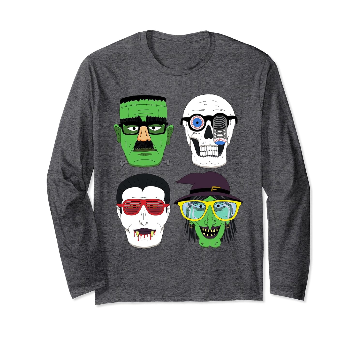 Solid colors: 100% Cotton; Heather Grey: 90% Cotton, 10% Polyester; All Other Heathers: 50% Cotton, 50% Polyester; Imported; Machine wash cold with like colors, dry low heat; Halloween Costume Funny Glasses Long-Sleeve Shirt. Monsters in Disguise long-sleeved tshirt with Frankenstein, a Witch, Dracula, and a Skull with funny glasses disguises graphic design.; This Halloween Costume Funny Glasses Long Sleeve T-Shirt makes a great gift for funny glasses on Halloween monsters.; Lightweight, Classic fit, Double-needle sleeve and bottom hem