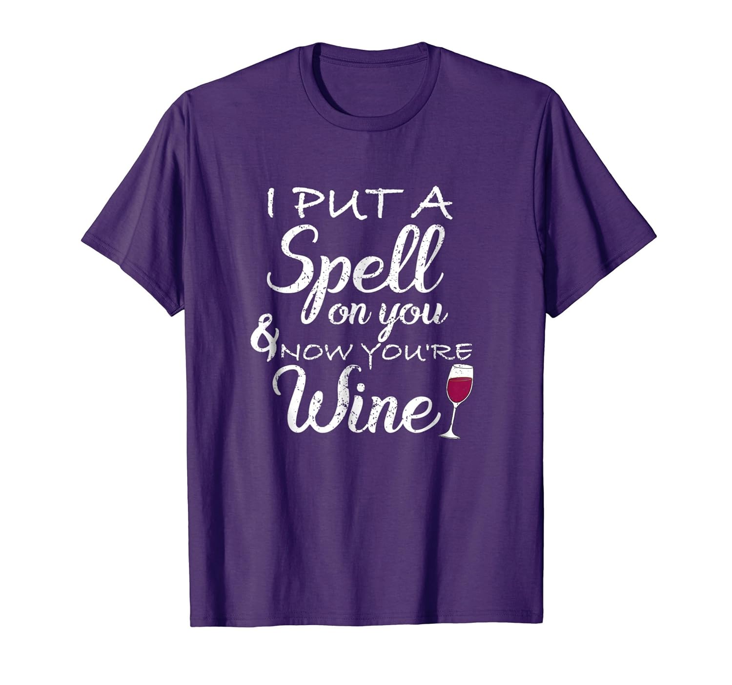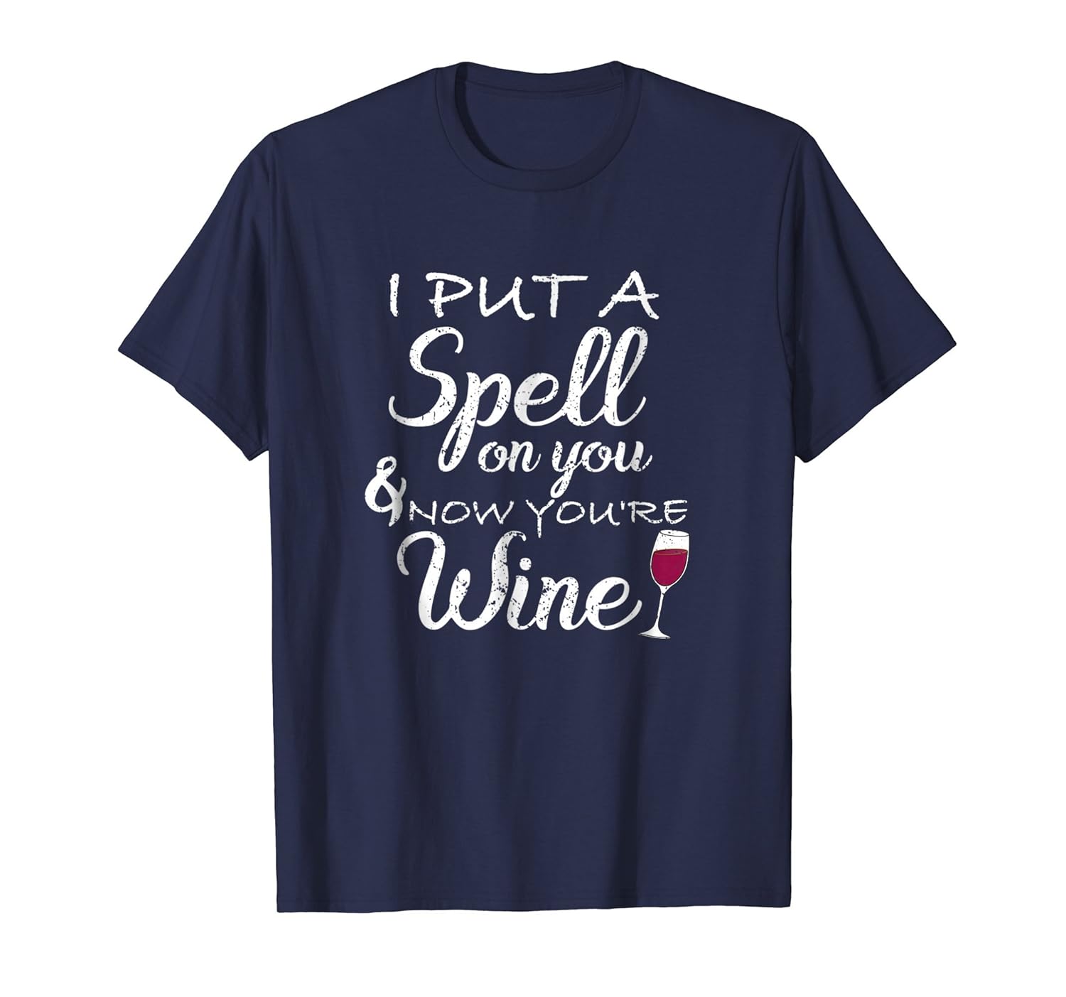 Solid colors: 100% Cotton; Heather Grey: 90% Cotton, 10% Polyester; All Other Heathers: 50% Cotton, 50% Polyester; Imported; Machine wash cold with like colors, dry low heat; Funny I put a spell on you and now youre mine t shirt makes a great gift for wine drinkers, Halloween, birthdays, Christmas.; I put a spell on you and now youre mine shirt halloween t shirt has white font and a glass of red wine design.; Lightweight, Classic fit, Double-needle sleeve and bottom hem