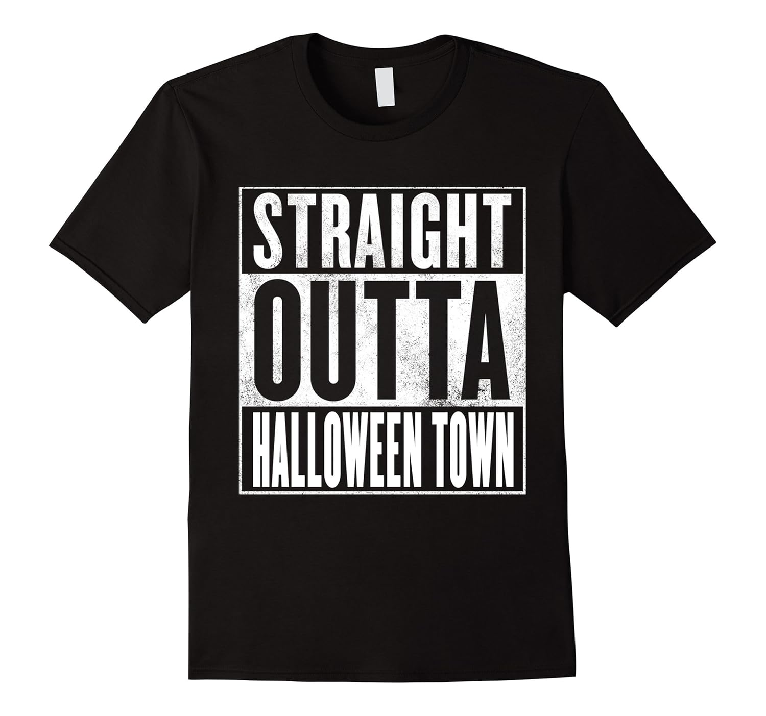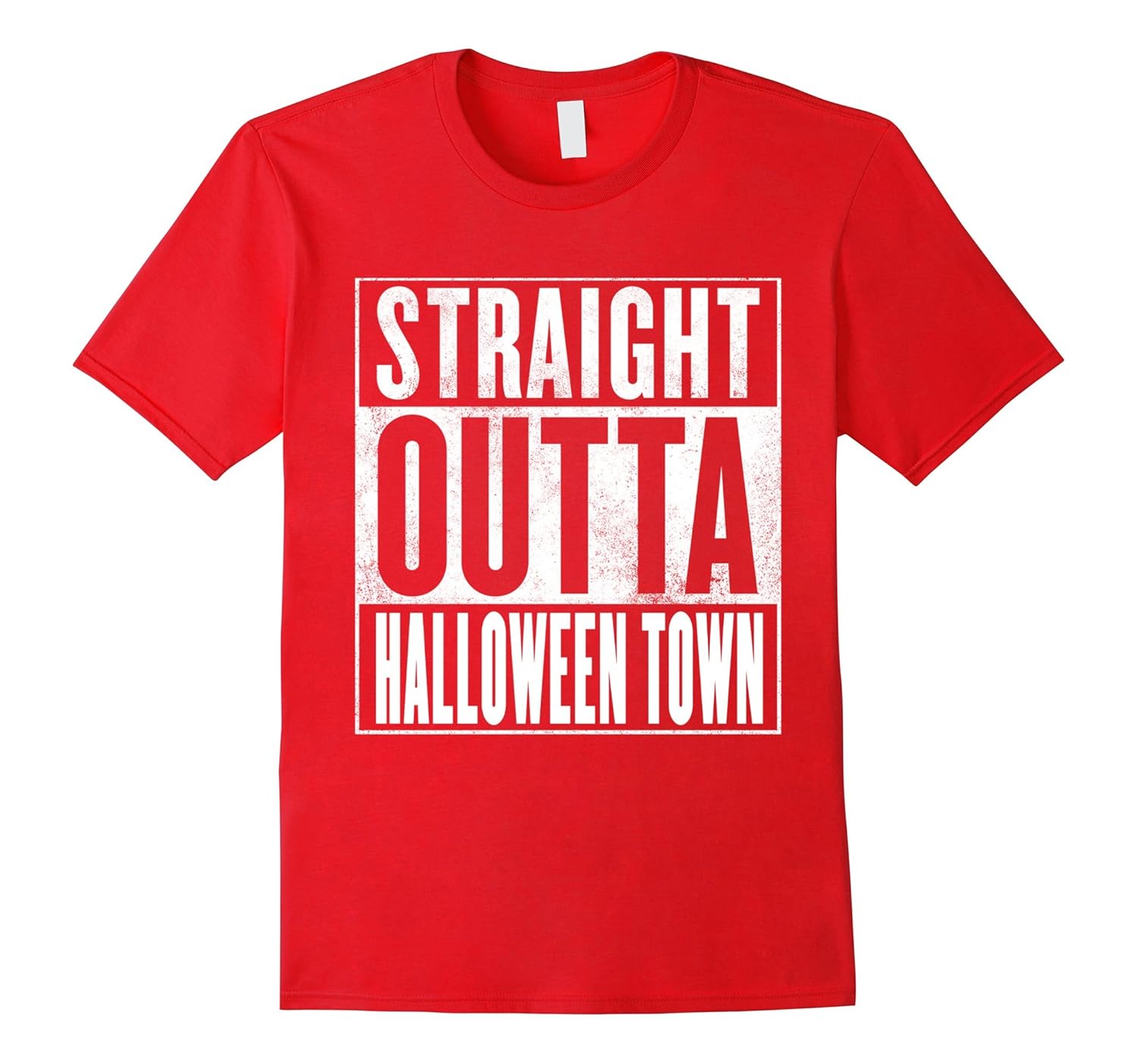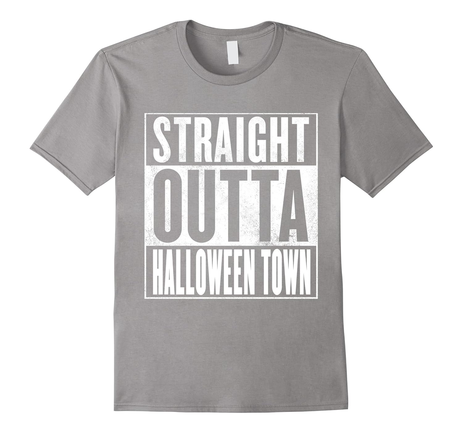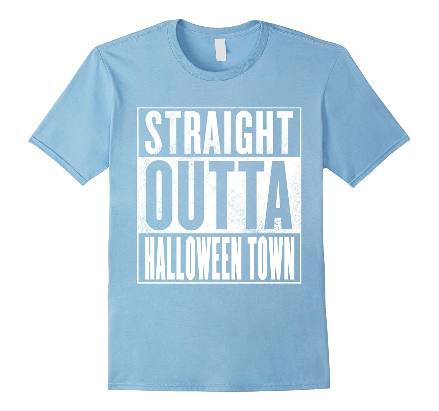 Solid colors: 100% Cotton; Heather Grey: 90% Cotton, 10% Polyester; All Other Heathers: 50% Cotton, 50% Polyester; Imported; Machine wash cold with like colors, dry low heat; Funny Halloween Town T-Shirt; STRAIGHT OUTTA HALLOWEEN TOWN Shirt; Lightweight, Classic fit, Double-needle sleeve and bottom hem