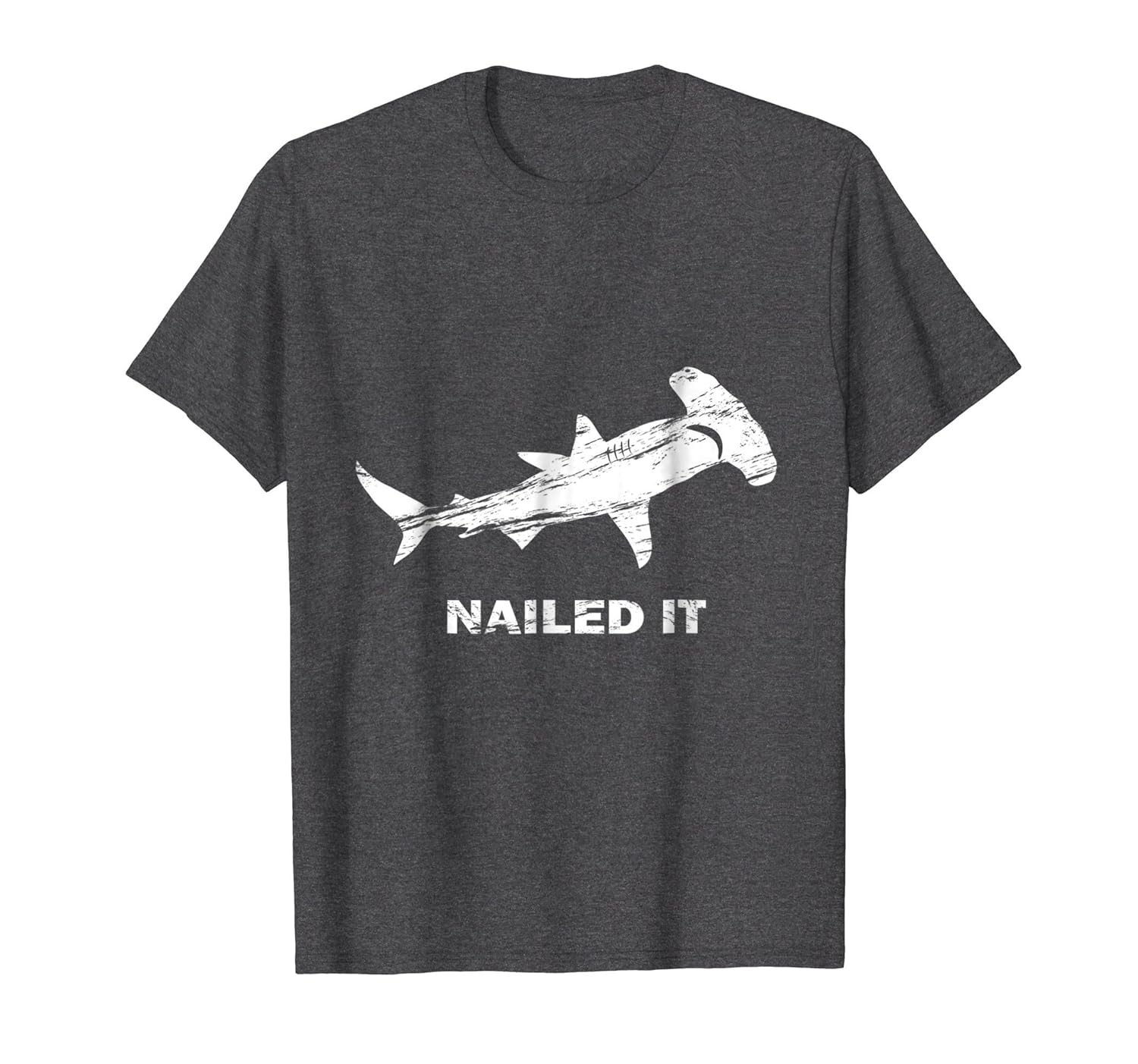 Solid colors: 100% Cotton; Heather Grey: 90% Cotton, 10% Polyester; All Other Heathers: 50% Cotton, 50% Polyester; Imported; Machine wash cold with like colors, dry low heat; Hammerhead Shark Nailed It t-shirt is perfect for ocean, week of shark, feeding frenzy and more! Perfect shark lover gift of souvenir.; Distressed tee shows a hammerhead shark above the pun / text Nailed it. Looks good on a great white shark or tiger shark lover, too!; Lightweight, Classic fit, Double-needle sleeve and bottom hem