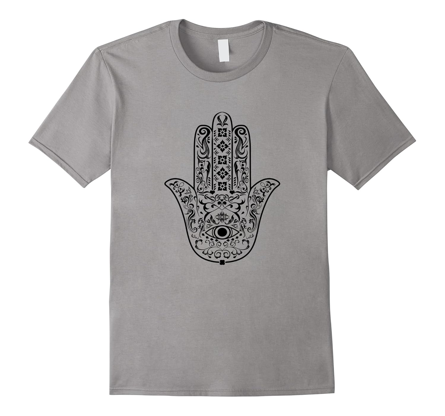 Solid colors: 100% Cotton; Heather Grey: 90% Cotton, 10% Polyester; All Other Heathers: 65% Cotton, 35% Polyester, Imported, Machine wash cold with like colors, dry low heat, The amulet symbolizing the Hand of God and the sign of protection in a beautiful shirt. The Hamesh Hand, hebrew symbol for protection. Lightweight, Classic fit, Double-needle sleeve and bottom hem