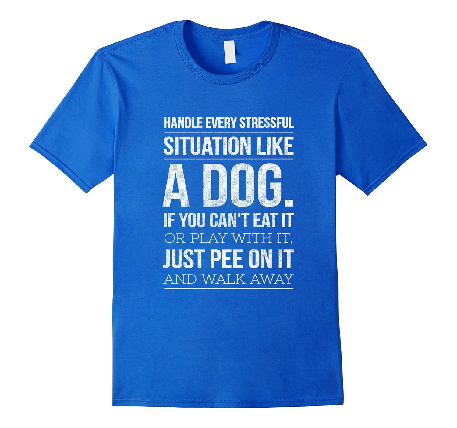 Solid colors: 100% Cotton; Heather Grey: 90% Cotton, 10% Polyester; All Other Heathers: 65% Cotton, 35% Polyester, Imported, Machine wash cold with like colors, dry low heat, Dog lovers will enjoy this t-shirt that says Handle Every Situation Like A Dog. IF You Can”t Eat It Or Play With It, Just Pee On It And Walk Away. This tee shirt makes a perfect gift for men or women who love dogs. Whether you love Rottweilers, Labs or Pugs this shirt is a perfect gift for a mom, sister, aunt, dad, brother, uncle who loves their puppy dog. Lightweight, Classic fit, Double-needle sleeve and bottom hem