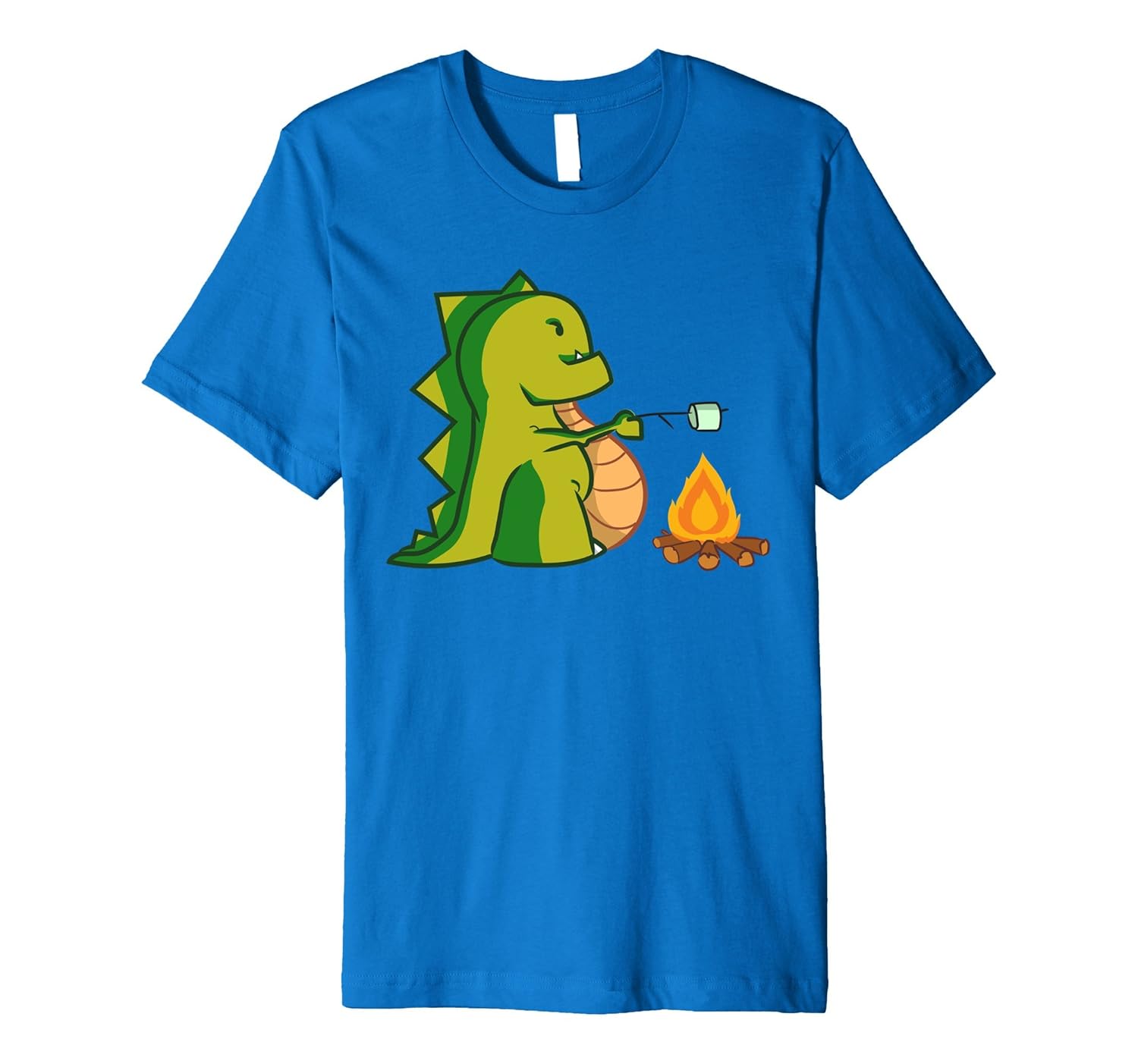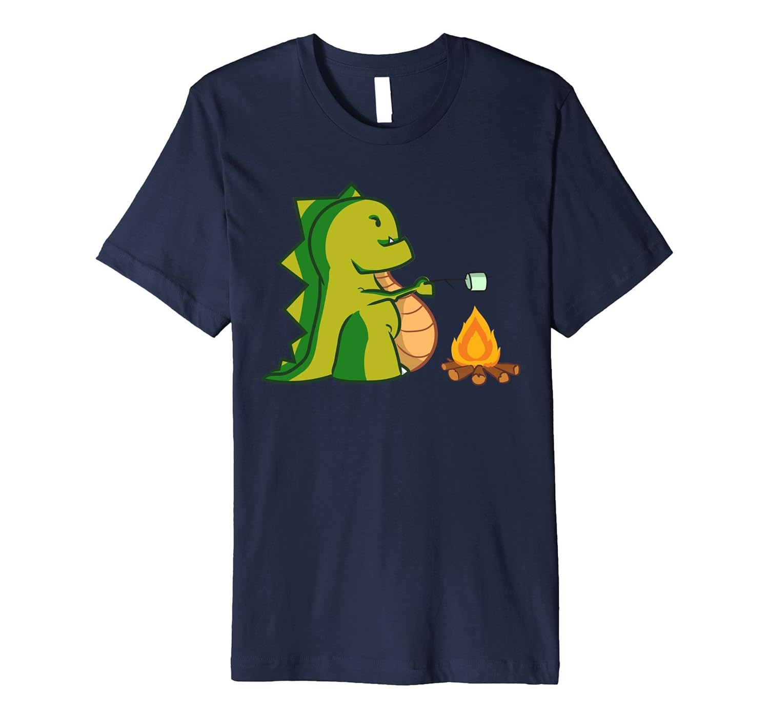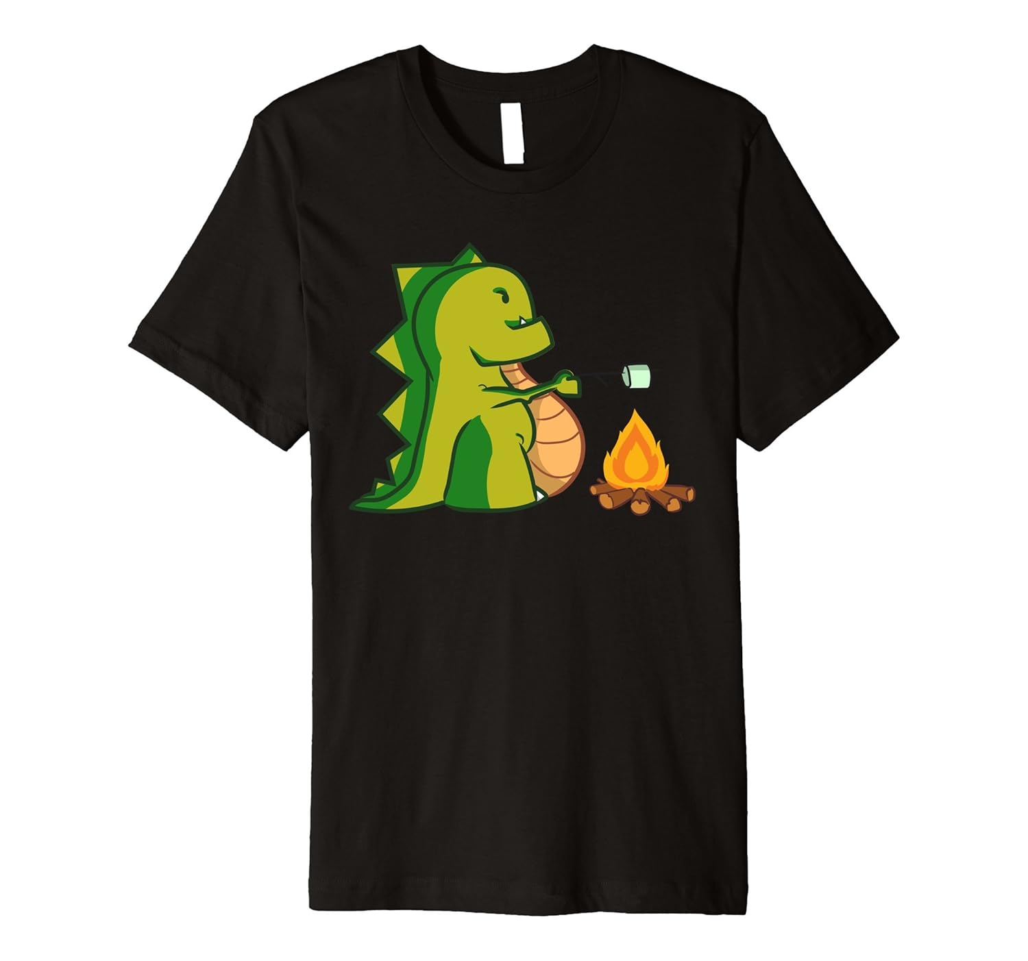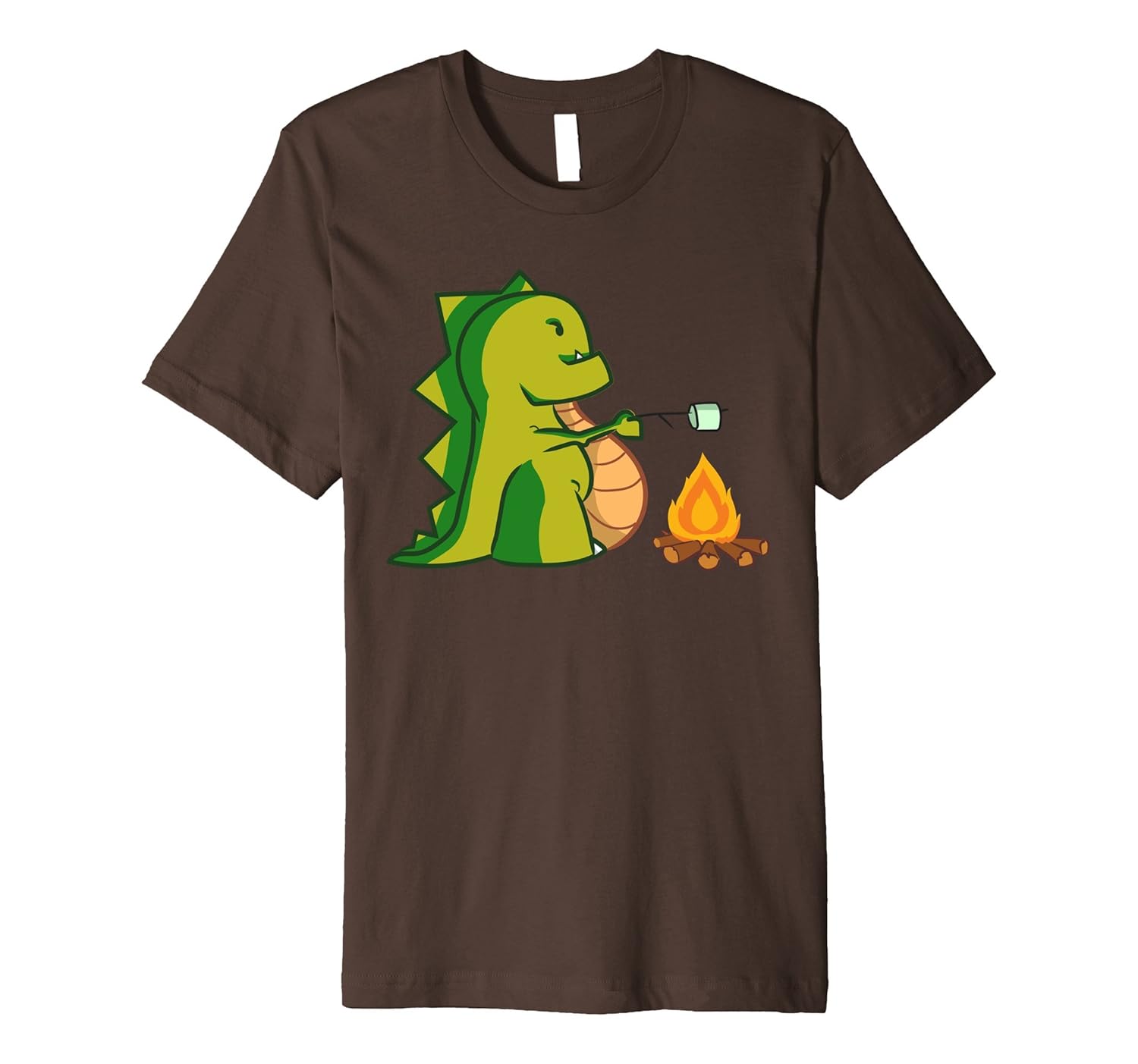 Solid colors: 100% Cotton; Heather Grey: 90% Cotton, 10% Polyester; All Other Heathers: 58% Cotton, 42% Polyester; Imported; Machine wash cold with like colors, dry low heat; Tshirt: Dino Campfire Marshmallow Shirt. Funny t-shirt image of a dinosaur roasting a marshmallow near a fire. Great camper tee for kids, men, women, boys, girls and toddlers. Awesome gift for your dad, brother, boyfriend, husband, uncle, son, girlfriend,; Fit: Slim (consider ordering a larger size for a looser fit); Perfect gift for Birthday party, Graduation, Retirement, Halloween, Christmas, New Years Eve, Thanksgiving, 4th of July, Easter, Mothers or Fathers Day, Souvenirs, Anniversaries! Great with mini, small, large, giant or jumbo dehydrated marshmallows.; This premium t-shirt is made of lightweight fine jersey fabric