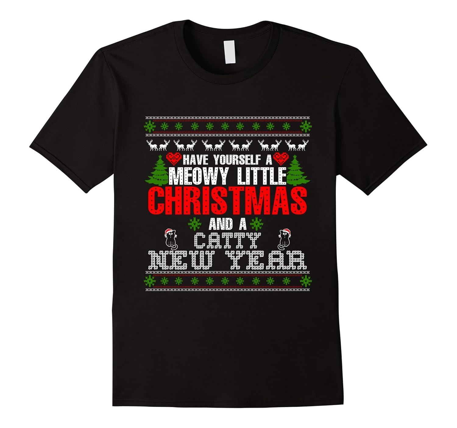 Solid colors: 100% Cotton; Heather Grey: 90% Cotton, 10% Polyester; All Other Heathers: 65% Cotton, 35% Polyester, Imported, Machine wash cold with like colors, dry low heat, Have Yourself A Meowy Little Christmas And A Catty New Year Ugly Sweater T-shirt. Funny T-shirt. Festive holiday design will put a smile on every cat lovers face. Merry Christmas, Happy New Year tee. Perfect gift for any cat lady and all the cat men too. I love cats t shirt, cat gifts, cat t shirt, t shirt with funny sayings, funny t shirt sayings, Christian t-shirt, Santa t-shirt, Merry Christmas t-shirt, cat lover apparel, cat lover gifts, cat owner, Lightweight, Classic fit, Double-needle sleeve and bottom hem