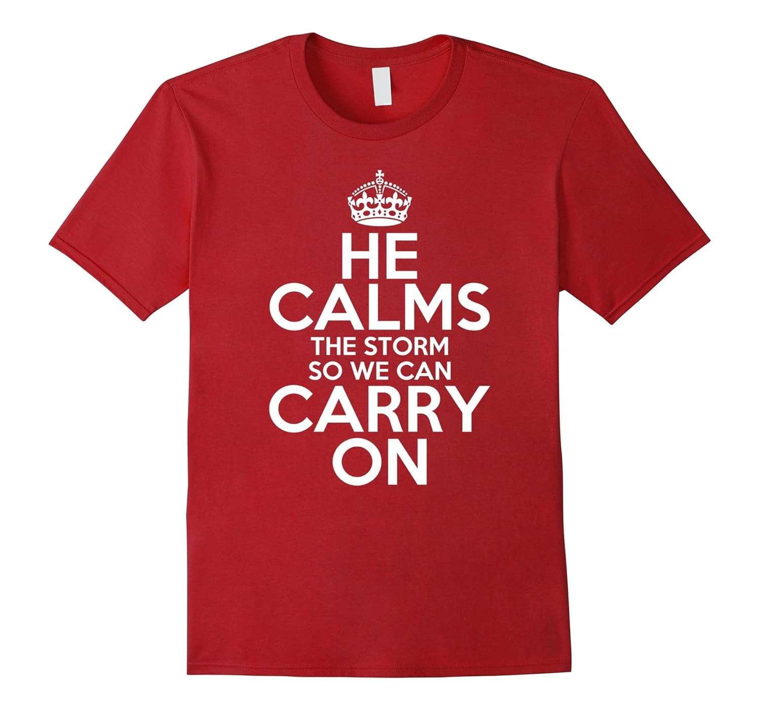 Solid colors: 100% Cotton; Heather Grey: 90% Cotton, 10% Polyester; All Other Heathers: 65% Cotton, 35% Polyester, Imported, Machine wash cold with like colors, dry low heat, He Calms The Storm So We Can Carry On tee, Jesus t-shirt, Red t-shirt proclaiming who keeps us calm. Stay Calm, Be Calm, Lightweight, Classic fit, Double-needle sleeve and bottom hem