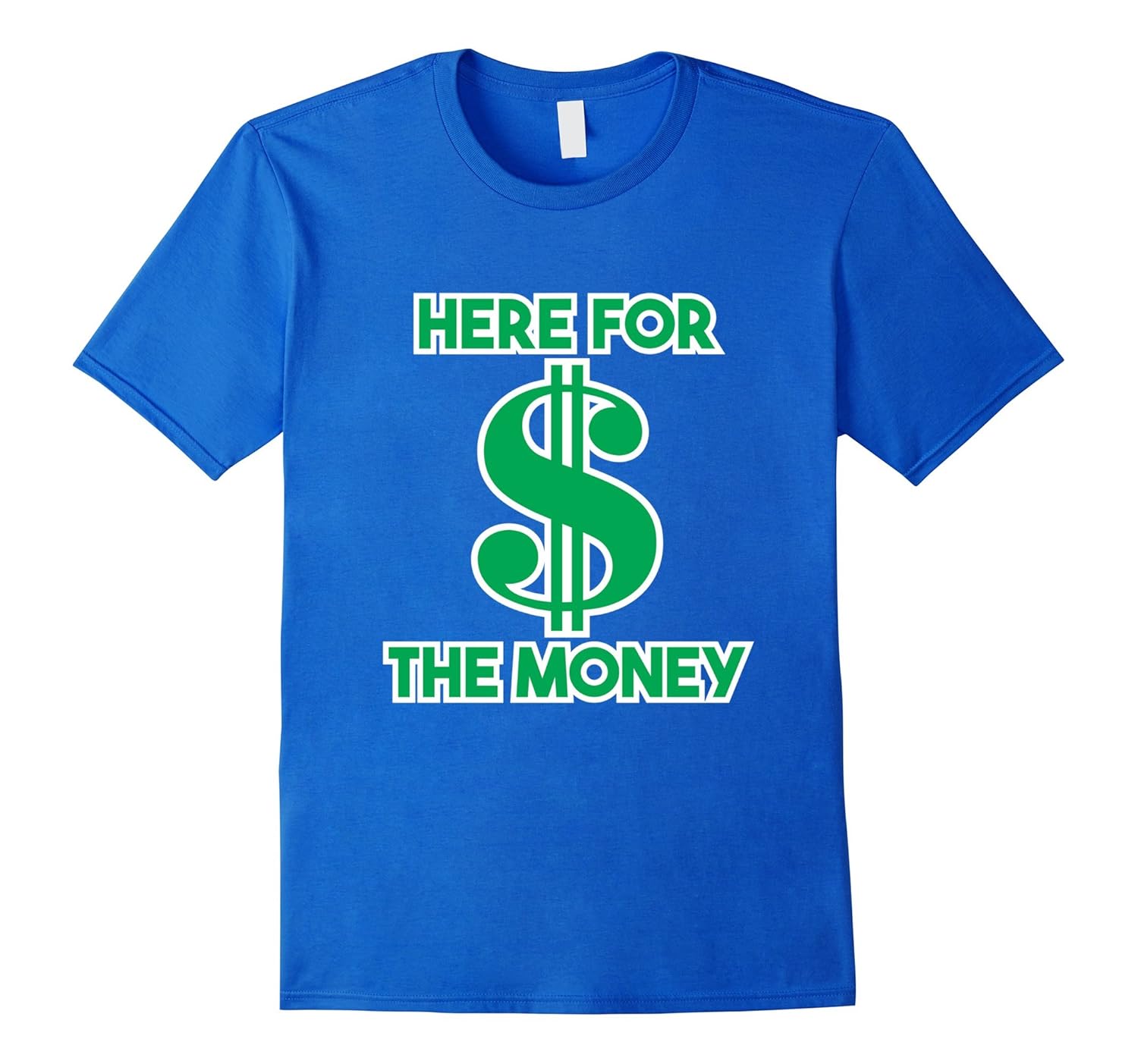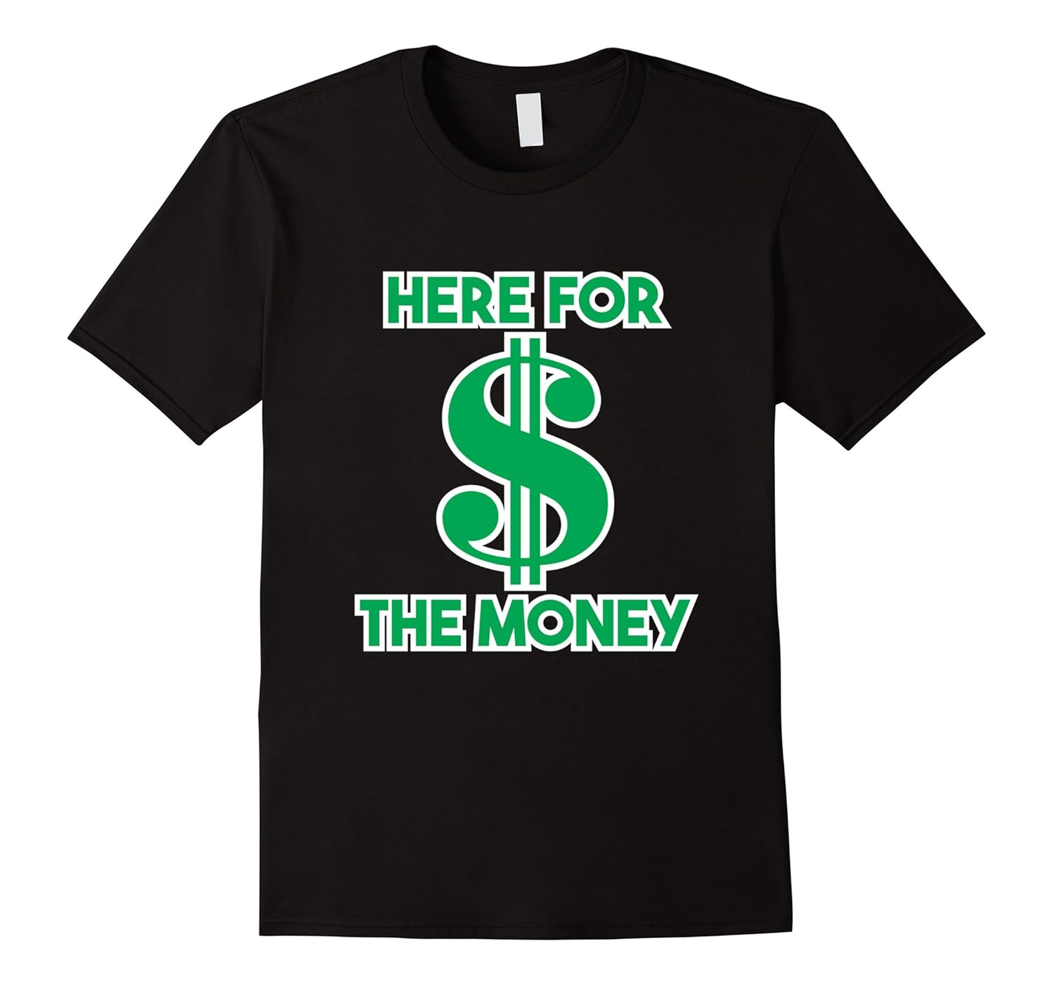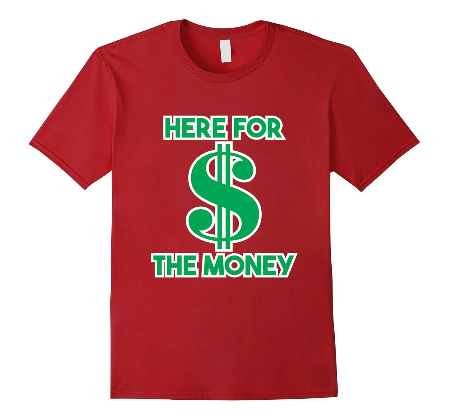 Solid colors: 100% Cotton; Heather Grey: 90% Cotton, 10% Polyester; All Other Heathers: 65% Cotton, 35% Polyester, Imported, Machine wash cold with like colors, dry low heat, HERE FOR THE MONEY text and dollar sign in green with white outline, Show you are out to get your share of the cash with this fun, bold shirt. Lightweight, Classic fit, Double-needle sleeve and bottom hem