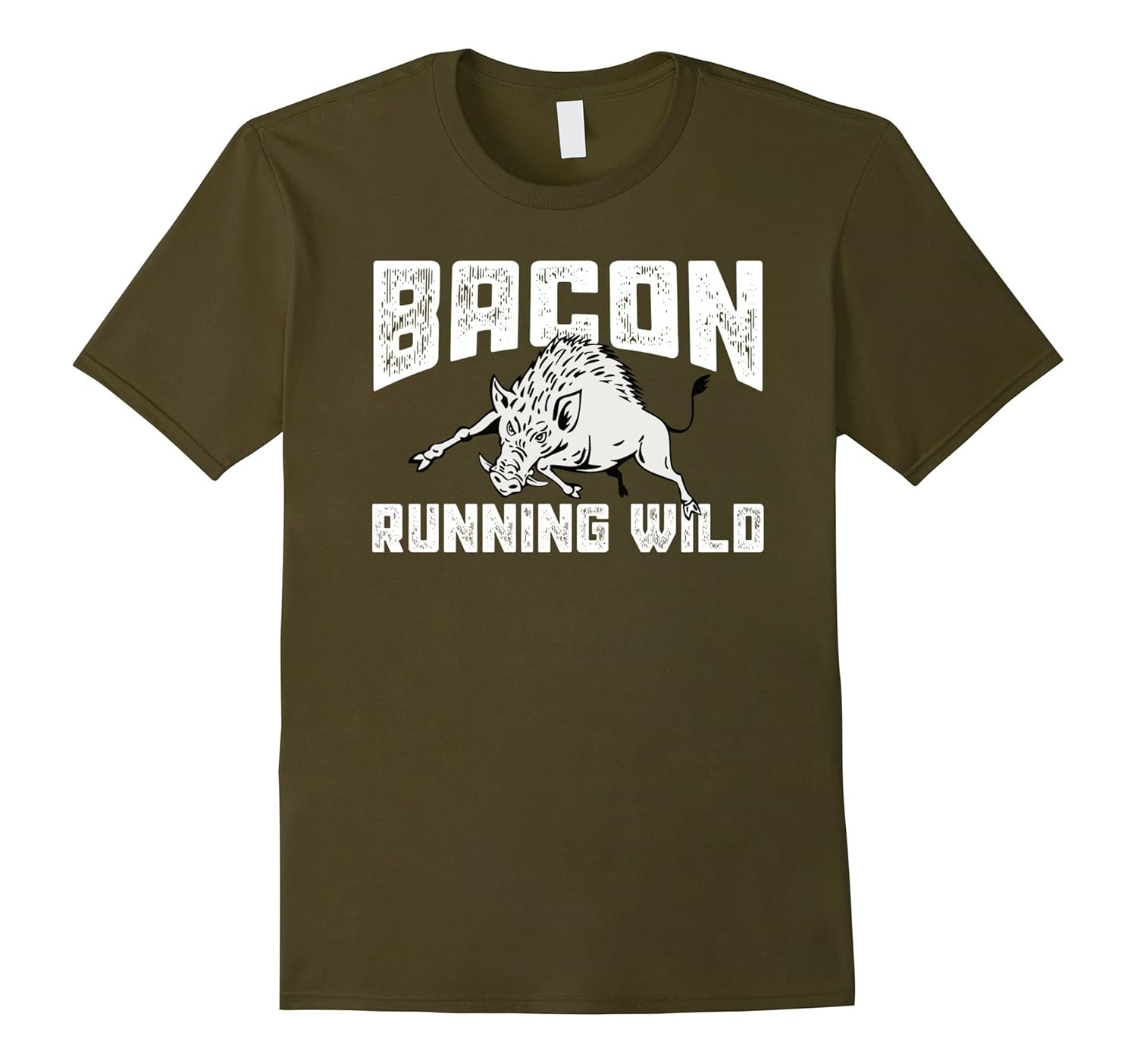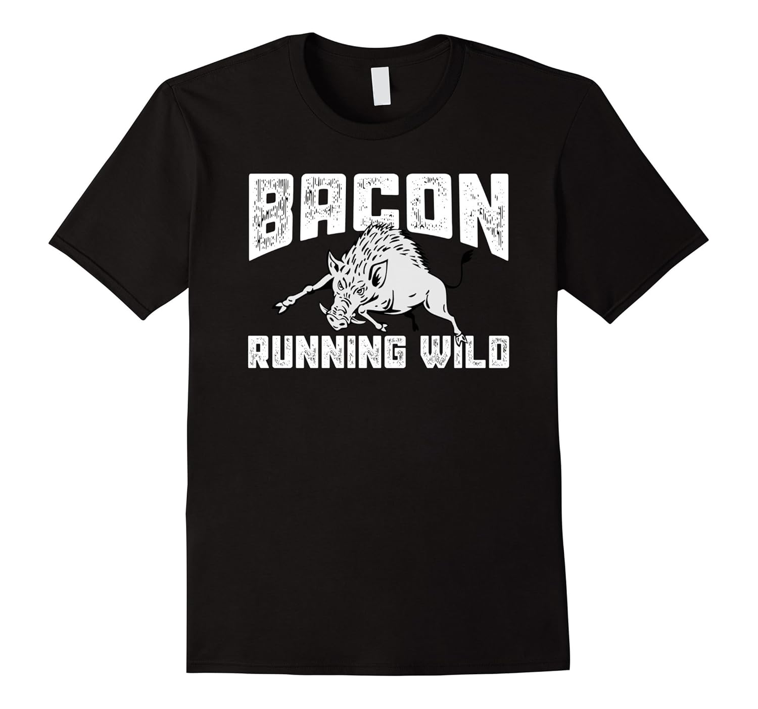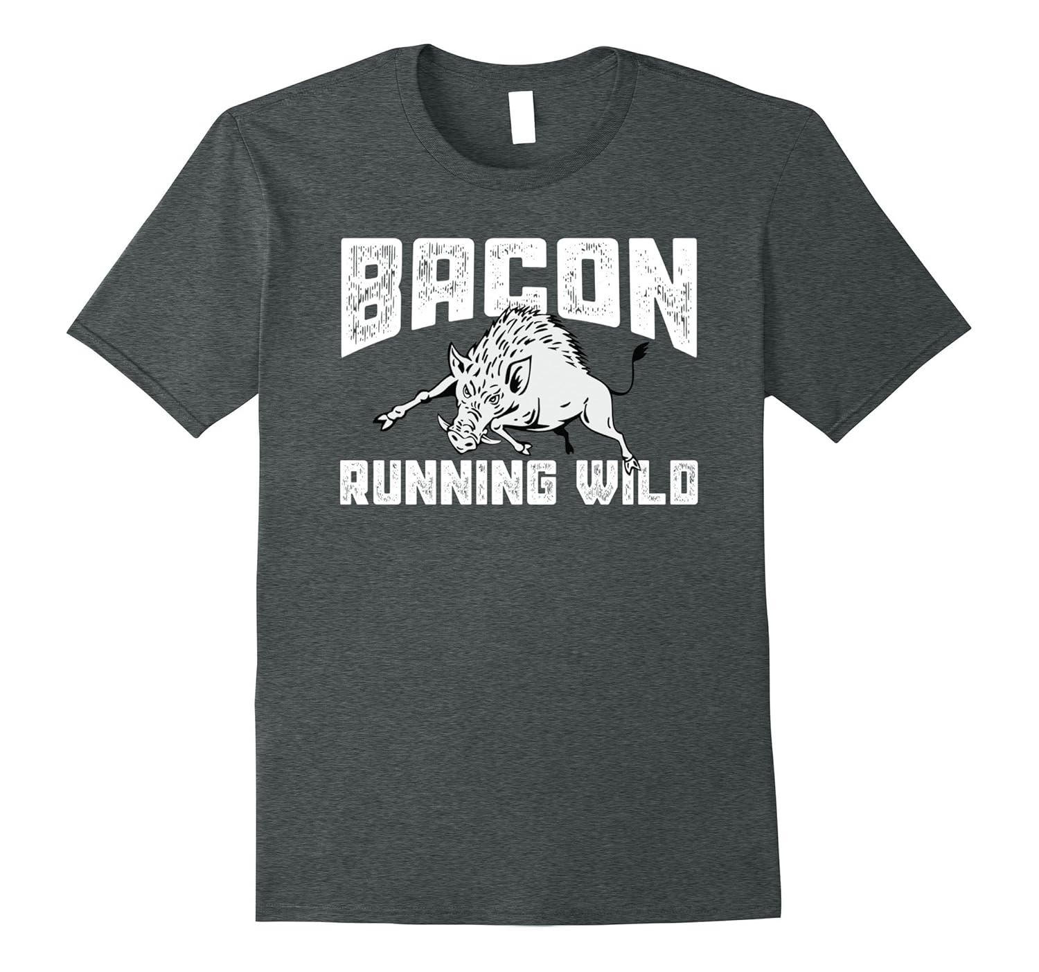 Solid colors: 100% Cotton; Heather Grey: 90% Cotton, 10% Polyester; All Other Heathers: 65% Cotton, 35% Polyester; Imported; Machine wash cold with like colors, dry low heat; Great gift for your next hog boar dog hunting season trip.; Bacon Running Wild tee shirt. This T-Shirt is designed and printed to be fitted. For a more loose fit, please order a size up.; Lightweight, Classic fit, Double-needle sleeve and bottom hem