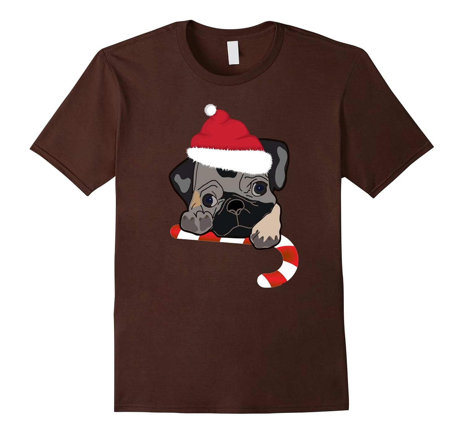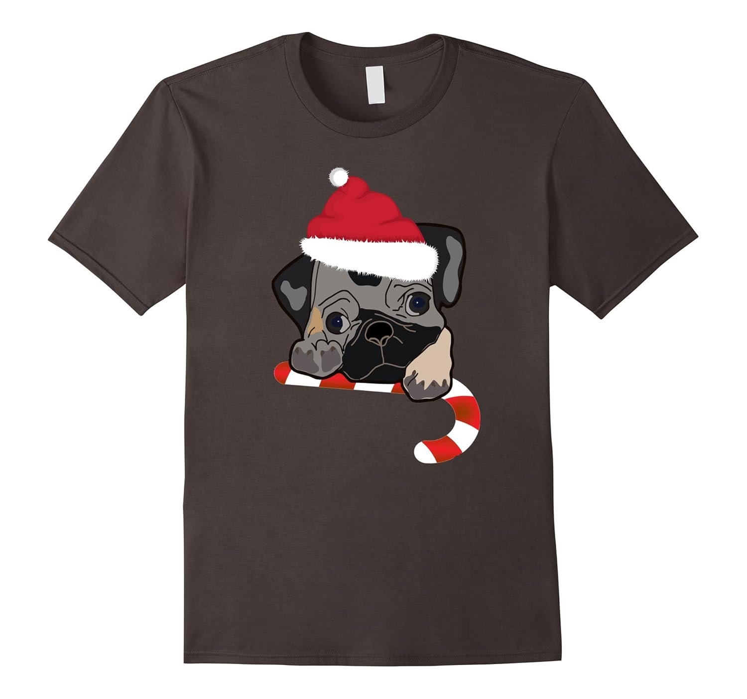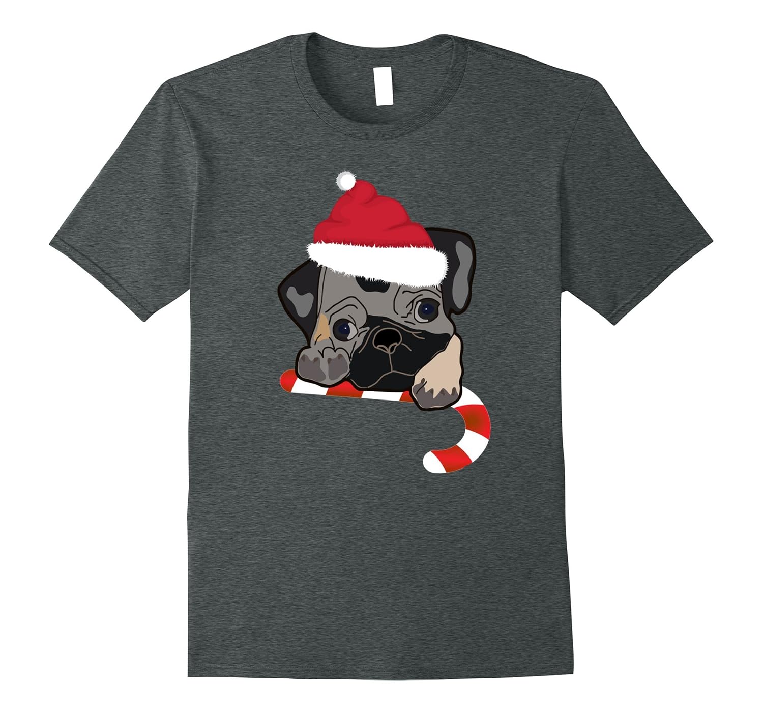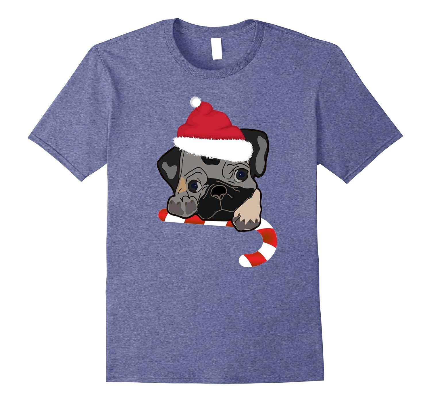 Solid colors: 100% Cotton; Heather Grey: 90% Cotton, 10% Polyester; All Other Heathers: 65% Cotton, 35% Polyester, Imported, Machine wash cold with like colors, dry low heat, T-shirt by Holiday Tees this shirt is adorned with an adorable pug puppy sporting a Santa hat and hugging a candy cane. Fashionable and fun for all your holiday parties. Great for the dog lover, Xmas fan, or candy fanatic. Order a size up for a looser fit. Lightweight, Classic fit, Double-needle sleeve and bottom hem