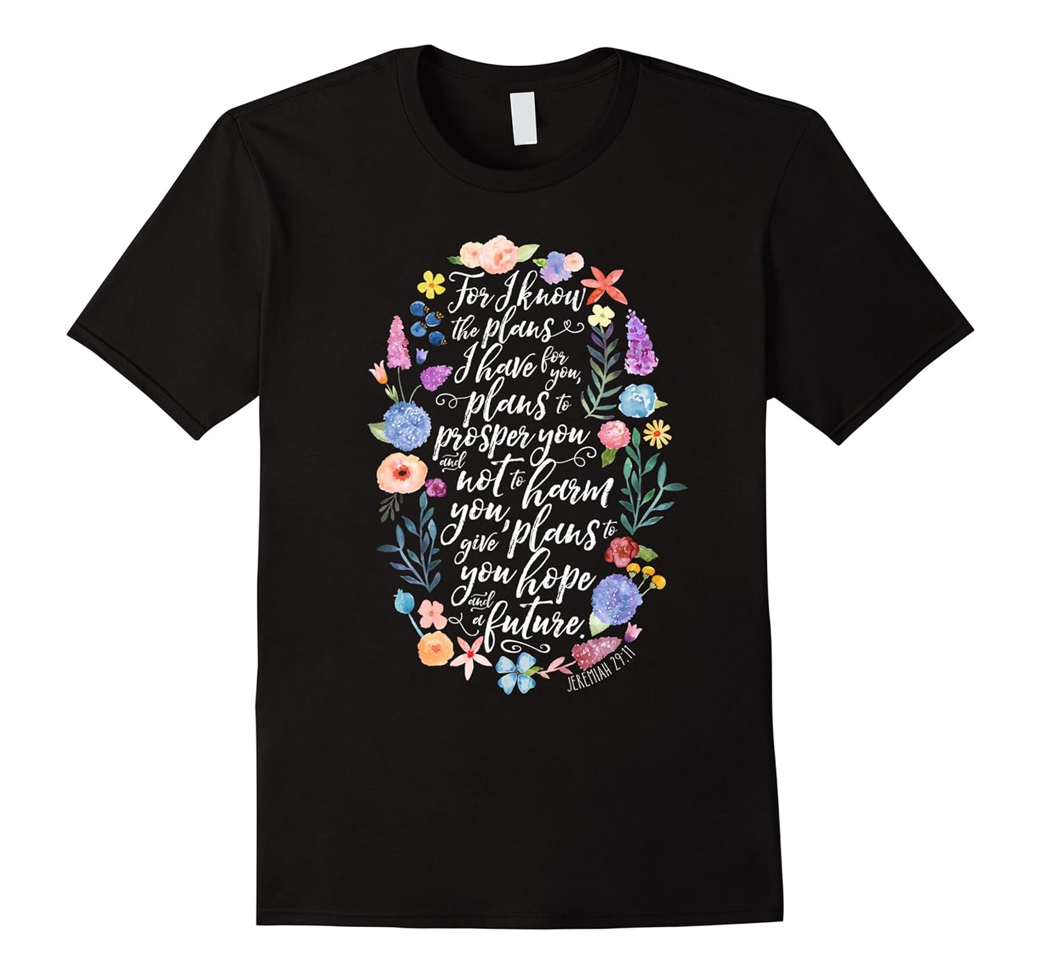 Solid colors: 100% Cotton; Heather Grey: 90% Cotton, 10% Polyester; All Other Heathers: 65% Cotton, 35% Polyester, Imported, Machine wash cold with like colors, dry low heat, Pretty watercolor flowers surround scripture, Bible verse t-shirt, Lightweight, Classic fit, Double-needle sleeve and bottom hem