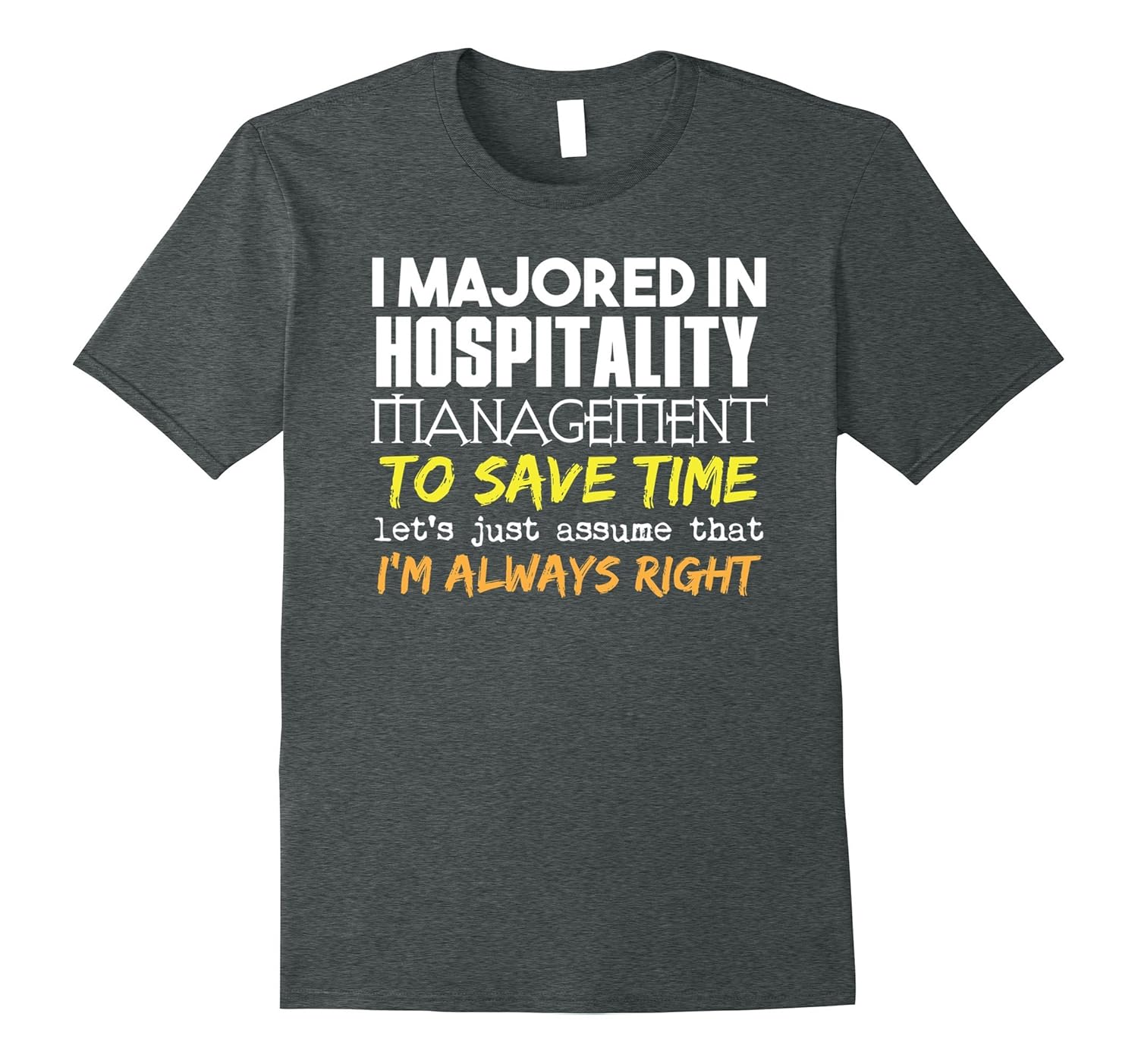 Solid colors: 100% Cotton; Heather Grey: 90% Cotton, 10% Polyester; All Other Heathers: 65% Cotton, 35% Polyester, Imported, Machine wash cold with like colors, dry low heat, I Majored in Hospitality Management, to Save Time Let”s Just Assume I”m Always Right! Funny Hospitality Management Shirt for any Hospitality Management student or graduate!, Great gift for guys and girls studying Hospitality Management, perfect birthday gift, Christmas present or Back to School care package!, Lightweight, Classic fit, Double-needle sleeve and bottom hem