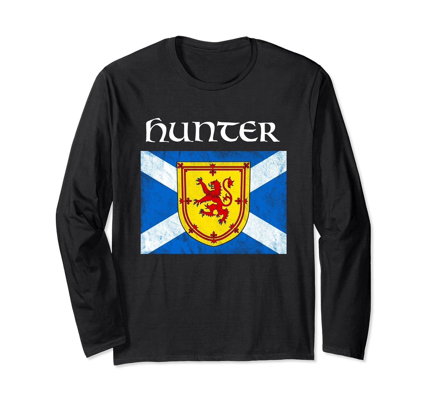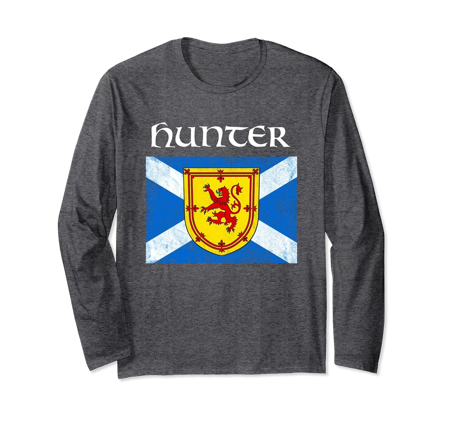 Solid colors: 100% Cotton; Heather Grey: 90% Cotton, 10% Polyester; All Other Heathers: 50% Cotton, 50% Polyester; Imported; Machine wash cold with like colors, dry low heat; Hunter Scottish name long sleeve t-shirt gift. Gaelic Scot heritage apparel with Scotland flag, lion rampant. Scottish name, clan name, surname, Celtic family name shirt. Wear with kilts or tartan for highland games.; Lightweight, Classic fit, Double-needle sleeve and bottom hem