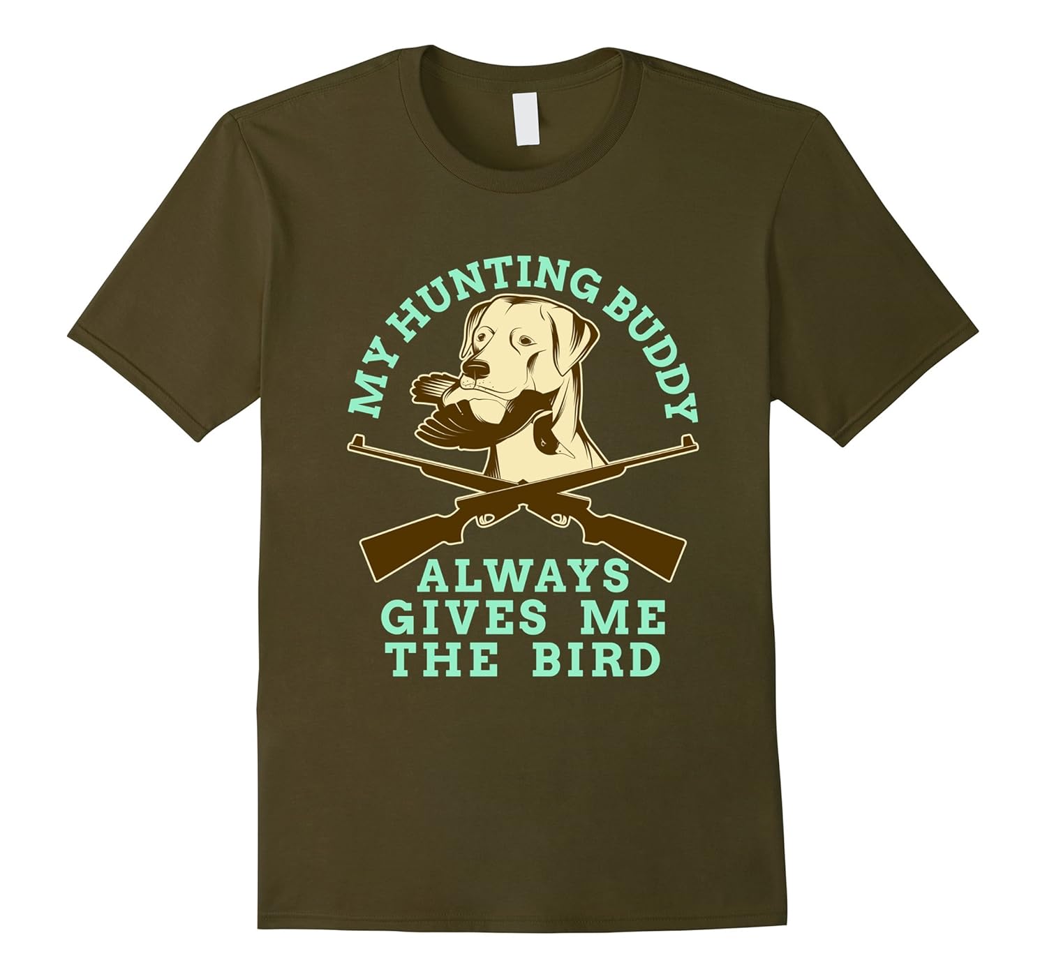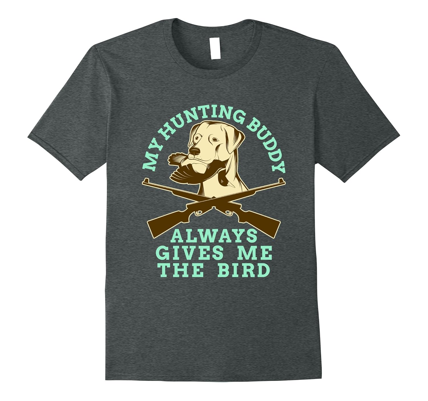 Solid colors: 100% Cotton; Heather Grey: 90% Cotton, 10% Polyester; All Other Heathers: 65% Cotton, 35% Polyester; Imported; Machine wash cold with like colors, dry low heat; My hunting buddy always gives me the bird; this humorous pun tee shirt is perfect for bird hunters with pointers and retrievers; Wear this hilarious t shirt any time you are hunting or hanging out with your hunting dog; Lightweight, Classic fit, Double-needle sleeve and bottom hem