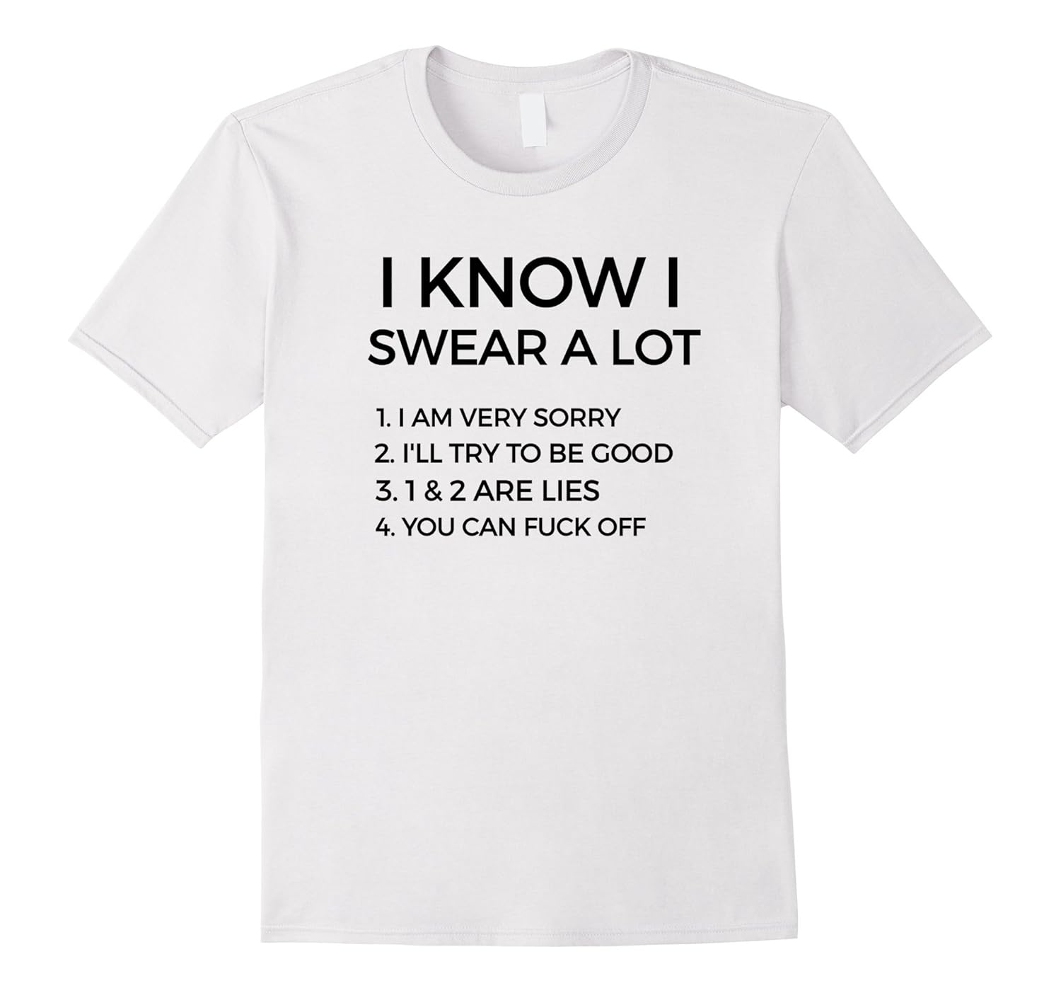 Solid colors: 100% Cotton; Heather Grey: 90% Cotton, 10% Polyester; All Other Heathers: 65% Cotton, 35% Polyester, Imported, Machine wash cold with like colors, dry low heat, Funny, sarcastic, sarcasm, humor, joke, I Know I Swear A Lot. I Am Very Sorry. I”ll Try To Be Good. 1 and; 2 Are Lies. Lightweight, Classic fit, Double-needle sleeve and bottom hem