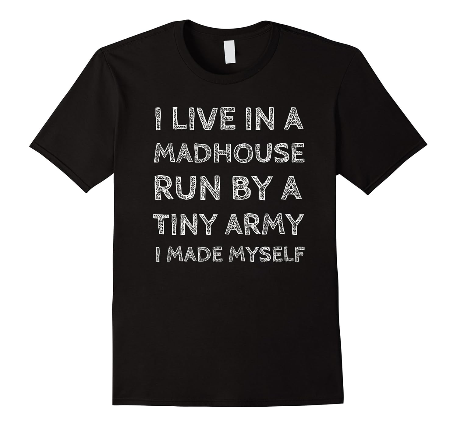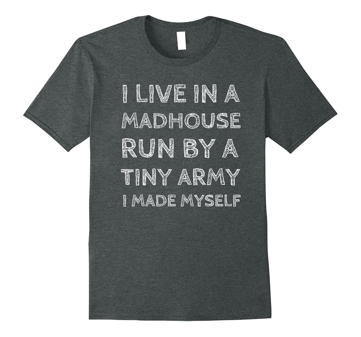 Solid colors: 100% Cotton; Heather Grey: 90% Cotton, 10% Polyester; All Other Heathers: 65% Cotton, 35% Polyester, Imported, Machine wash cold with like colors, dry low heat, The shirt reads, “I Live in a Madhouse Run by a Tiny Army I Made Myself.” Mom tshirts with sayings, shirts with funny words for mom, mother shirts with sayings, tshirts for women funny, wife shirts with sayings, super mom super wife super tired. Whether you call it a tshirt, tee, t-shirt, or t shirt you”ll love this I Live in a Madhouse Run by a Tiny Army I Made Myself Shirt. Lightweight, Classic fit, Double-needle sleeve and bottom hem