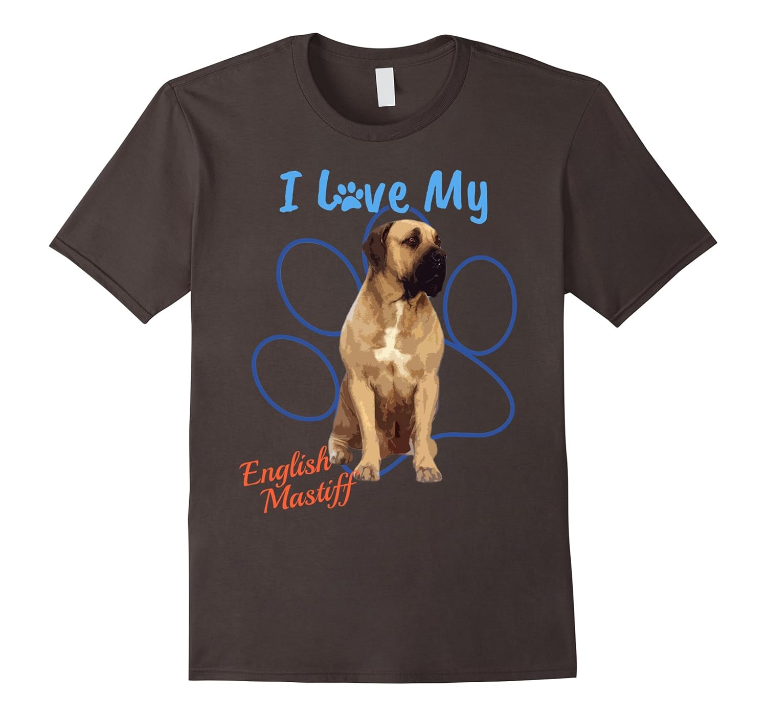 Solid colors: 100% Cotton; Heather Grey: 90% Cotton, 10% Polyester; All Other Heathers: 65% Cotton, 35% Polyester; Imported; Machine wash cold with like colors, dry low heat; I Love My English Mastiff Best Dog Lover Paw Print TShirt! This shirt is for the puppy Andamp; dog lover who knows their dog breed is awesome and want to show the world what kind of canine they have! Great to wear to the dog park and around other animal lovers!; This beautifully designed graphic novelty tee shirt makes a great Christmas and/or Birthday gift for boys, girls, men, women, yourself, and everyone who loves their four legged, barking, tail wagging part of the family! Great conversation starter!; Lightweight, Classic fit, Double-needle sleeve and bottom hem
