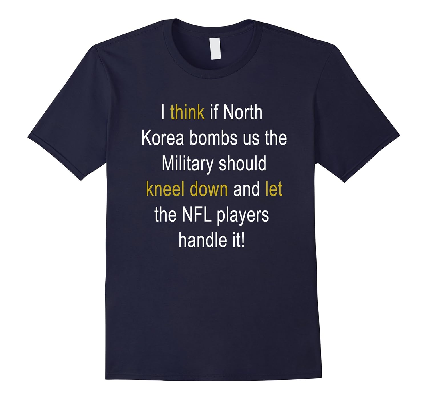 Solid colors: 100% Cotton; Heather Grey: 90% Cotton, 10% Polyester; All Other Heathers: 65% Cotton, 35% Polyester, Imported, Machine wash cold with like colors, dry low heat, I think if North Korea bombs us the Military should kneel down Shirt, Funny Political T-Shirt, Funny Anti Trump T-Shirt, Funny North Korea Shirt, Lightweight, Classic fit, Double-needle sleeve and bottom hem
