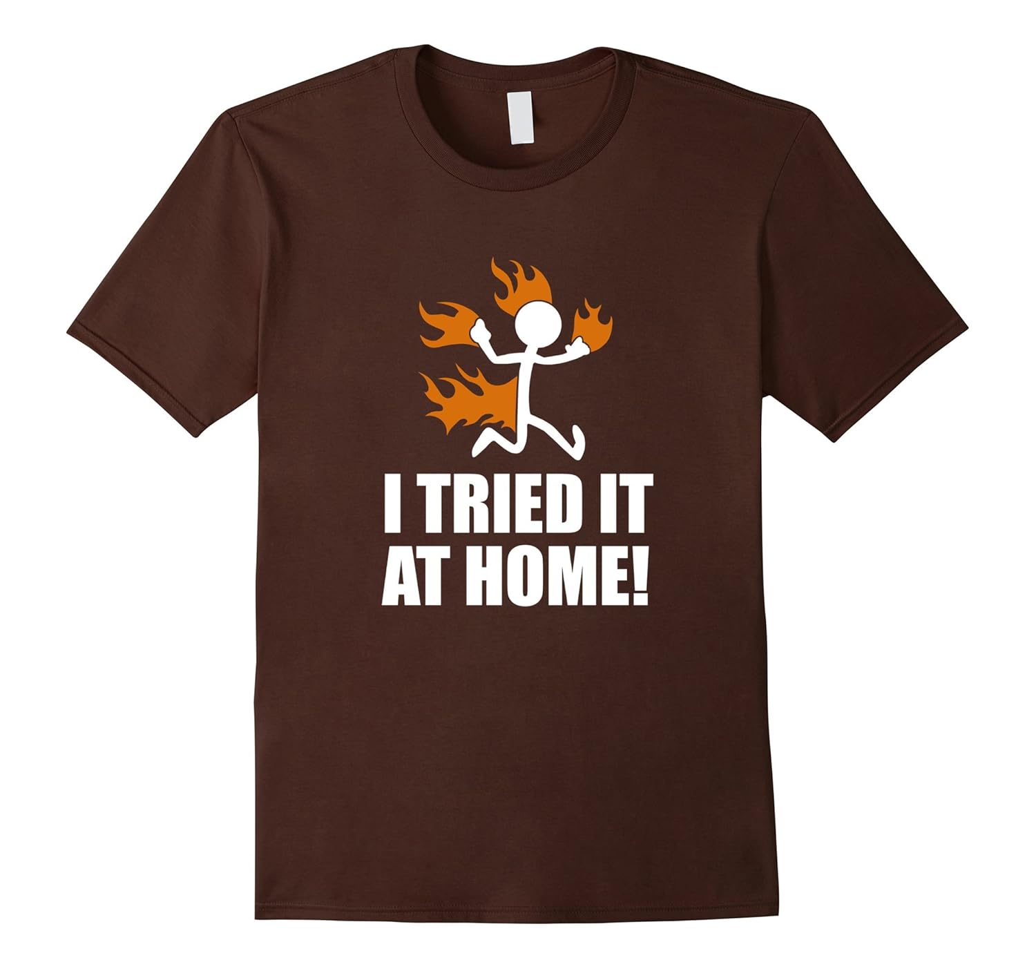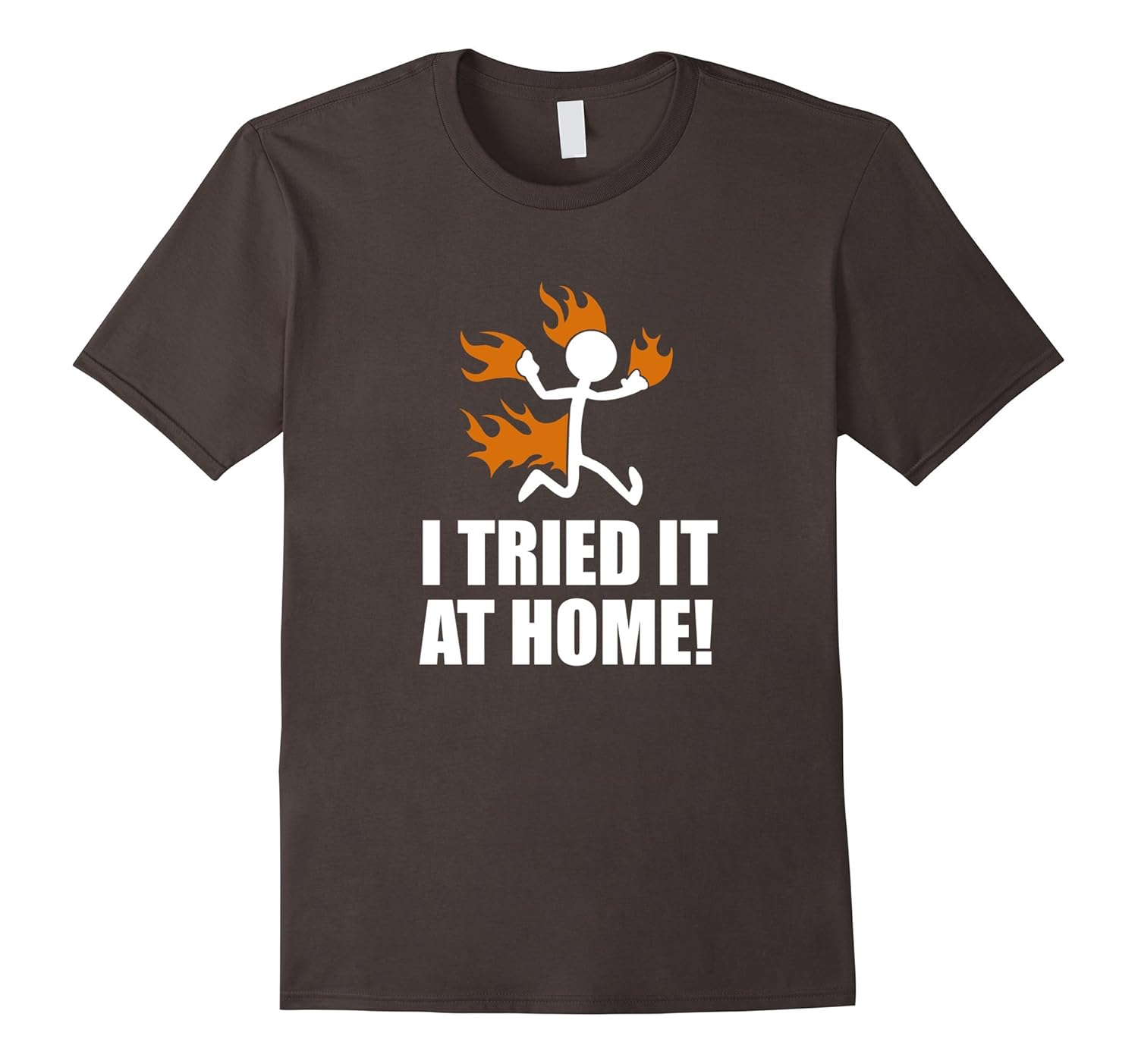 Solid colors: 100% Cotton; Heather Grey: 90% Cotton, 10% Polyester; All Other Heathers: 65% Cotton, 35% Polyester, Imported, Machine wash cold with like colors, dry low heat, I tried it at home funny fire stunt t-shirt, A classic funny design for the amateur stuntman who has to try it at home even when the experts say not to. Lightweight, Classic fit, Double-needle sleeve and bottom hem