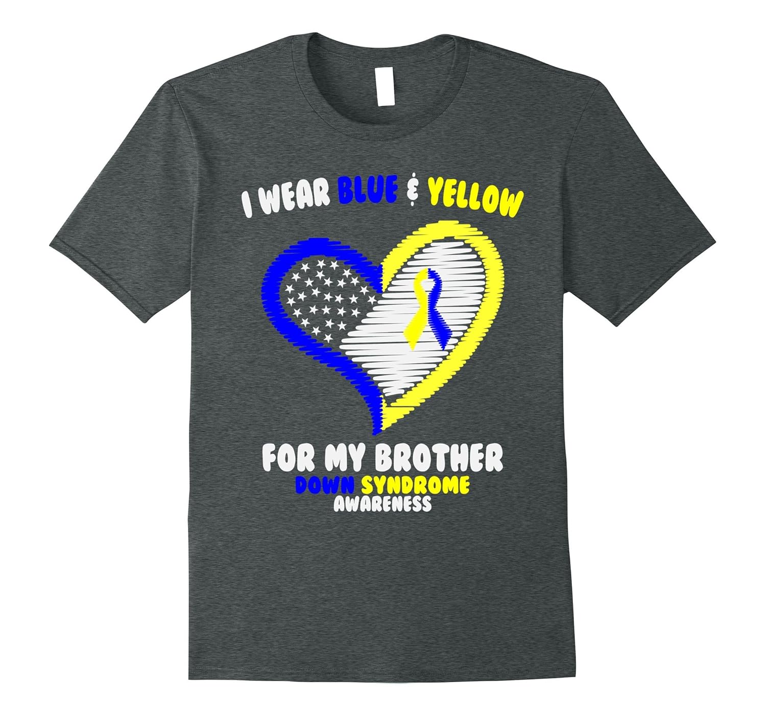 Solid colors: 100% Cotton; Heather Grey: 90% Cotton, 10% Polyester; All Other Heathers: 65% Cotton, 35% Polyester, Imported, Machine wash cold with like colors, dry low heat, Down syndrome awareness shirt, I wear blue and yellow for my brother. Makes a perfect shirt for the brothers and sisters of a down syndrome cancer warrior on occasions like birthday, christmas, halloween, thanksgiving day or any gift giving day. Wear this shirt to spread the awareness for down syndrome cancer. Or wear this shirt especially to show your support for your brother fighting with down syndrome cancer. Perfect gift for brother and sister. Lightweight, Classic fit, Double-needle sleeve and bottom hem