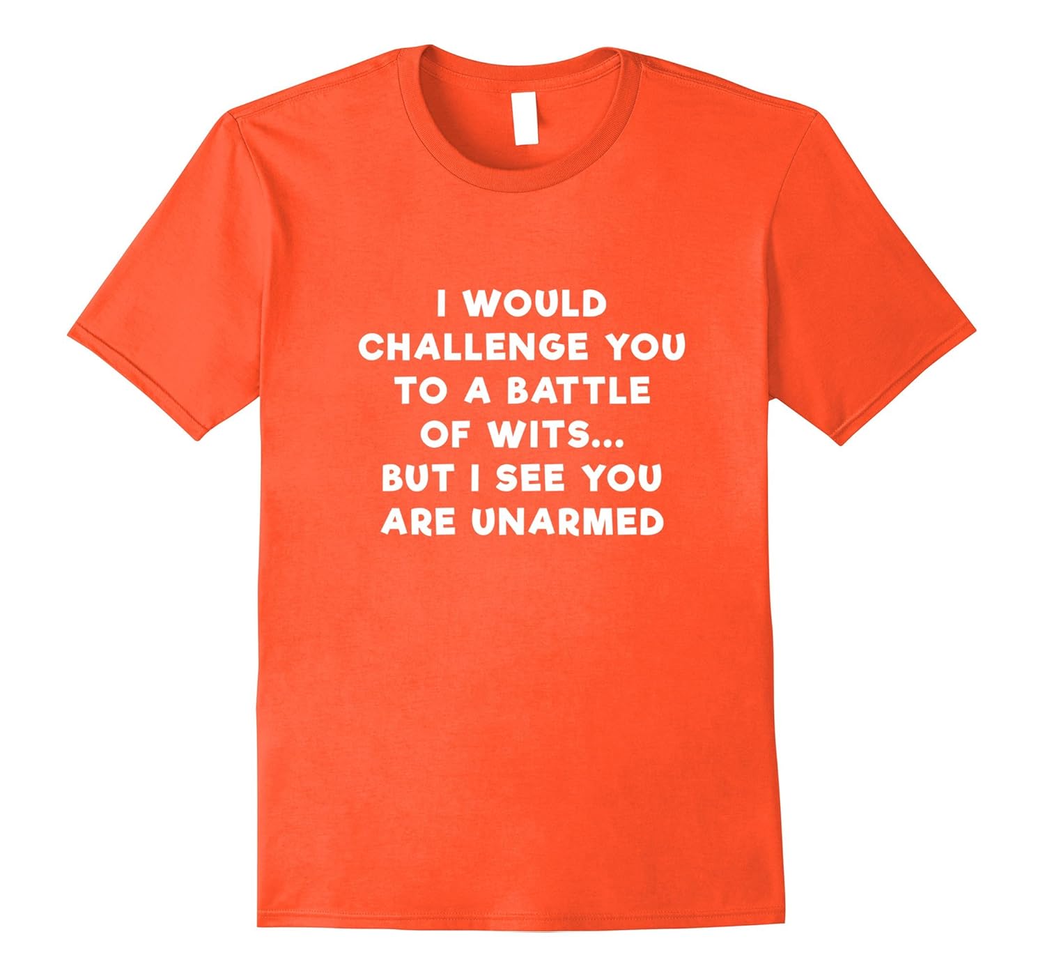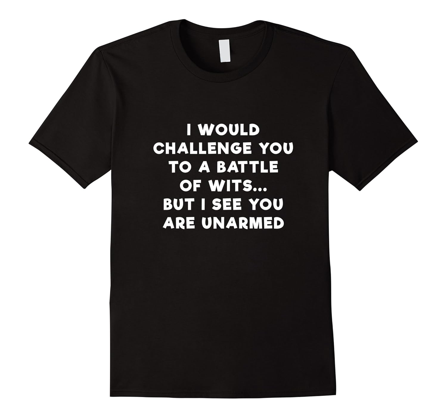 Solid colors: 100% Cotton; Heather Grey: 90% Cotton, 10% Polyester; All Other Heathers: 65% Cotton, 35% Polyester, Imported, Machine wash cold with like colors, dry low heat, A funny and sarcastic t shirt with the words “I Would Challenge You to a Battle of Wits But I See You Are Unarmed” on the front in white text. Make all of your friends laugh with this great slogan. This will make for a great conversation starter with other people that like being funny or making people laugh in general. Lightweight, Classic fit, Double-needle sleeve and bottom hem
