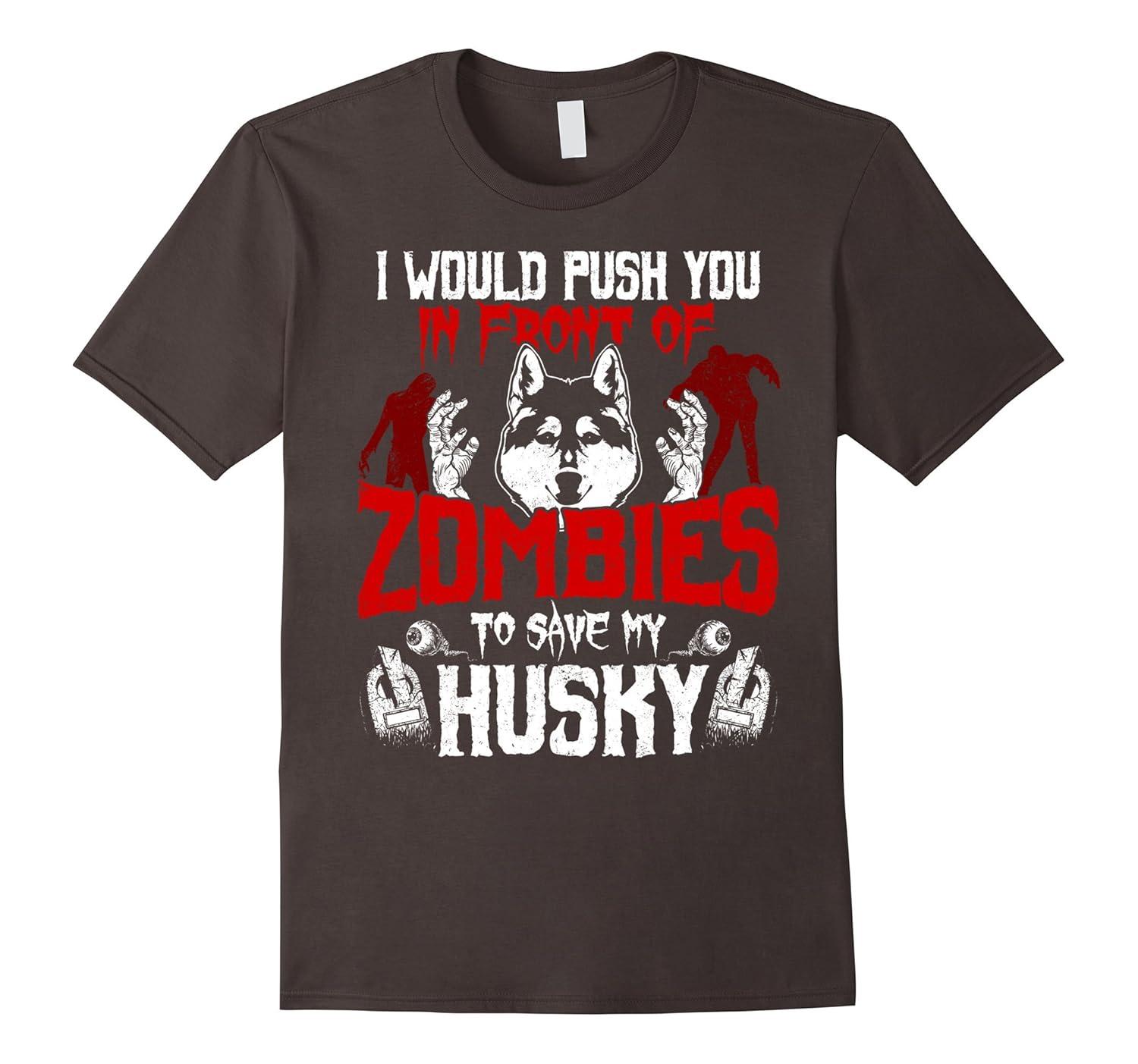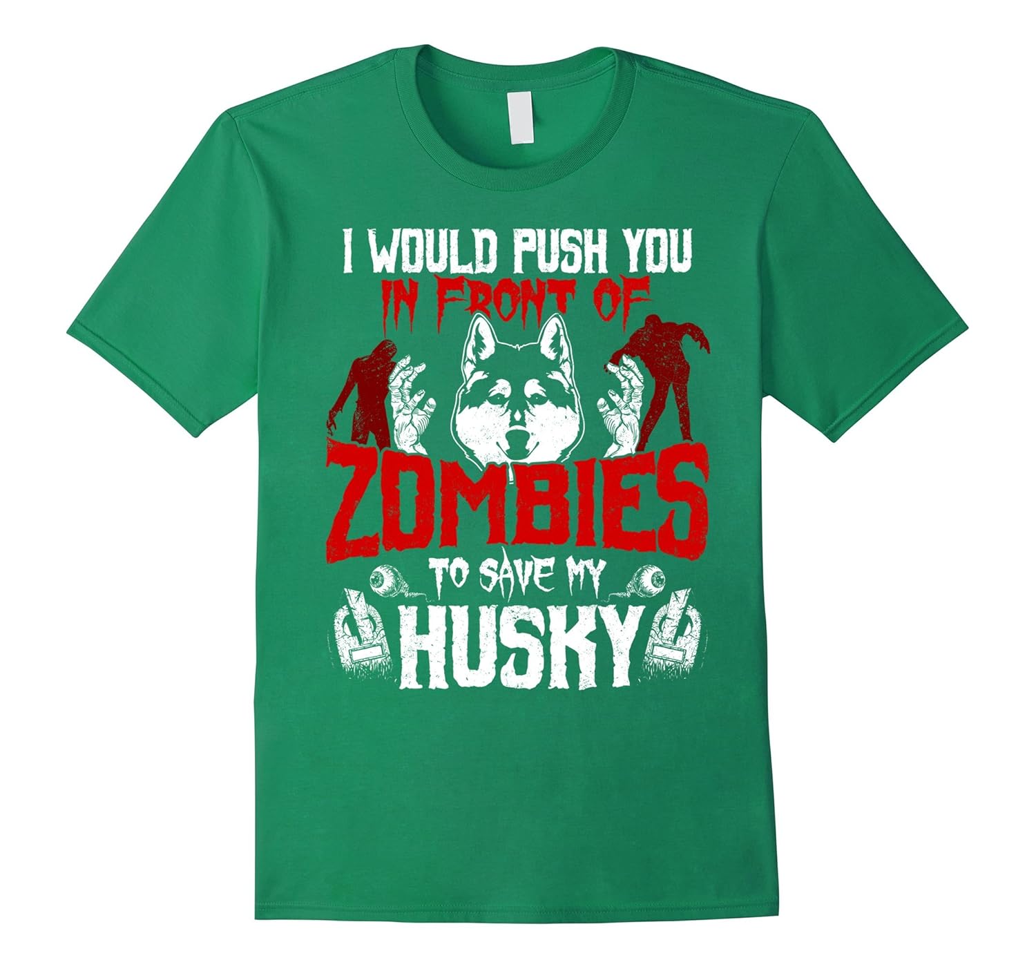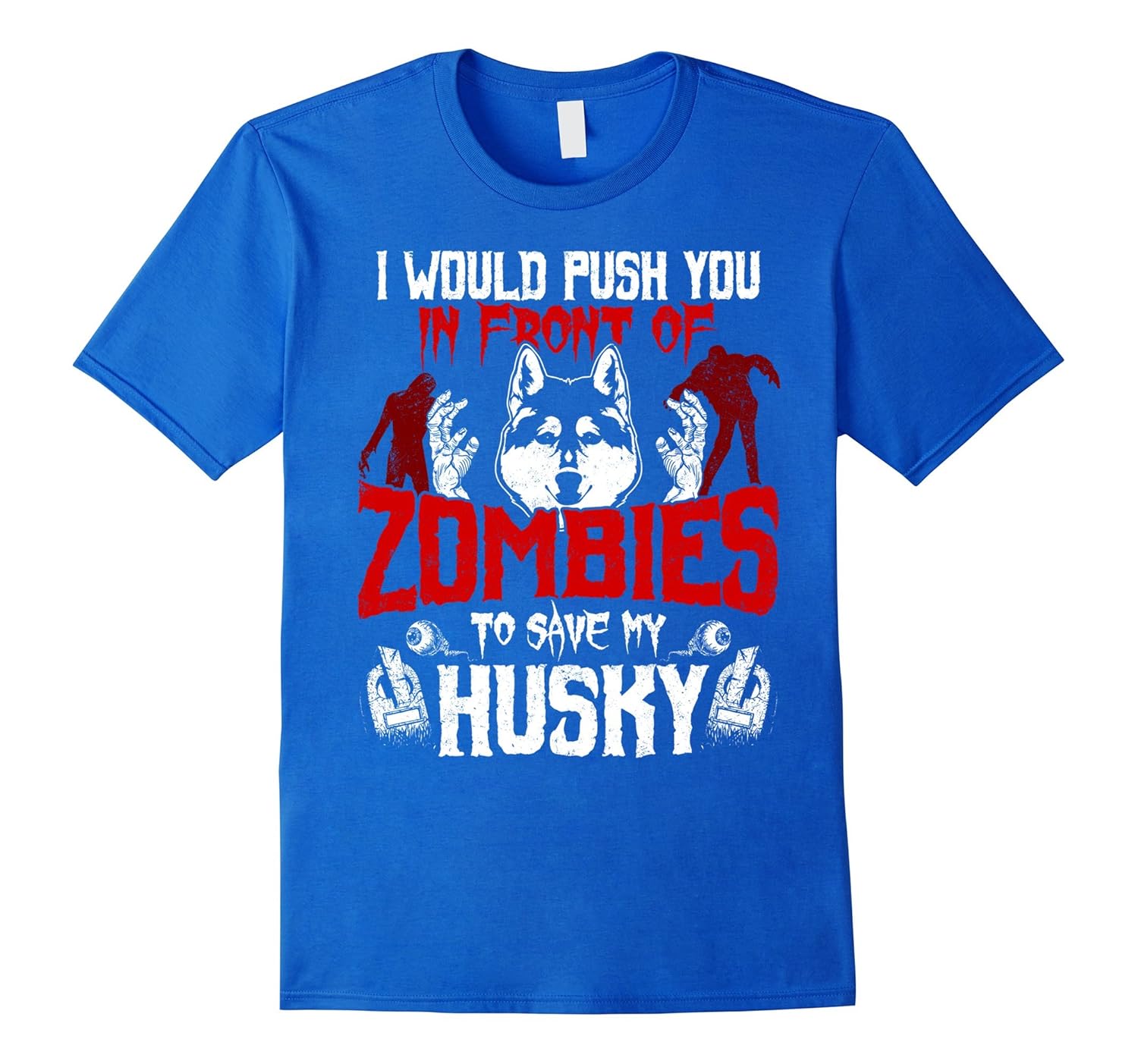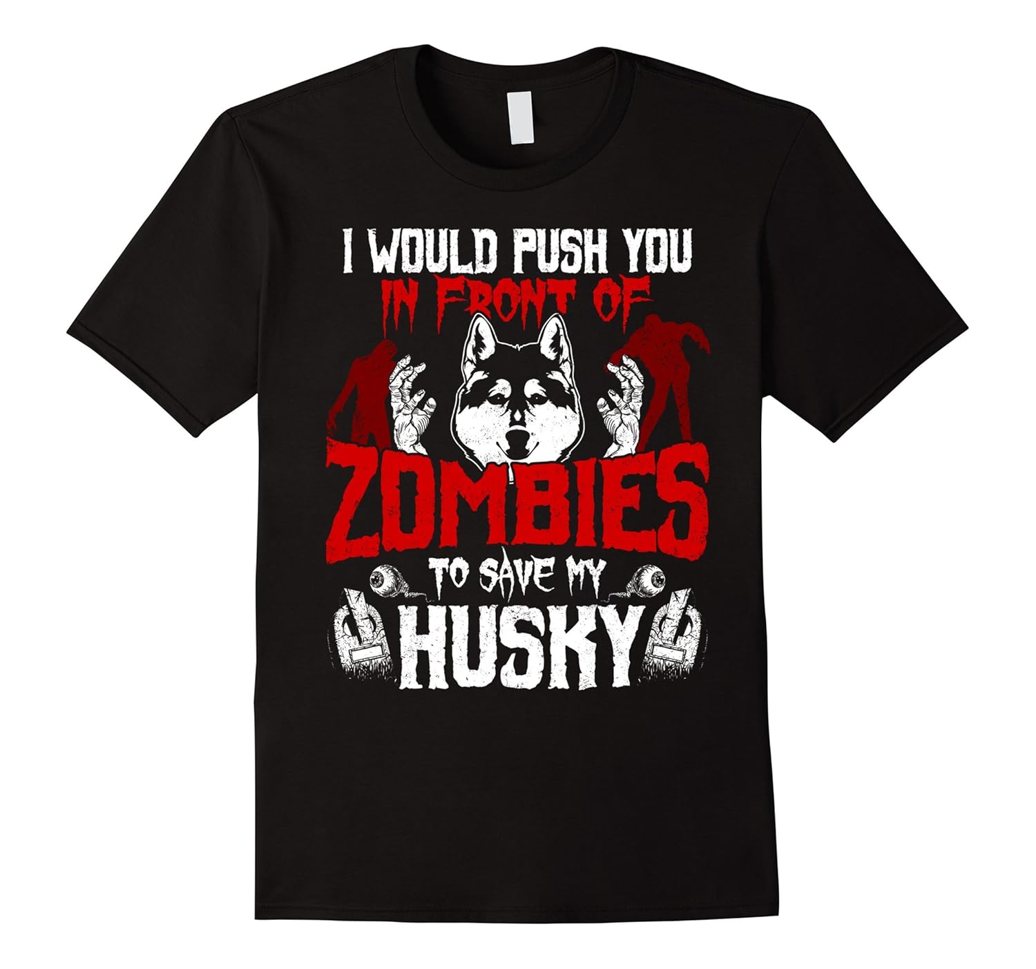 Solid colors: 100% Cotton; Heather Grey: 90% Cotton, 10% Polyester; All Other Heathers: 65% Cotton, 35% Polyester; Imported; Machine wash cold with like colors, dry low heat; This I Would Push You In Front Of Zombies To Save My Husky T-shirt is the perfect gift for Husky lovers, Husky Owners. Funny and Humorous Tees for anyone who has a big love for animals. It also makes a great costume for Halloween 31st October night.; This T-shirt is sure to make everyone smile if you wear it to Halloween party. Not just Halloween but also perfect for World Appreciation Day, Birthdays, Christmas, Thanksgiving, Back to school or any special occasions.; Lightweight, Classic fit, Double-needle sleeve and bottom hem