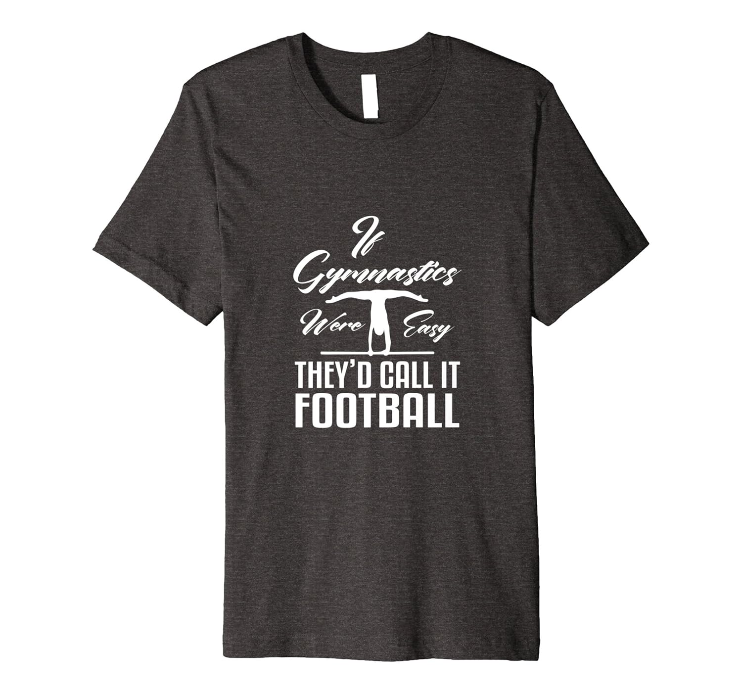 Solid colors: 100% Cotton; Heather Grey: 90% Cotton, 10% Polyester; All Other Heathers: 58% Cotton, 42% Polyester; Imported; Machine wash cold with like colors, dry low heat; This design is for gymnasts. Gymnastics are HARD as heck, and require a ton of muscle – even more than football. Not just anyone can do gym, but anyone can do football.; Makes a gift for birthdays, Valentines Day, anniverisaries, graduations, Fathers Day, Mothers Day, party outfit, Christmas, game days, and any holiday!; This premium t-shirt is made of lightweight fine jersey fabric; Fit: Slim (consider ordering a larger size for a looser fit)