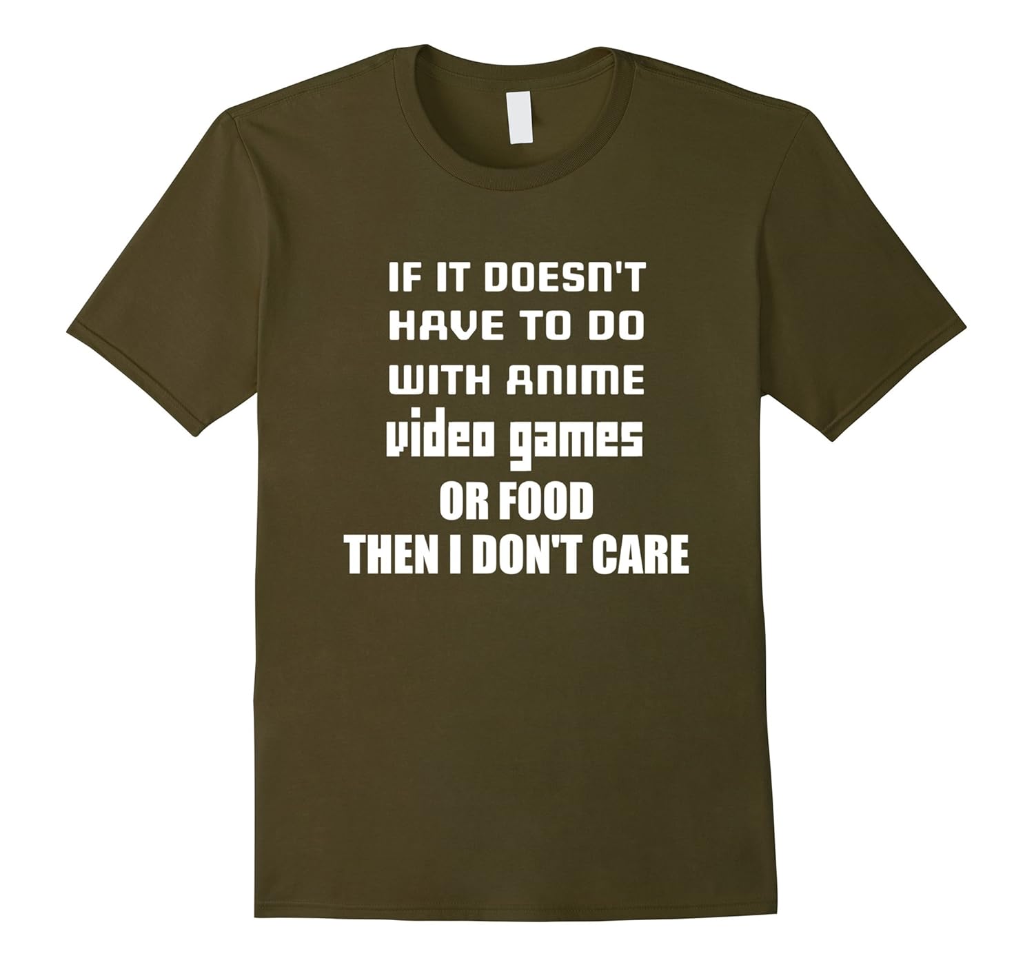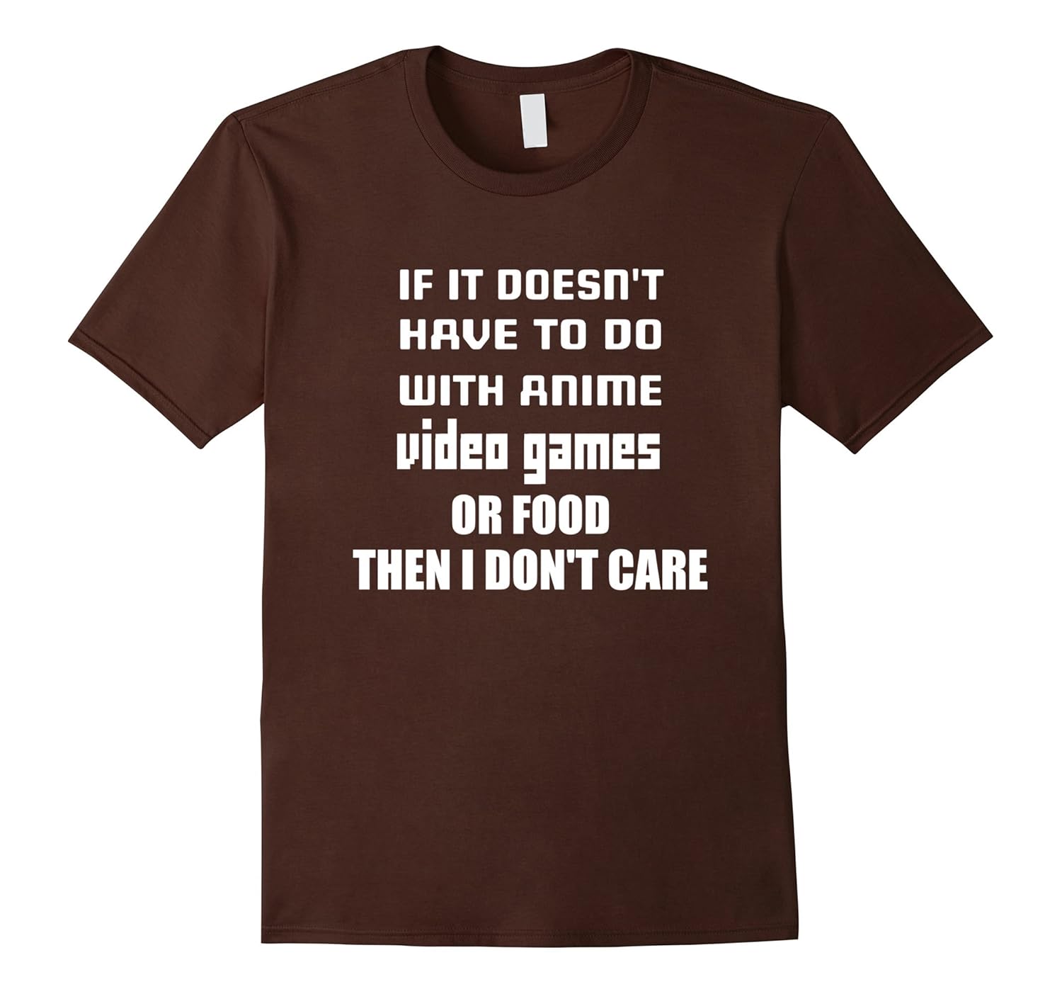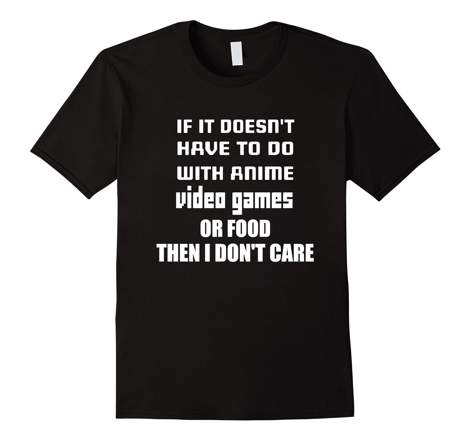 100% Cotton, Imported, Machine wash cold with like colors, dry low heat, Funny t shirt for anime or video game fans: If it doesn”t have to do with anime, video games or food, then I don”t care. In men”s, women”s and youth sizes for your choice and comfort. This tee is perfect for a birthday, Christmas, graduation, or other gift giving occasions. Lightweight, Classic fit, Double-needle sleeve and bottom hem