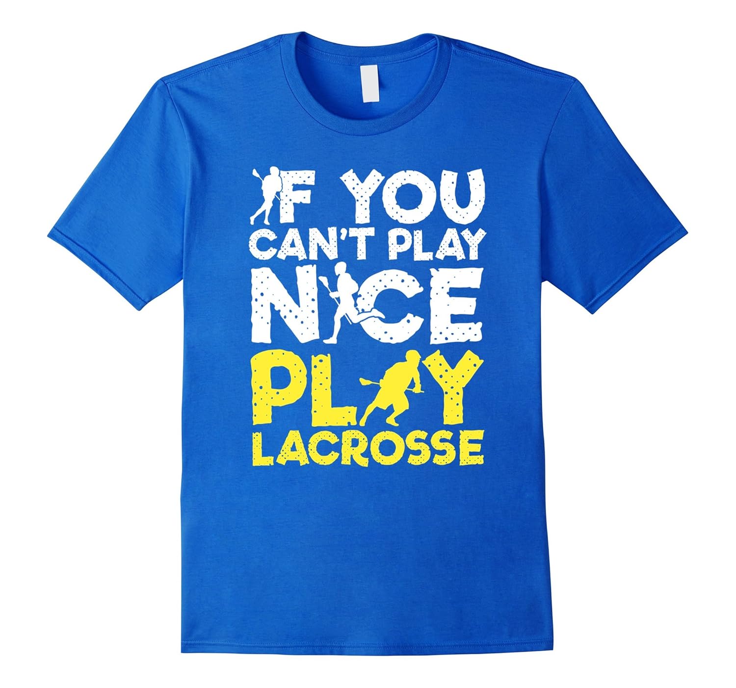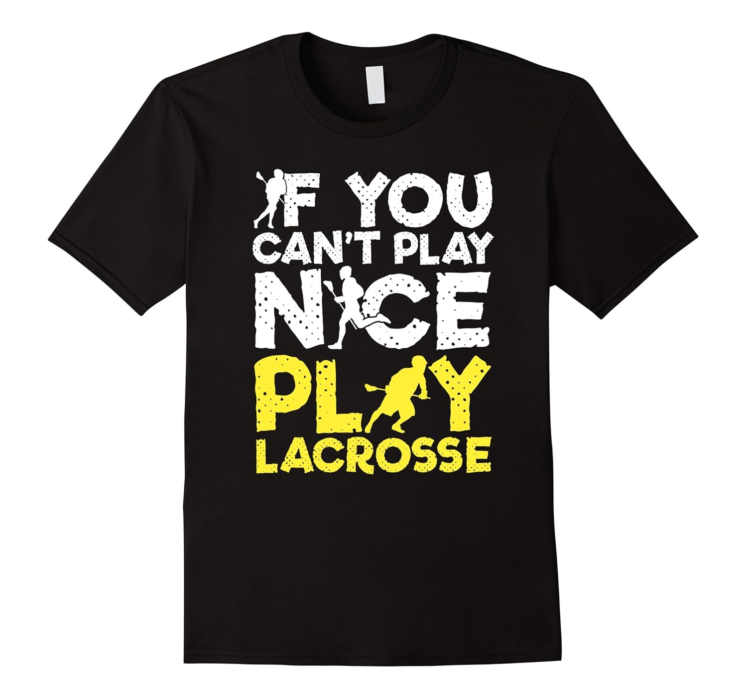 Solid colors: 100% Cotton; Heather Grey: 90% Cotton, 10% Polyester; All Other Heathers: 65% Cotton, 35% Polyester, Imported, Machine wash cold with like colors, dry low heat, If play nice until you”re playing lacrosse, then this shirt is for you! Whether you”re playing goalie, defense or are an attacker, show your pride at being an awesome lacrosse player! Get this shirt and add it to your gear bag with your stick!, Lacrosse clothes makes a perfect gift for goalies or any other player who grabs their stick and heads to the field with the American flag flying overhead! This novelty gift is perfect for men and boys!, Lightweight, Classic fit, Double-needle sleeve and bottom hem