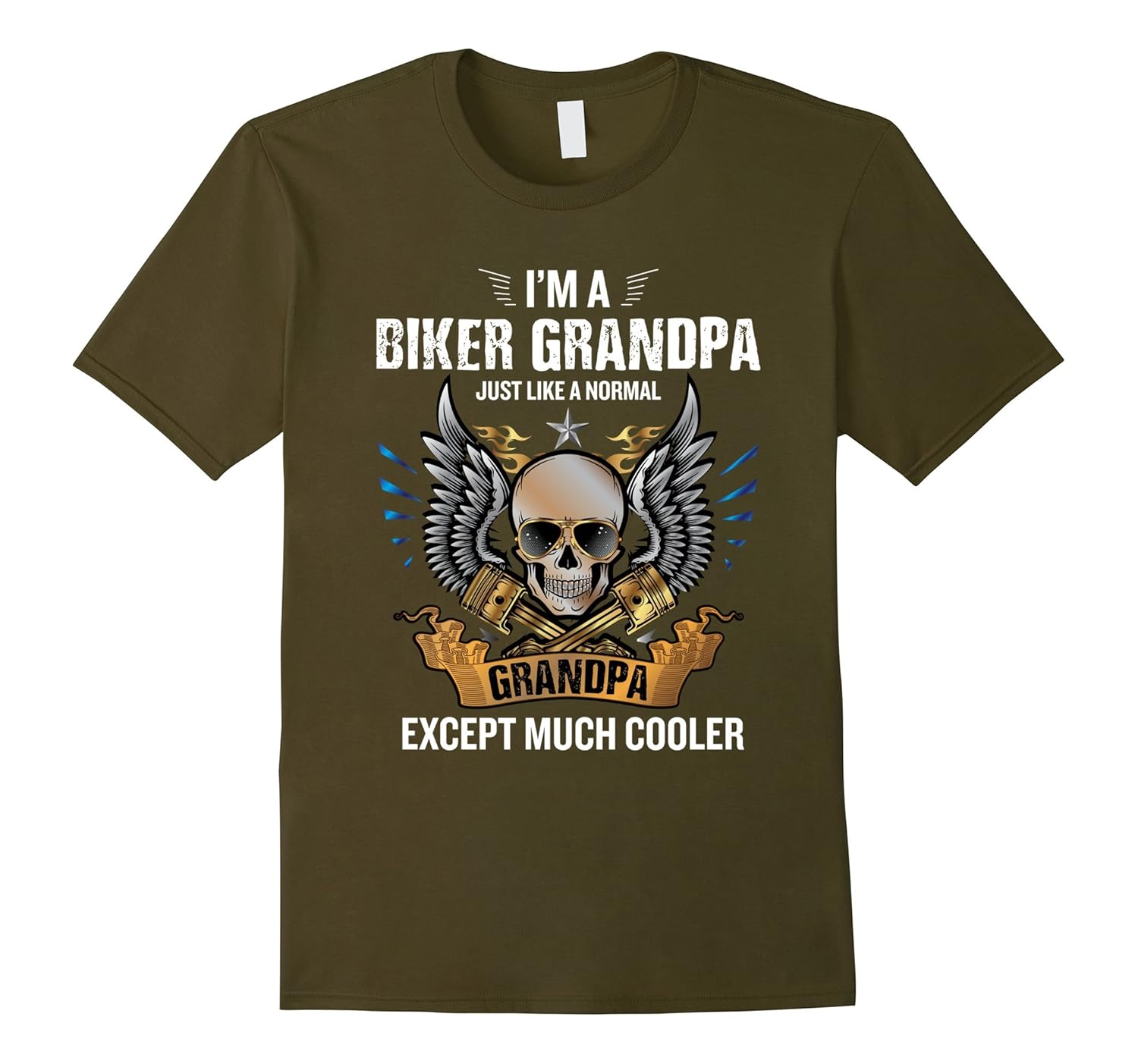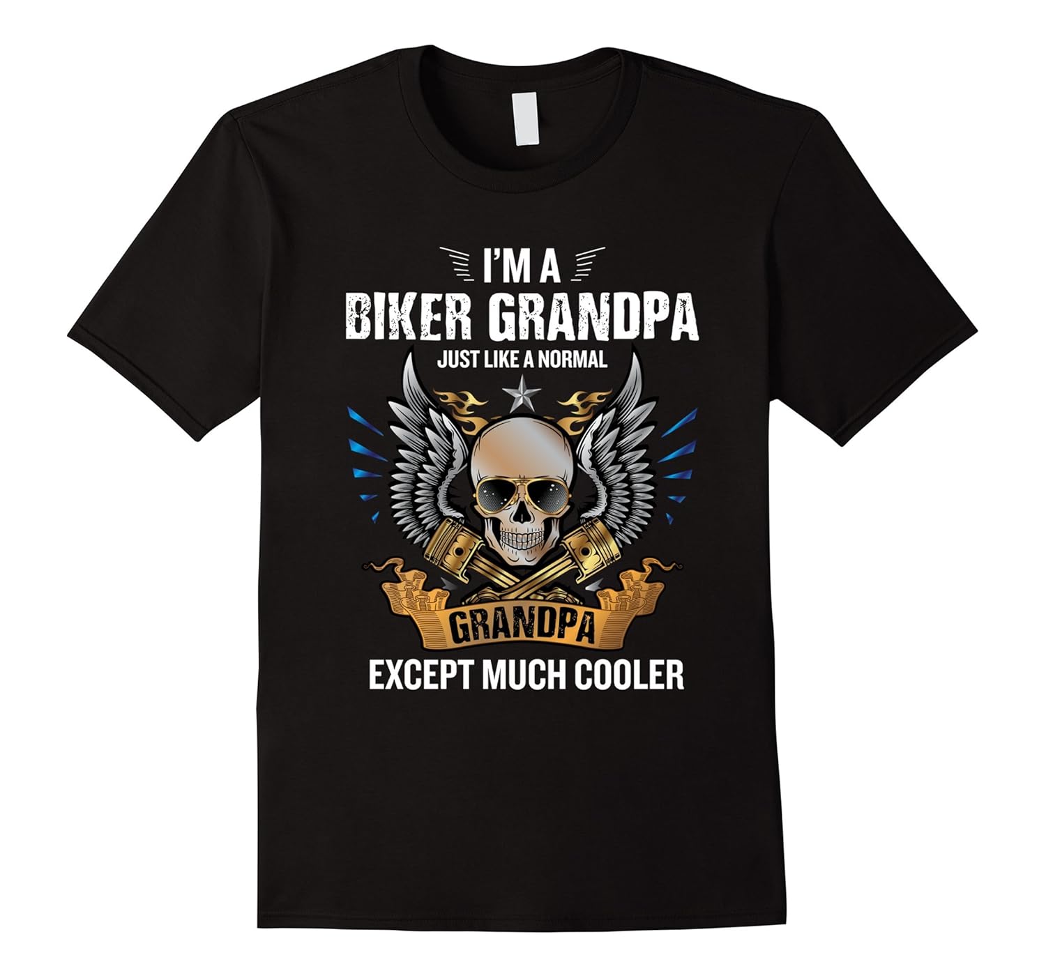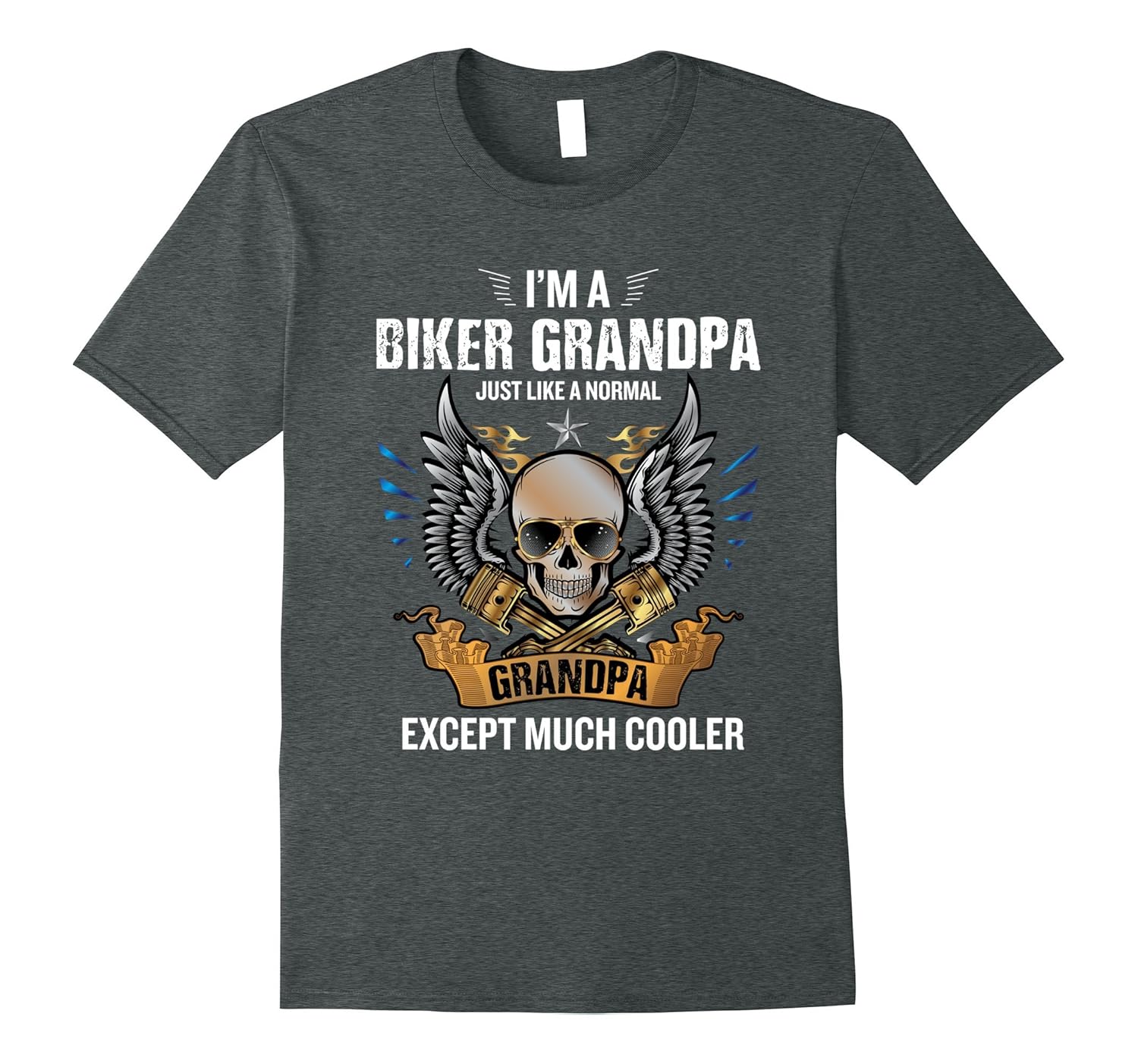Solid colors: 100% Cotton; Heather Grey: 90% Cotton, 10% Polyester; All Other Heathers: 65% Cotton, 35% Polyester, Imported, Machine wash cold with like colors, dry low heat, Get your humor mode on with this awesome print top that reads “I”m A Biker Grandpa Just Like A Normal Grandpa Except Much Cooler” in distressed English style with an image of a skull wearing sunglasses shades!, A great gag present or a funny birthday gift idea for your dad, brother, uncle, nephew, grandpa, old man, motorcyclists and; bikers! Guaranteed to turn heads, this tshirt makes a great gift to a bike collector, family or friends!, Lightweight, Classic fit, Double-needle sleeve and bottom hem