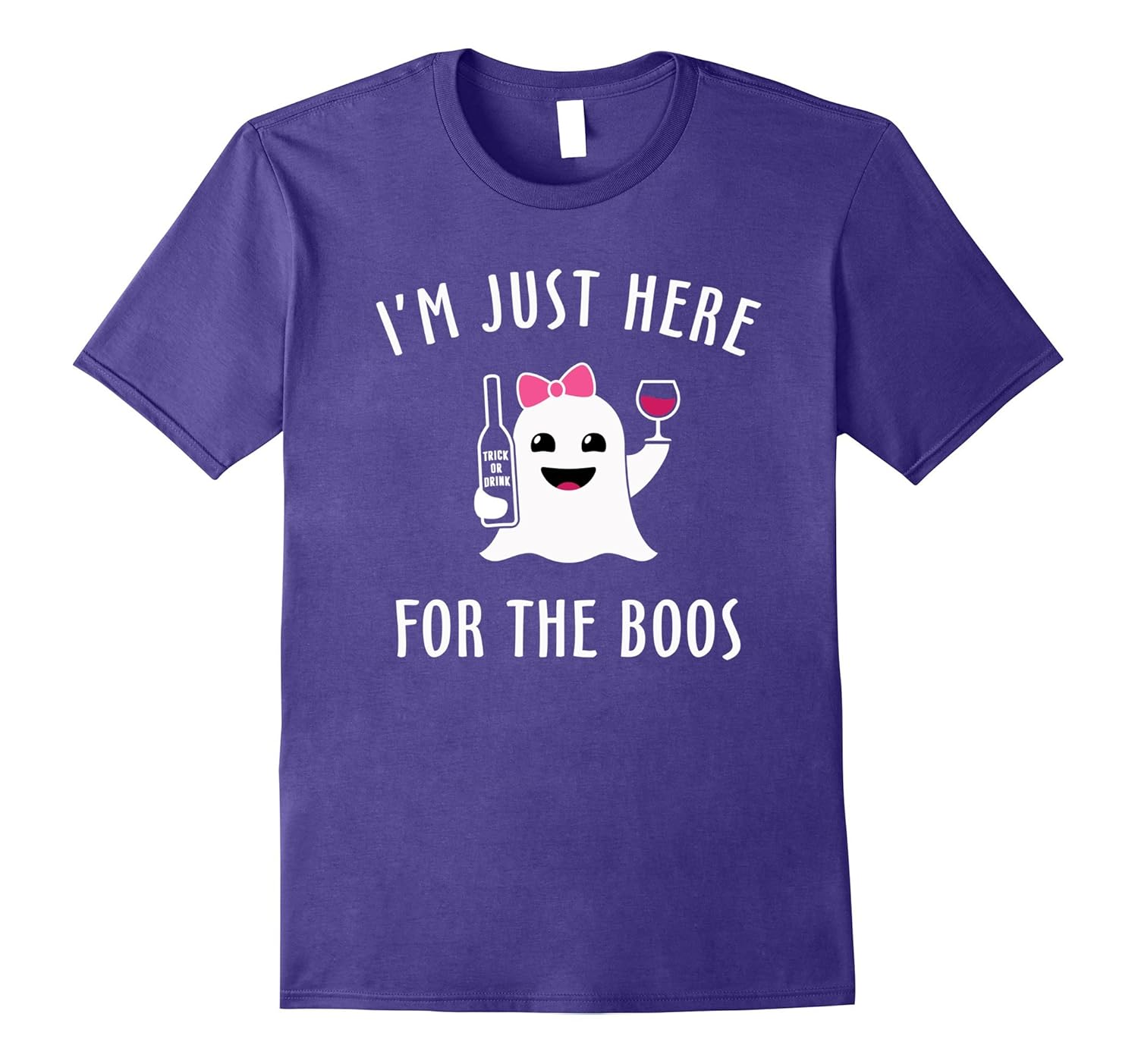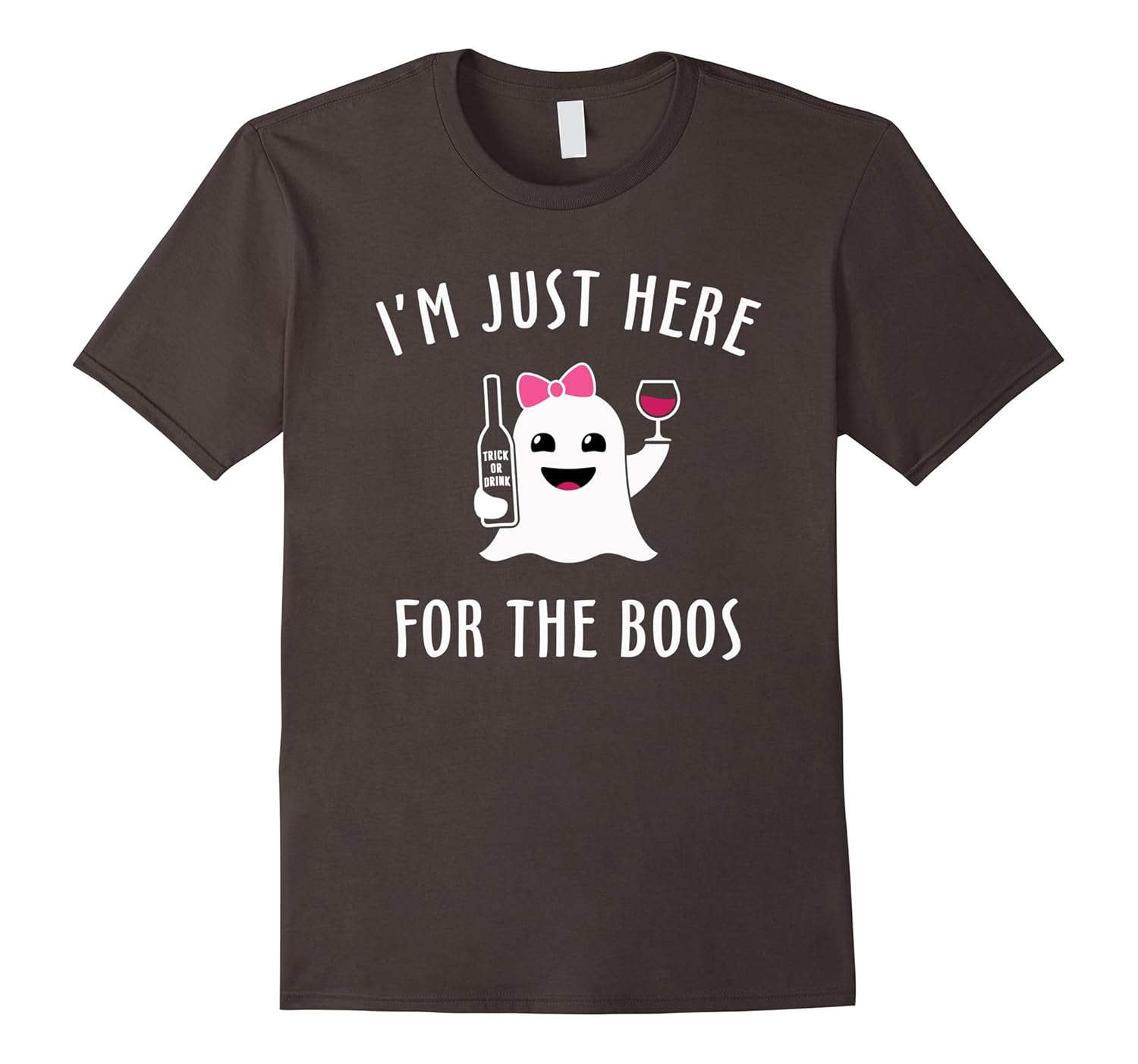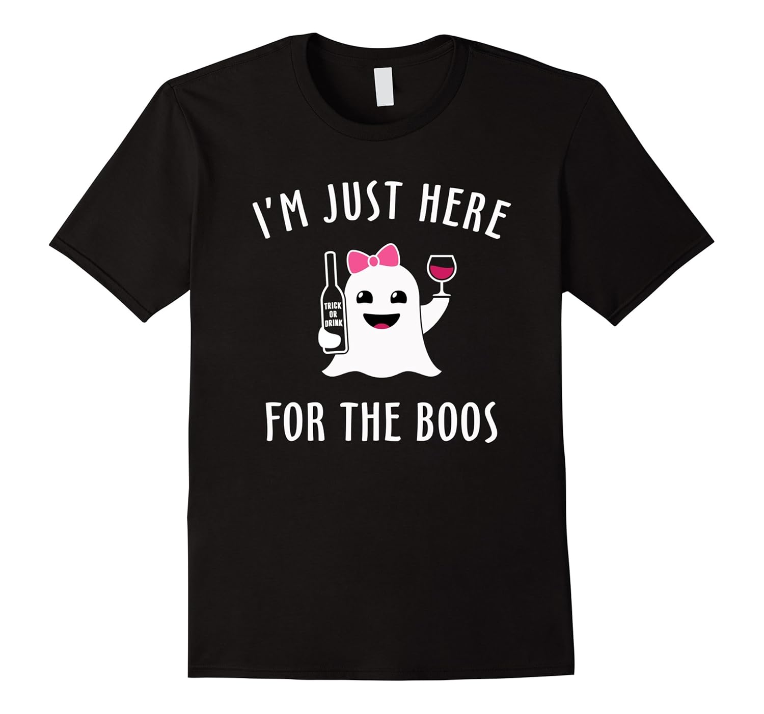 Solid colors: 100% Cotton; Heather Grey: 90% Cotton, 10% Polyester; All Other Heathers: 50% Cotton, 50% Polyester; Imported; Machine wash cold with like colors, dry low heat; Cute ghost emoji wearing pink bow, holding Trick Or Drink bottle and a glass of wine. Hilarious Halloween party tee shirt for ladies.; Lightweight, Classic fit, Double-needle sleeve and bottom hem