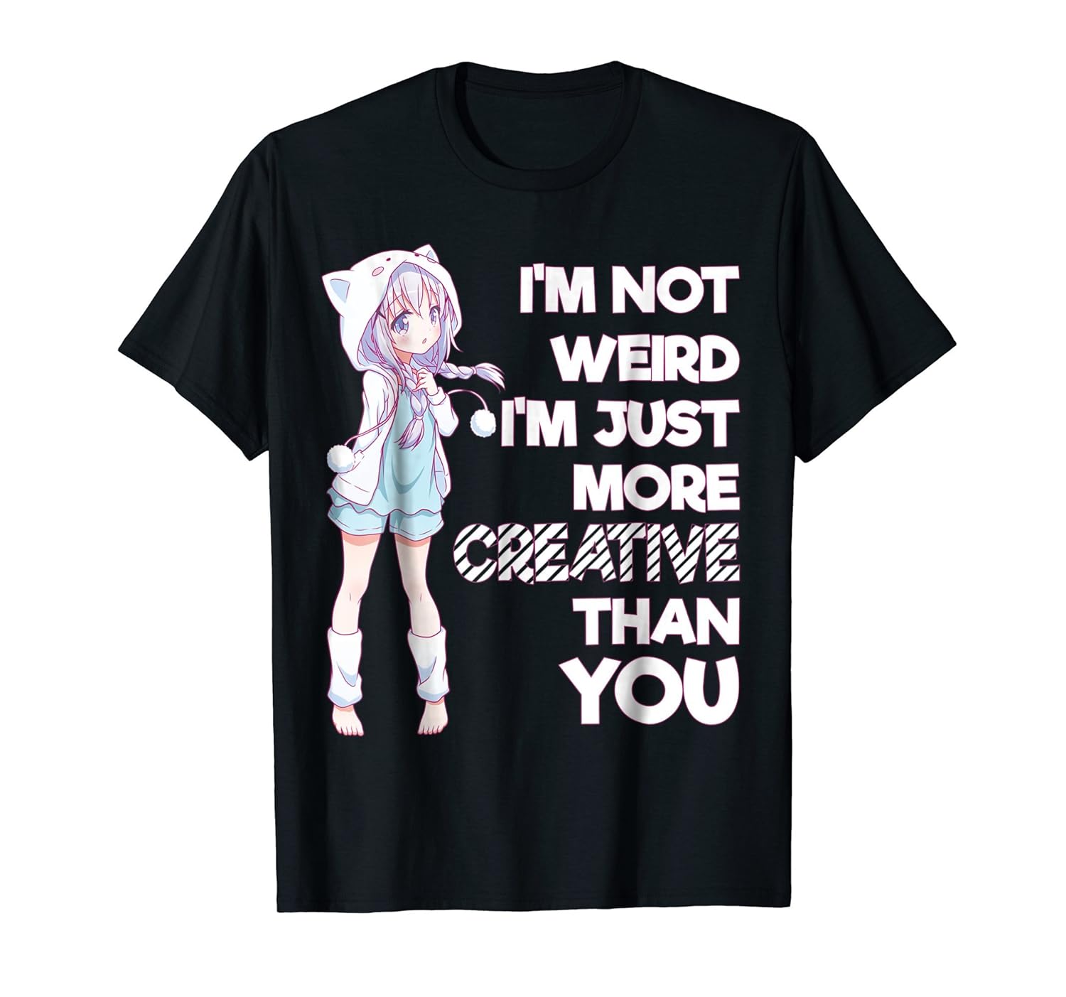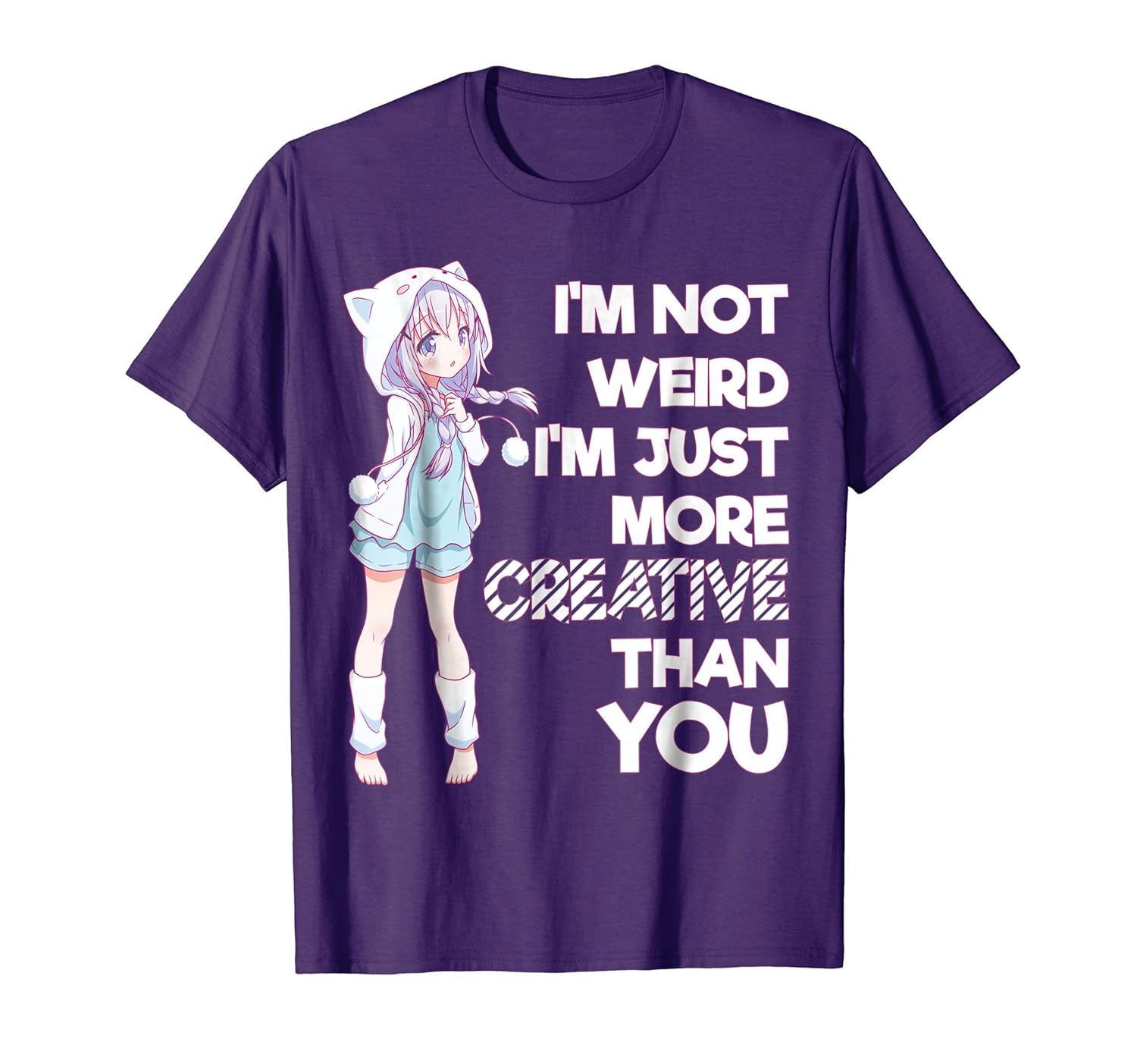 Solid colors: 100% Cotton; Heather Grey: 90% Cotton, 10% Polyester; All Other Heathers: 50% Cotton, 50% Polyester; Imported; Machine wash cold with like colors, dry low heat; Im Not Weird Im Creative Anime Inspirational TShirt; IM NOT WEIRD Im just more creative than you. Great gift tee for the anime lover, someone who loves reading graphic novels and manga series. This design displays anti-bullying and creativity messages that are great for the anime introvert who loves life; Lightweight, Classic fit, Double-needle sleeve and bottom hem