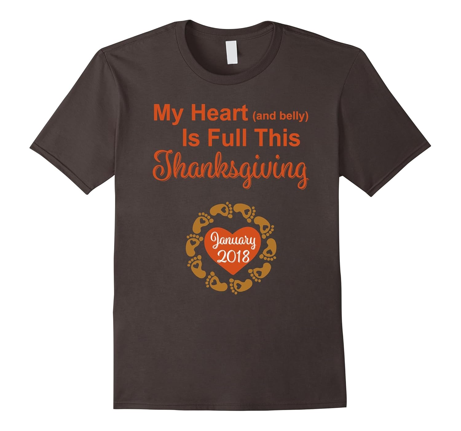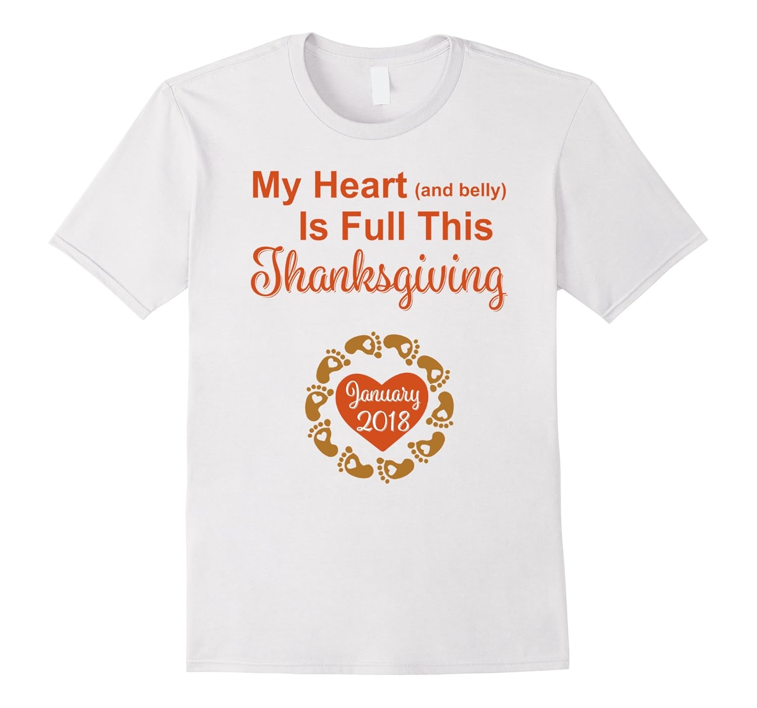 Solid colors: 100% Cotton; Heather Grey: 90% Cotton, 10% Polyester; All Other Heathers: 65% Cotton, 35% Polyester, Imported, Machine wash cold with like colors, dry low heat, Funny 2017 Thanksgiving pregnancy announcement tshirt with baby footprints for the new mom to be. Cute way to let people know you are pregnant and expecting a baby in January 2018. My heart (and belly) is full this Thanksgiving January 2018. Perfect tshirt for a Thanksgiving pregnancy announcement. Unique keepsake for your child too. Lightweight, Classic fit, Double-needle sleeve and bottom hem