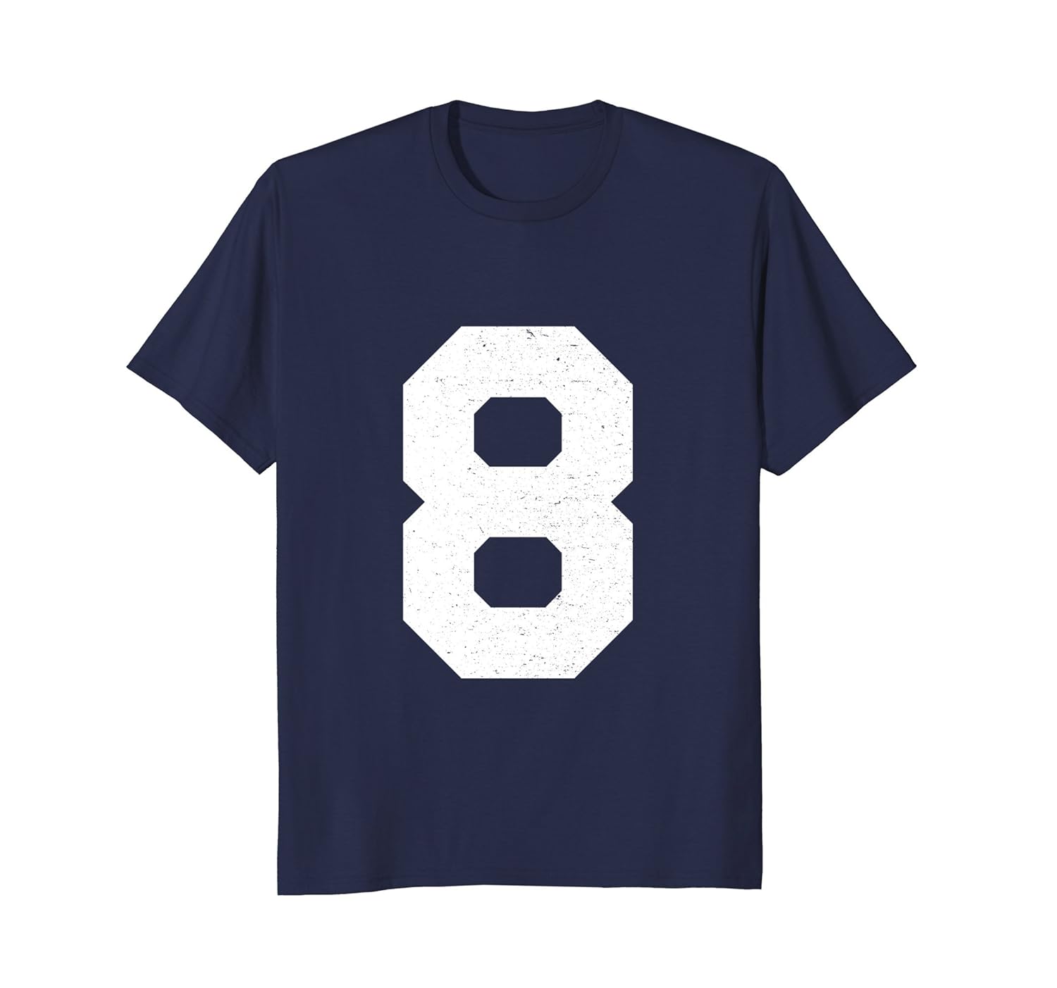 Solid colors: 100% Cotton; Heather Grey: 90% Cotton, 10% Polyester; All Other Heathers: 50% Cotton, 50% Polyester; Imported; Machine wash cold with like colors, dry low heat; A fun and stylish shirt with the number eight in big, bold distressed lettering. Great for sporting events, teams, uniforms, or if it is your favorite lucky number. Is it for a birthday or what does it mean?; The perfect gag gift t-shirt for friends and family who enjoy sports like baseball and football. Also great for a birthday. This classic fashion numbered jersey style will always be cool!; Lightweight, Classic fit, Double-needle sleeve and bottom hem