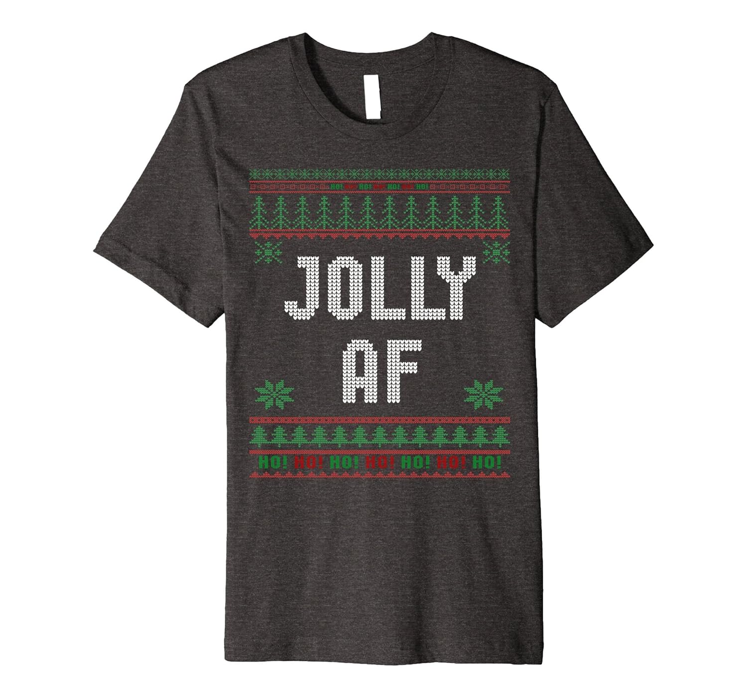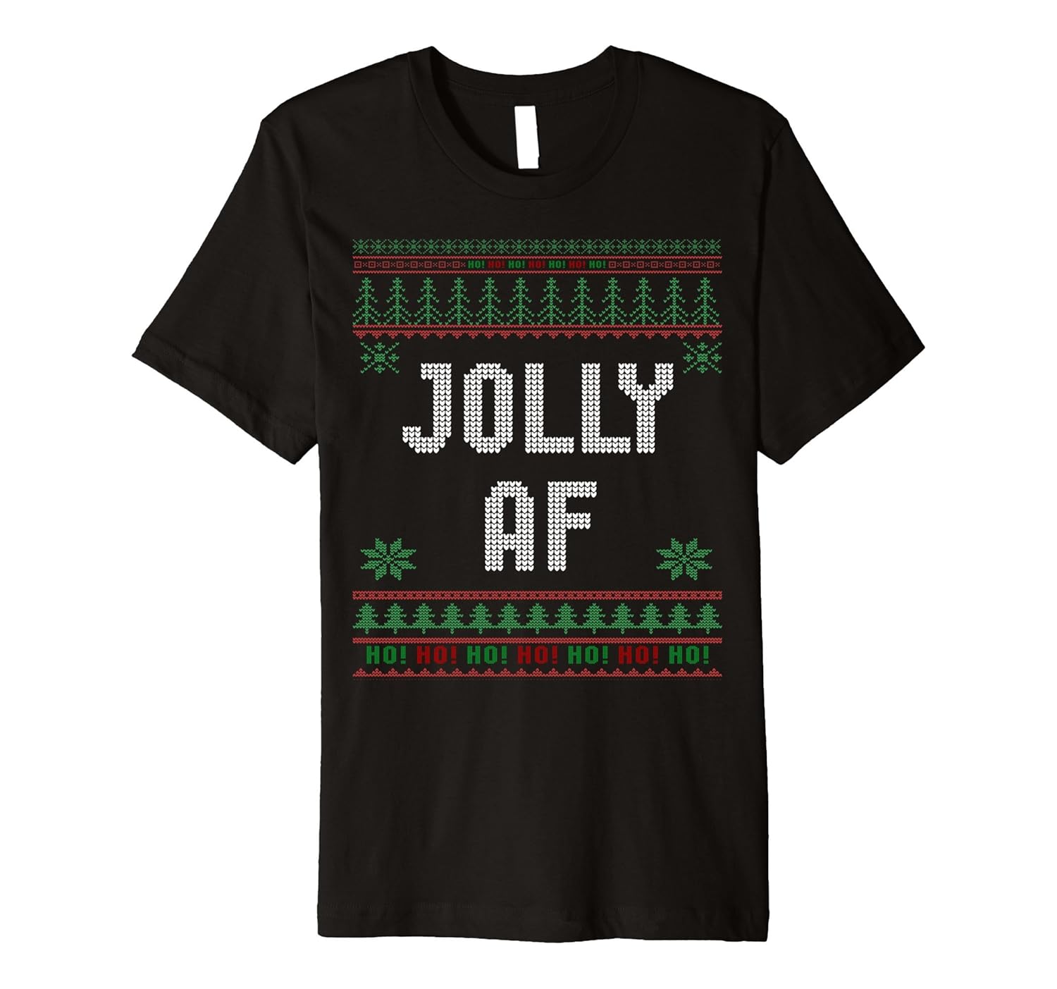 Solid colors: 100% Cotton; Heather Grey: 90% Cotton, 10% Polyester; All Other Heathers: 58% Cotton, 42% Polyester; Imported; Machine wash cold with like colors, dry low heat; Funny Jolly AF Ugly Christmas Sweater style tshirt. Custom design great for xmas holiday present or a Secret Santa gag gift; Fit: Slim (consider ordering a larger size for a looser fit); Custom graphic tee designed to look like an ugly Christmas sweater; This premium t-shirt is made of lightweight fine jersey fabric