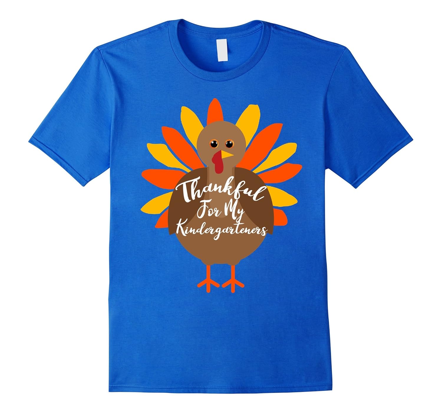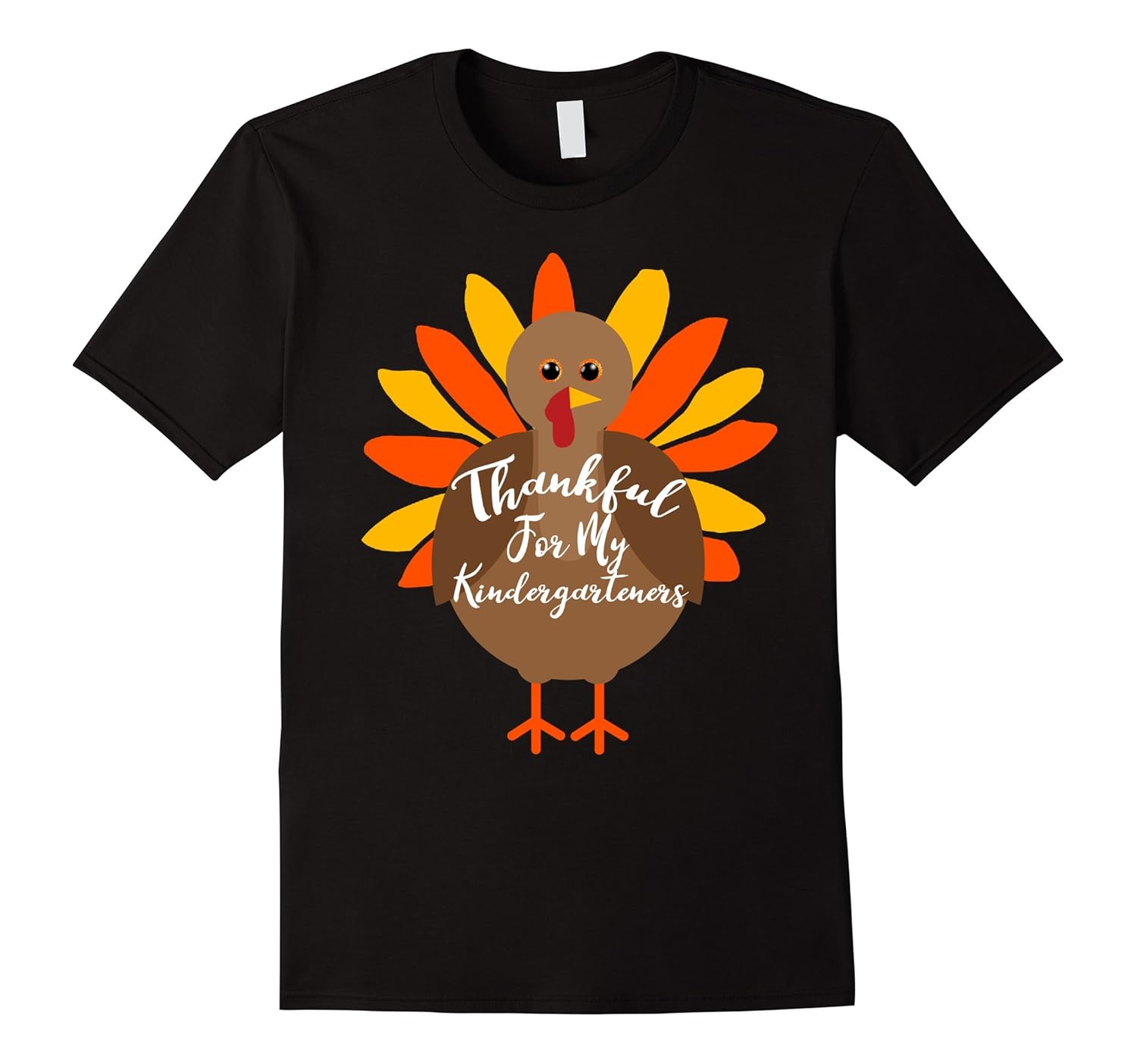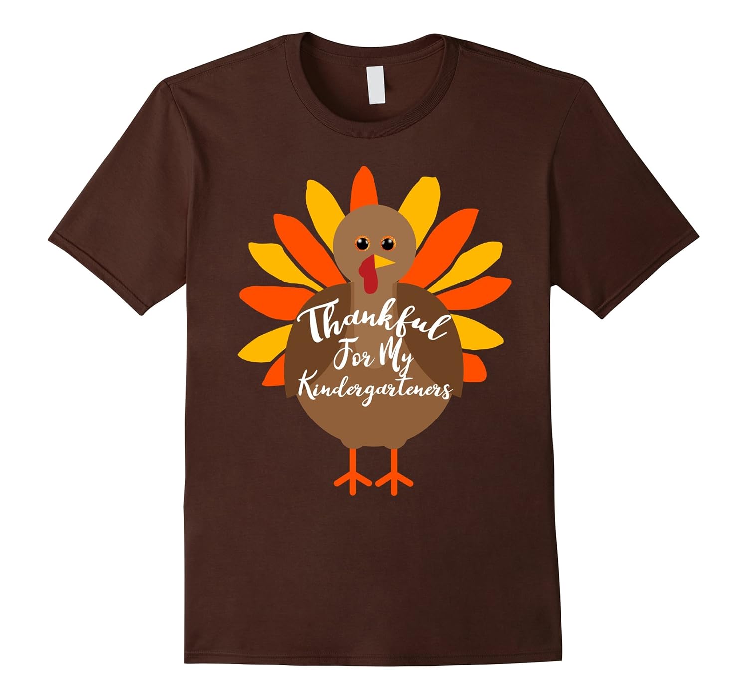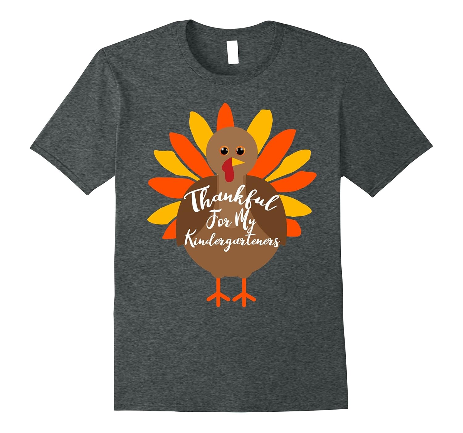 Solid colors: 100% Cotton; Heather Grey: 90% Cotton, 10% Polyester; All Other Heathers: 65% Cotton, 35% Polyester; Imported; Machine wash cold with like colors, dry low heat; Thankful For My Kindergarteners. Wear it to a school Thanksgiving party or event.; Cute turkey with bright colored feathers.; Lightweight, Classic fit, Double-needle sleeve and bottom hem