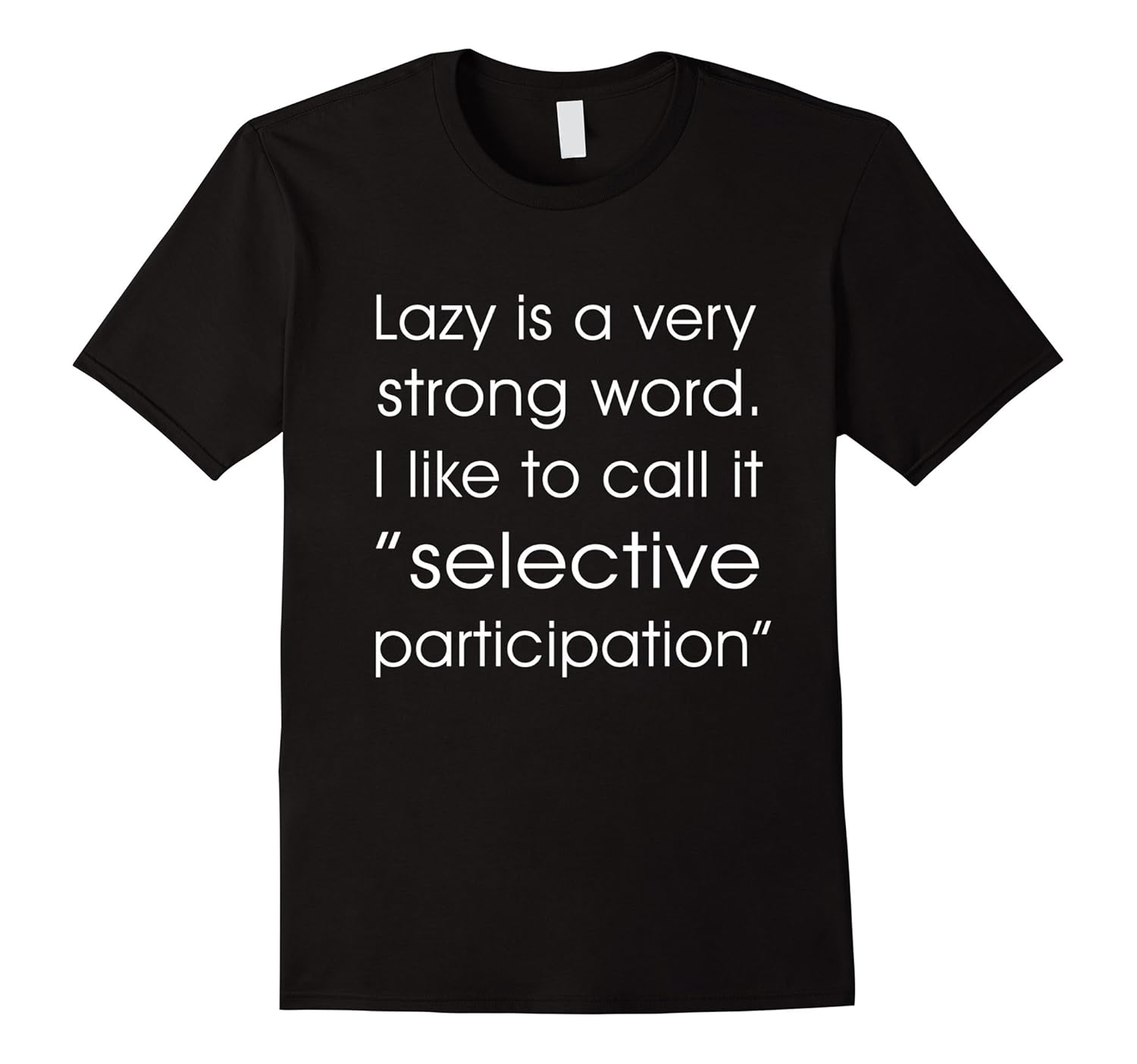 Solid colors: 100% Cotton; Heather Grey: 90% Cotton, 10% Polyester; All Other Heathers: 65% Cotton, 35% Polyester, Imported, Machine wash cold with like colors, dry low heat, Lazy is a very strong word. I like to call it “selective participation”, Lightweight, Classic fit, Double-needle sleeve and bottom hem