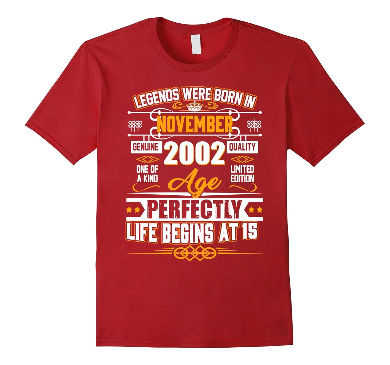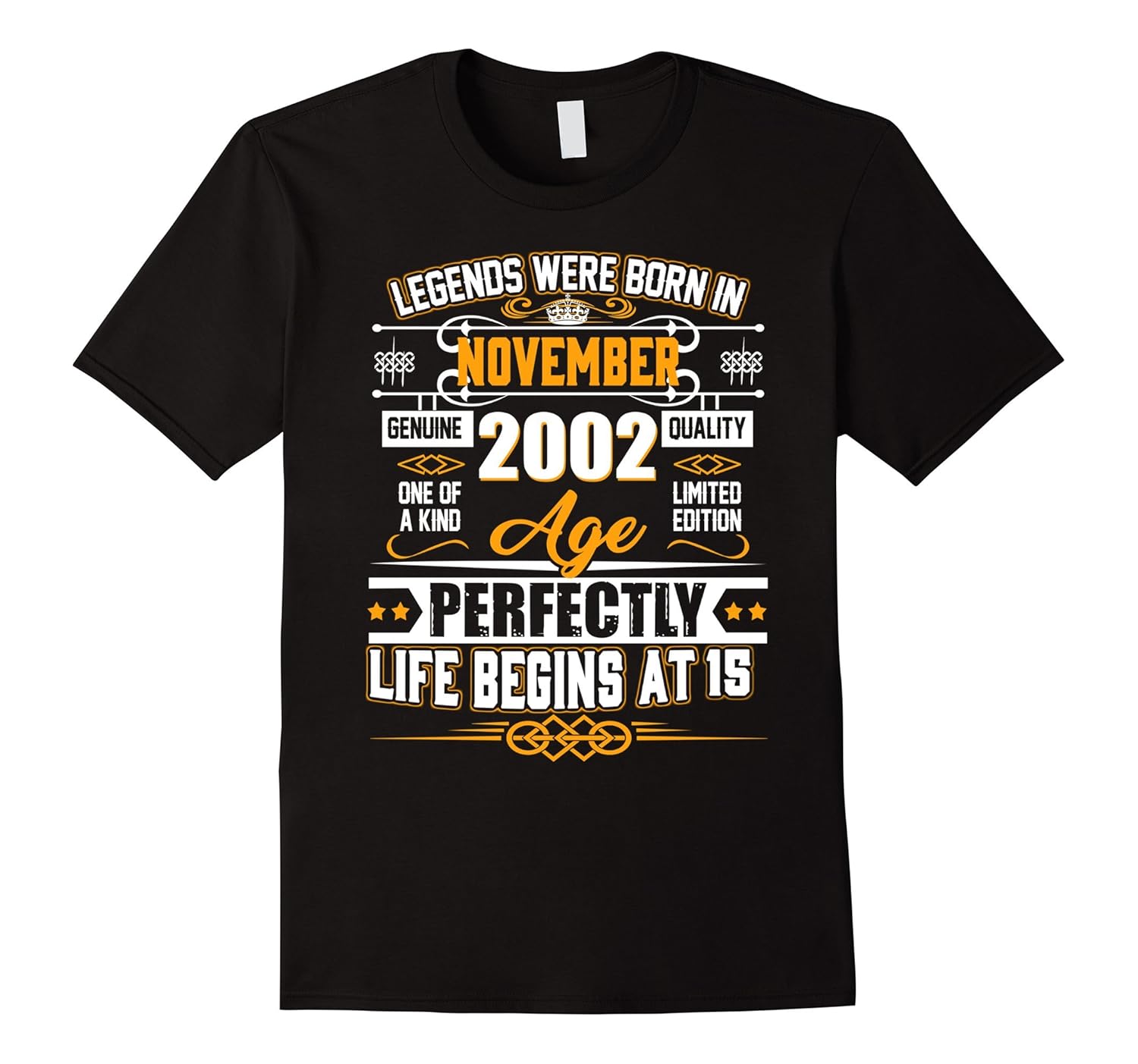 Solid colors: 100% Cotton; Heather Grey: 90% Cotton, 10% Polyester; All Other Heathers: 65% Cotton, 35% Polyester, Imported, Machine wash cold with like colors, dry low heat, Born in 2002 tshirt, 15th birthday tshirts for woman 2002, 15th birthday tshirts for men 2002, birthday November t-shirts, November birthday tshirt gift for her or him, ideas for 15th birthday, 15th birthday shirt, 15th birthday gifts, A great gift idea for a lucky person born in 2002. Awesome since 2002, Perfectly 15th Birthday Gift, 15 years of being awesome shirt, born in November, born in November 2002, born in November 2002 shirt, November 2002 birthday, Lightweight, Classic fit, Double-needle sleeve and bottom hem