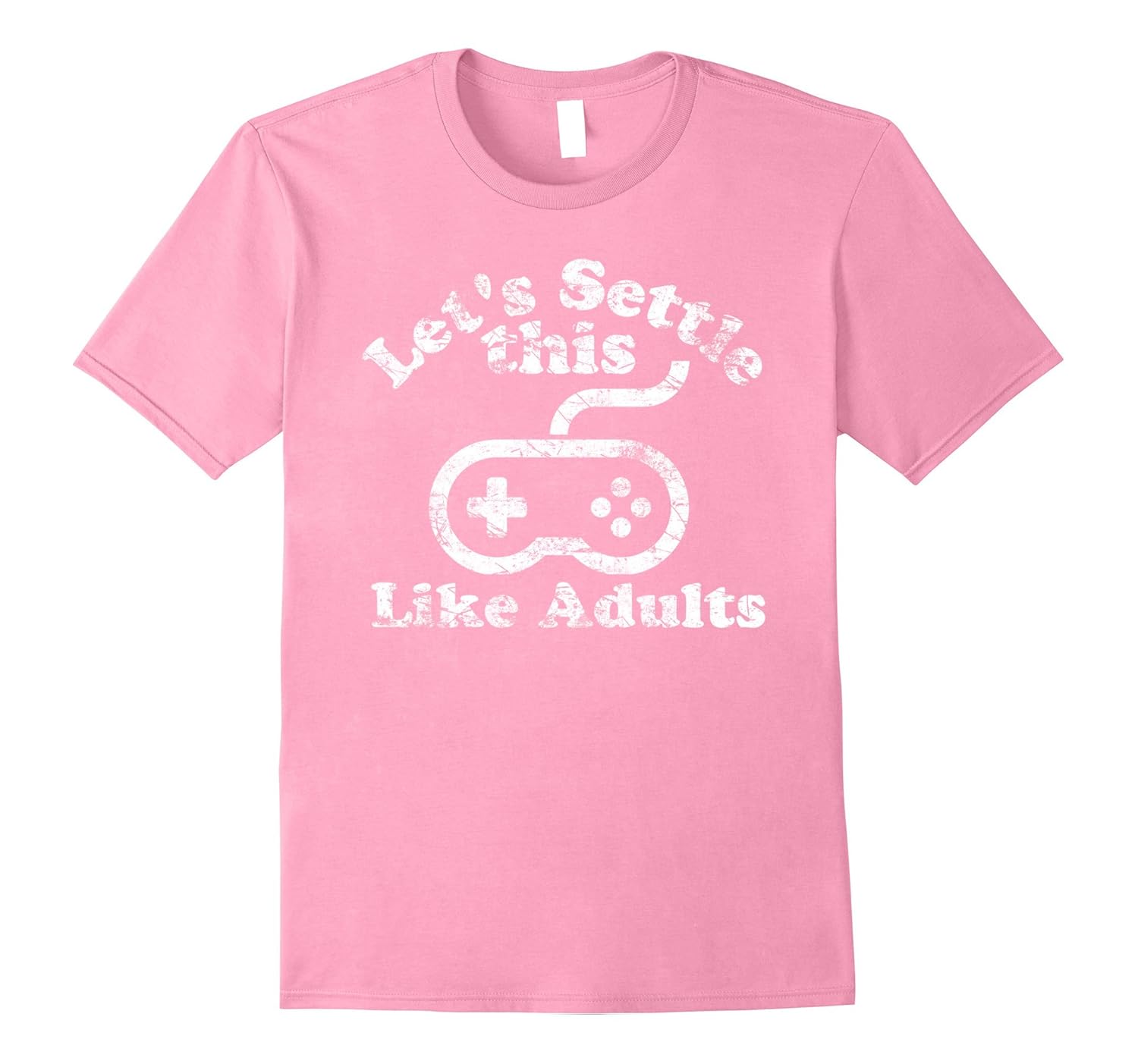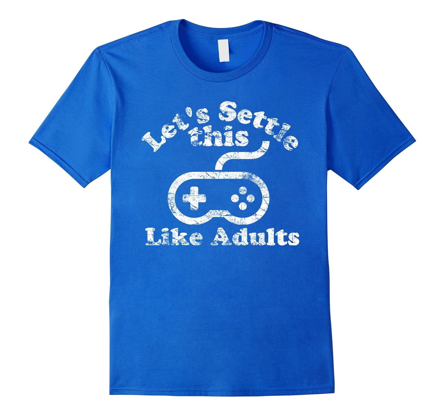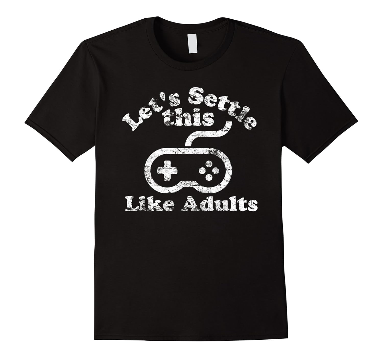 Solid colors: 100% Cotton; Heather Grey: 90% Cotton, 10% Polyester; All Other Heathers: 65% Cotton, 35% Polyester, Imported, Machine wash cold with like colors, dry low heat, Features a large distressed design on the front of the shirt with the words “Let”s Settle This Like Adults” with a game controller. Making important decisions got you down. Do it the traditional way, like when we were kids, with a video game. Lightweight, Classic fit, Double-needle sleeve and bottom hem
