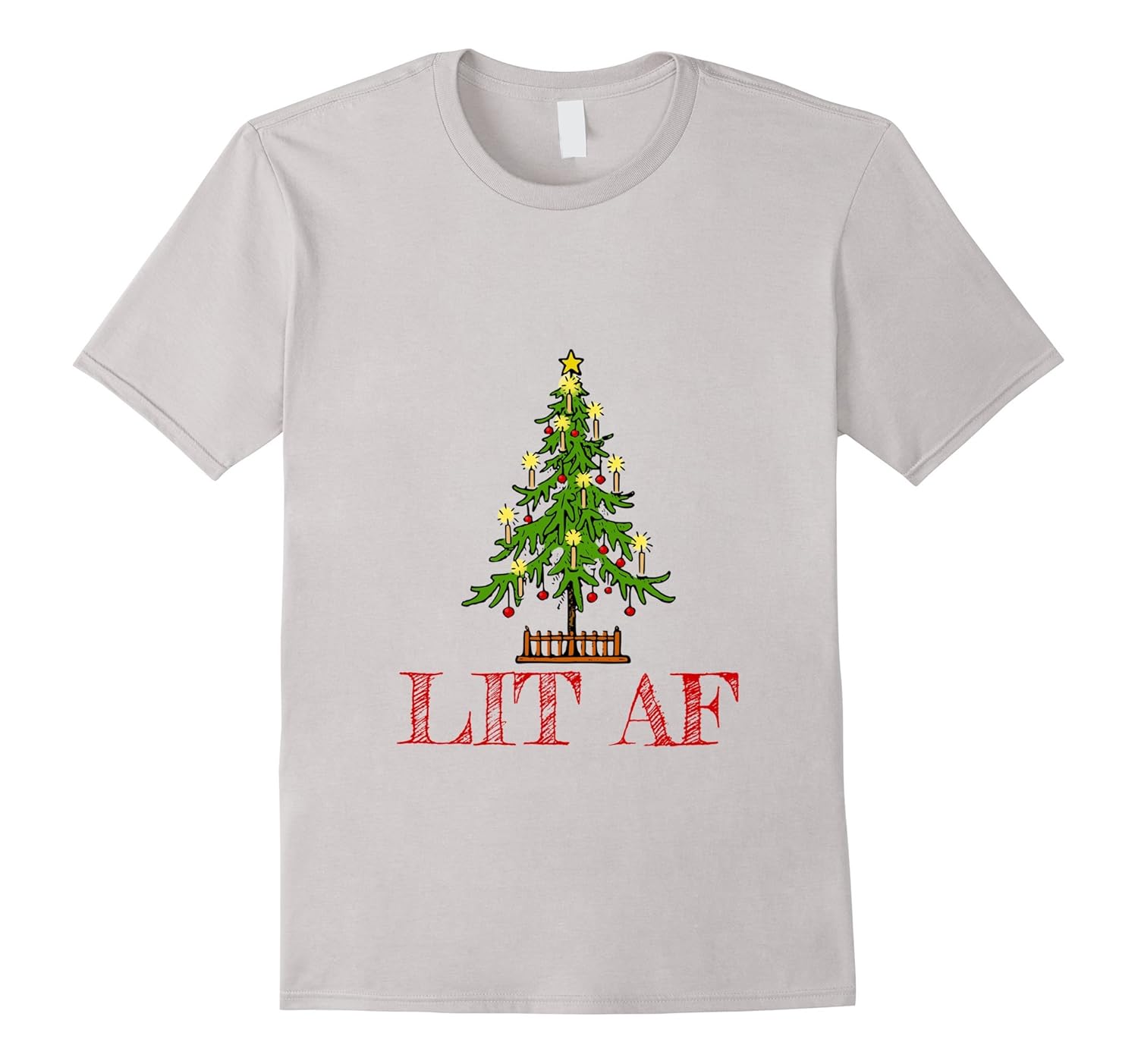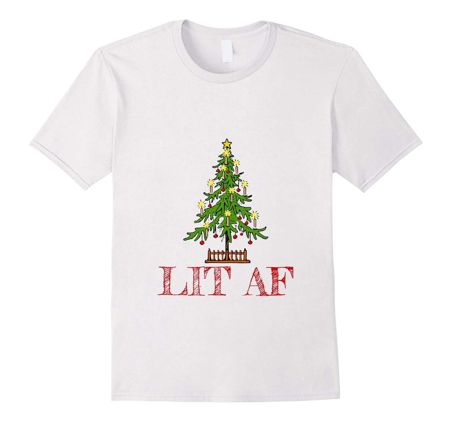 Solid colors: 100% Cotton; Heather Grey: 90% Cotton, 10% Polyester; All Other Heathers: 65% Cotton, 35% Polyester; Imported; Machine wash cold with like colors, dry low heat; If Christmas is the season for you to light the tree up and get lit af, then this shirt is for you! Funny play on words makes this t-shirt perfect for an ugly sweater holiday party, or an office get together with beer, wine, or cocktails.; Show your Christmas spirit with this hilarious Lit AF tee. Perfect gift for friends or family who are Christmas lighting and party pros. If your place is lit this shirt is for you!; Lightweight, Classic fit, Double-needle sleeve and bottom hem