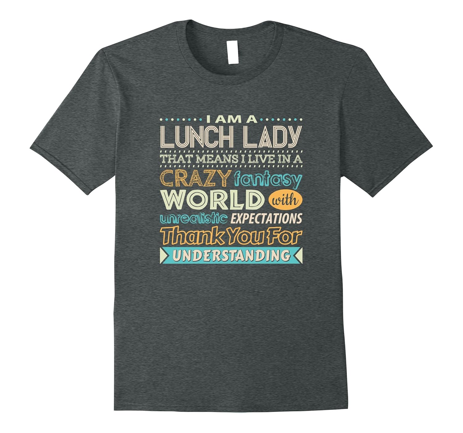 Solid colors: 100% Cotton; Heather Grey: 90% Cotton, 10% Polyester; All Other Heathers: 65% Cotton, 35% Polyester, Imported, Machine wash cold with like colors, dry low heat, I Am A Lunch Lady That Means I Live In A Crazy Fantasy World With Unrealistic Expectations Thank You For Understanding Funny School Cook Humor T-Shirt. The kids call you lunch lady, the staff call you a godsend and they all love you. Makes an excellent gift for the wonderful lady who feeds your children every day. She works long and hard, reward her or yourself with a cool lunch lady shirt. Lightweight, Classic fit, Double-needle sleeve and bottom hem