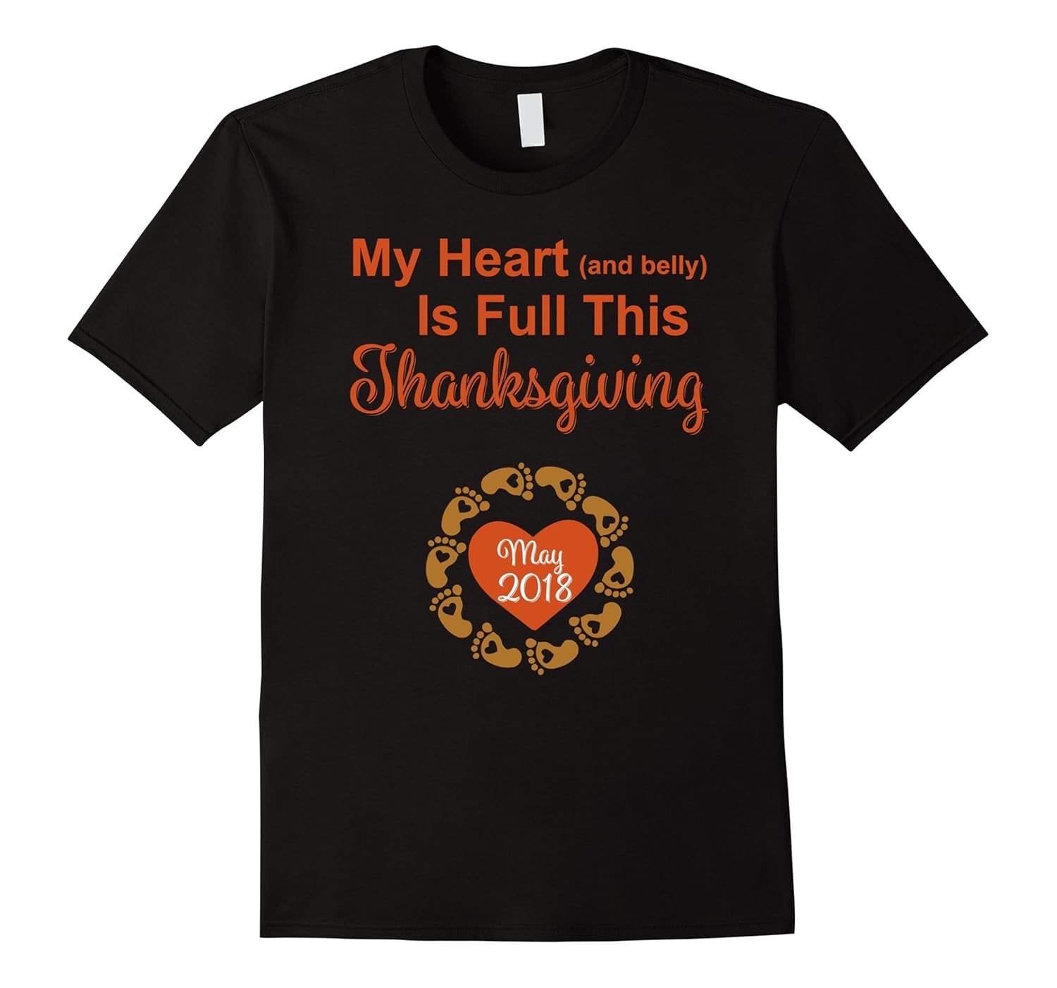 Solid colors: 100% Cotton; Heather Grey: 90% Cotton, 10% Polyester; All Other Heathers: 65% Cotton, 35% Polyester, Imported, Machine wash cold with like colors, dry low heat, Funny 2017 Thanksgiving pregnancy shirt with baby footprints for the new mom to be. Cute way to reveal you are pregnant and expecting a baby in May 2018. My heart (and belly) is full this Thanksgiving May 2018. Perfect tshirt for a Thanksgiving pregnancy announcement. Unique keepsake for your child too. Lightweight, Classic fit, Double-needle sleeve and bottom hem